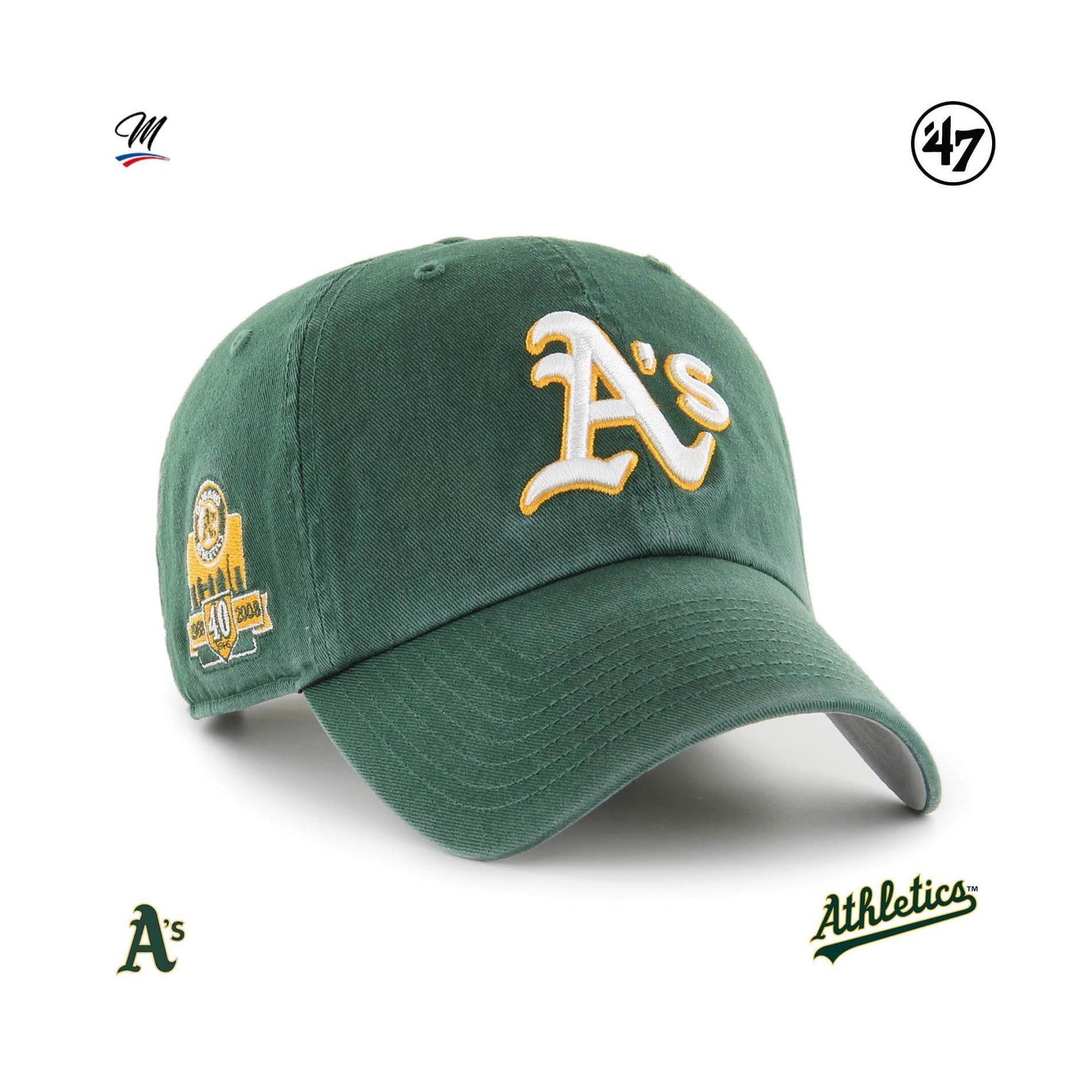 Oakland Athletics '47 Cooperstown Double Under"Clean Up" Cap är en trendig basebollkeps i 100% bomull med en mjuk, böjd och avslappnad passform, präglat broderi fram, broderat 40-årsjubileum på höger sida, '47-broderi på vänster sida