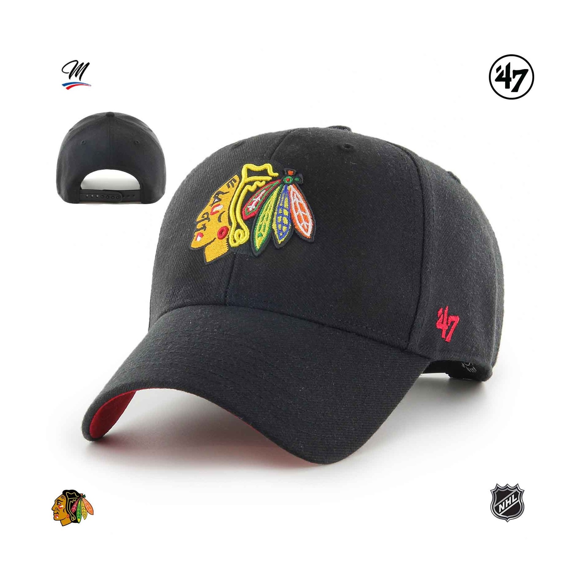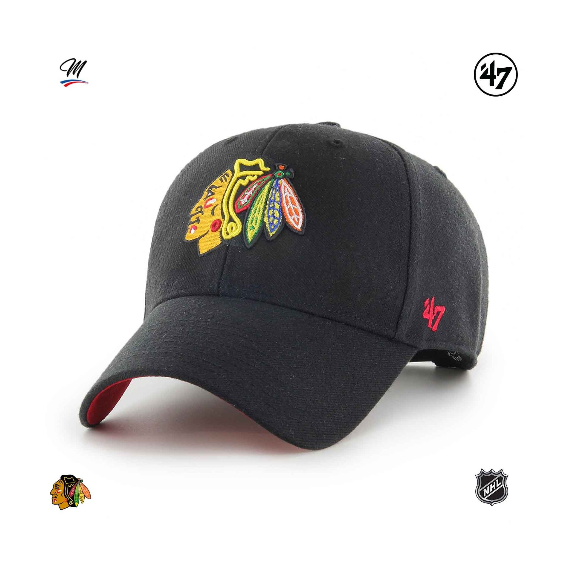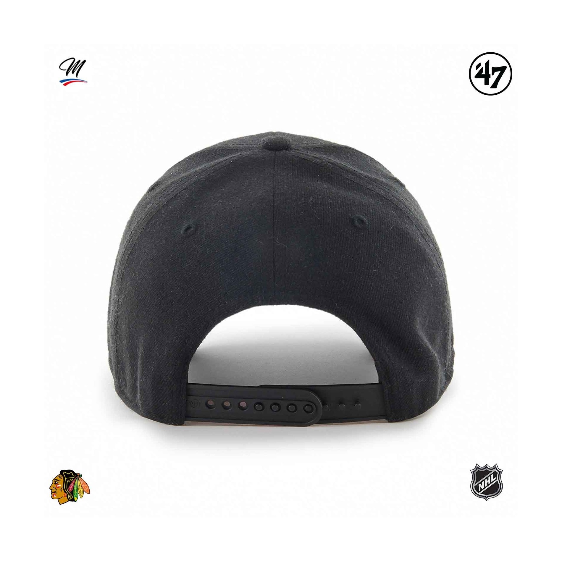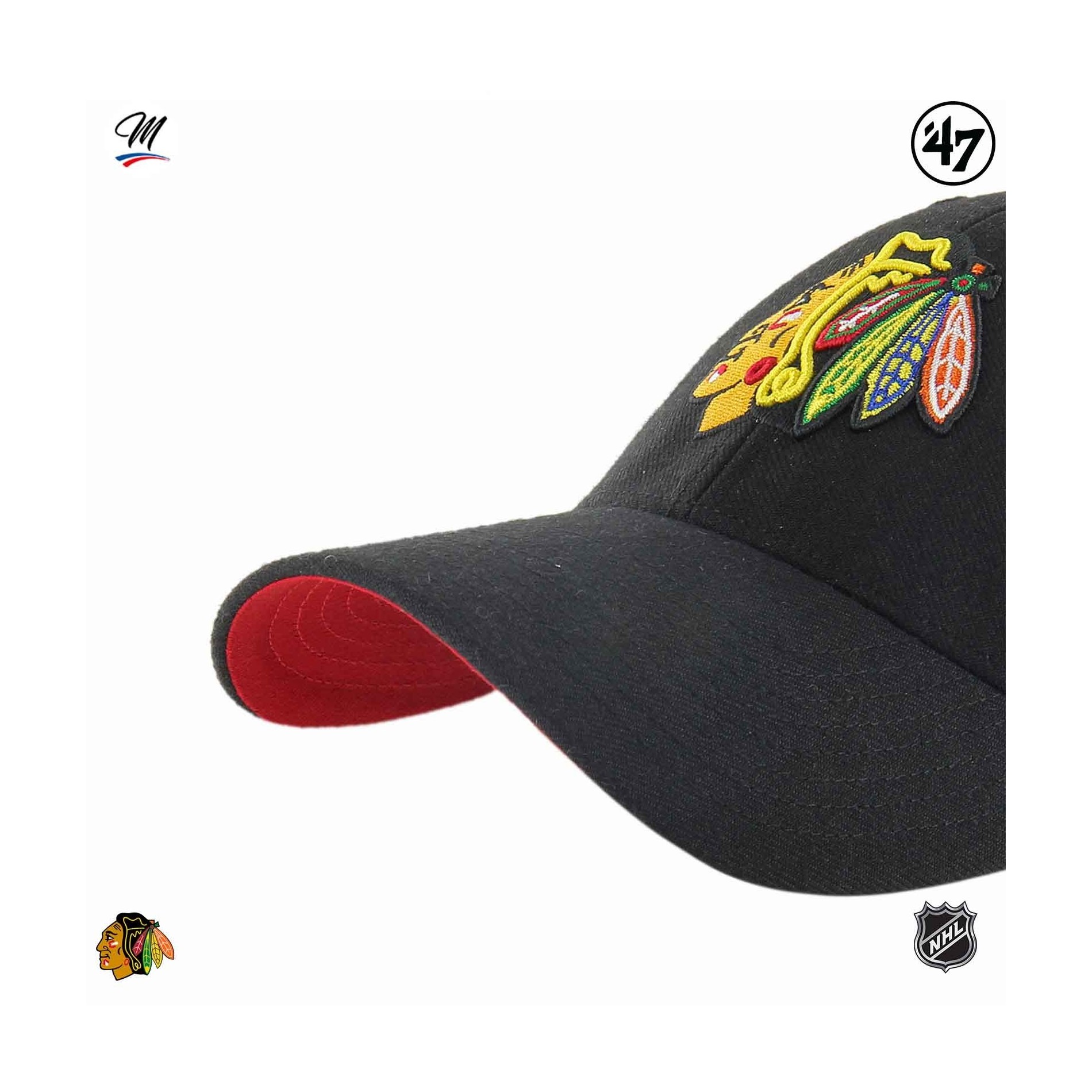 Chicago Blackhawks Ballpark Snap MVP"-keps '47 är en strukturerad, böjd hockeykeps med upphöjt broderi på framsidan och '47-broderi på sidan.