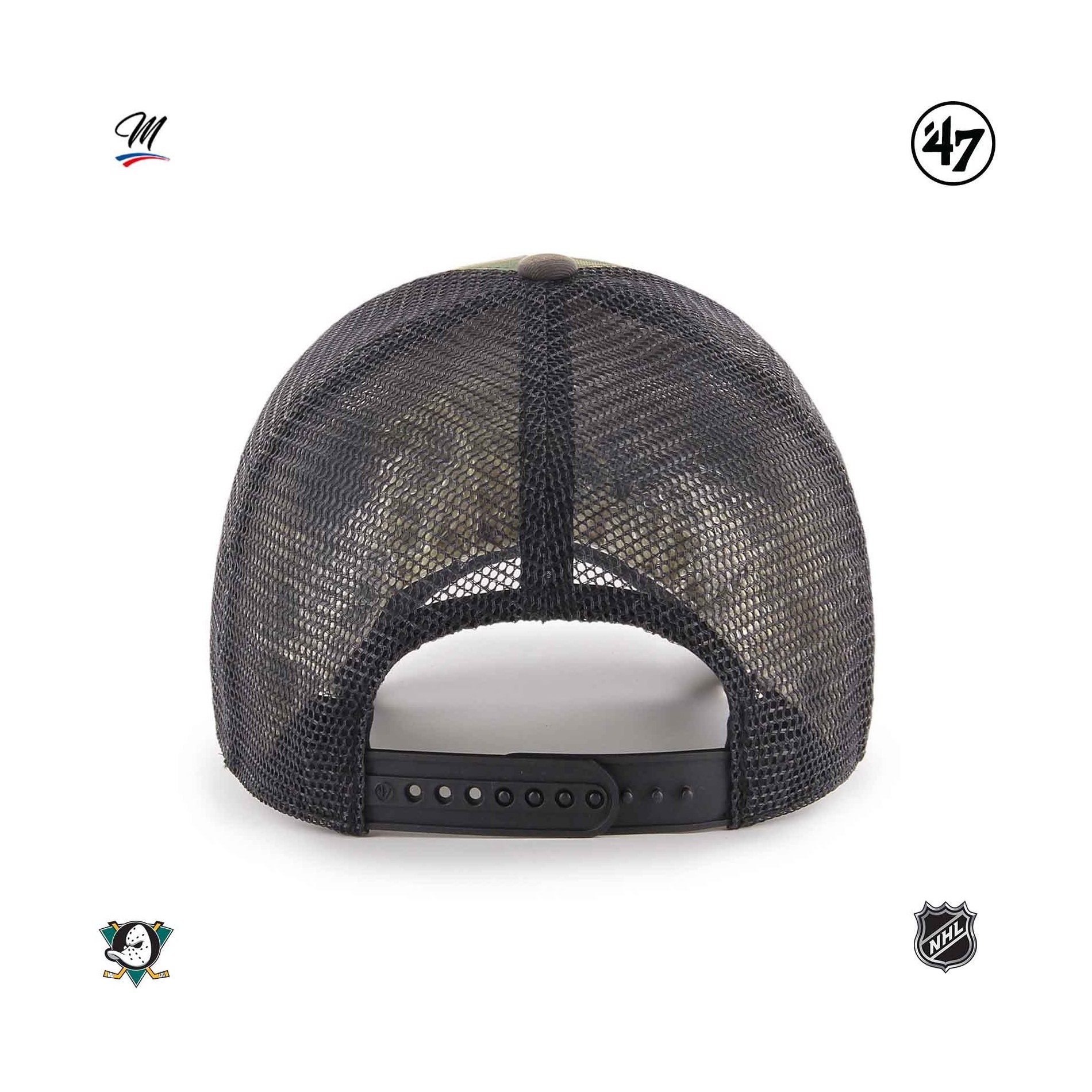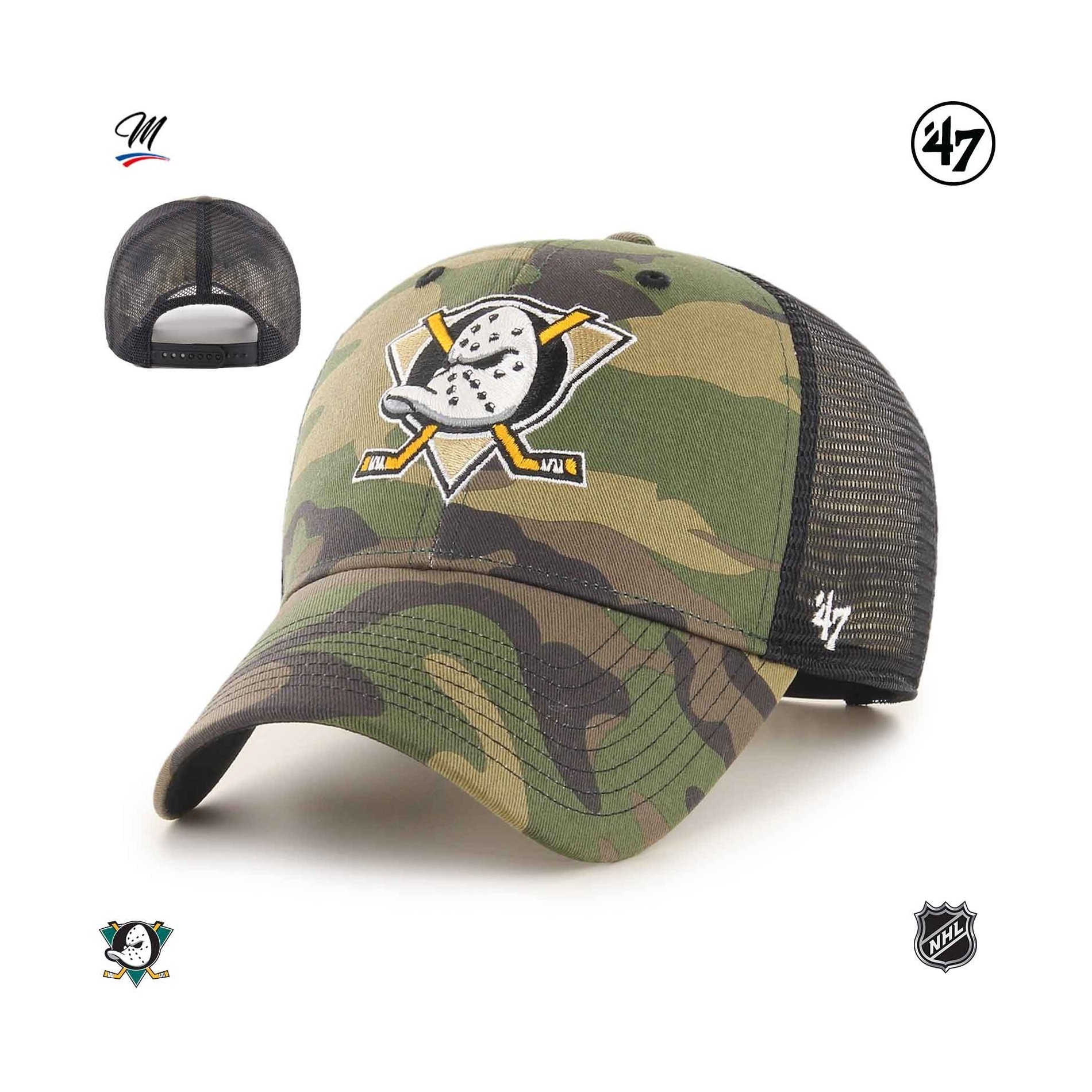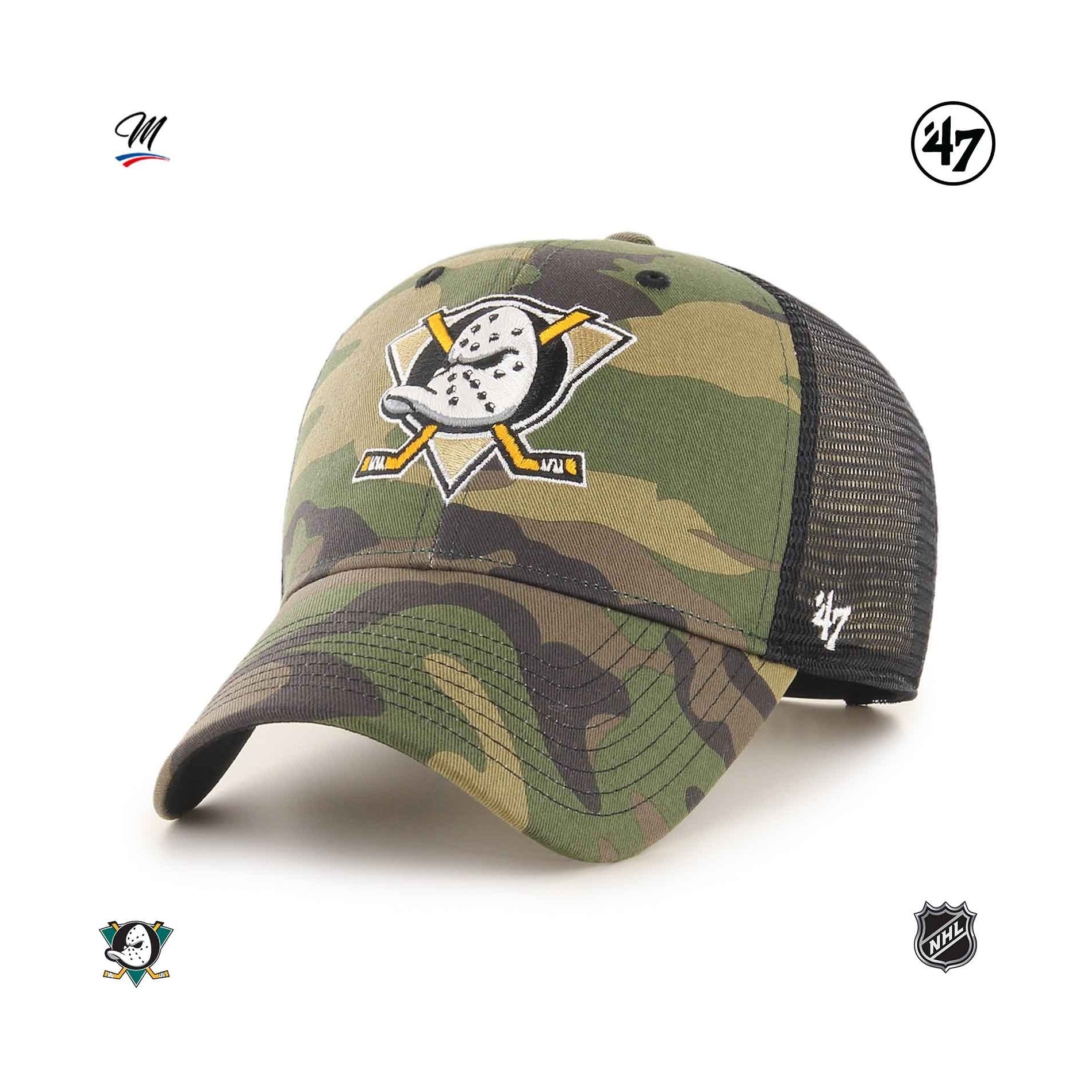 NHL Branson Camo '47 MVP Anaheim Ducks keps är en kamouflagefärgad Trucker Hockey-keps, strukturerad och böjd, med upphöjt broderi på framsidan och '47-broderi på sidan.