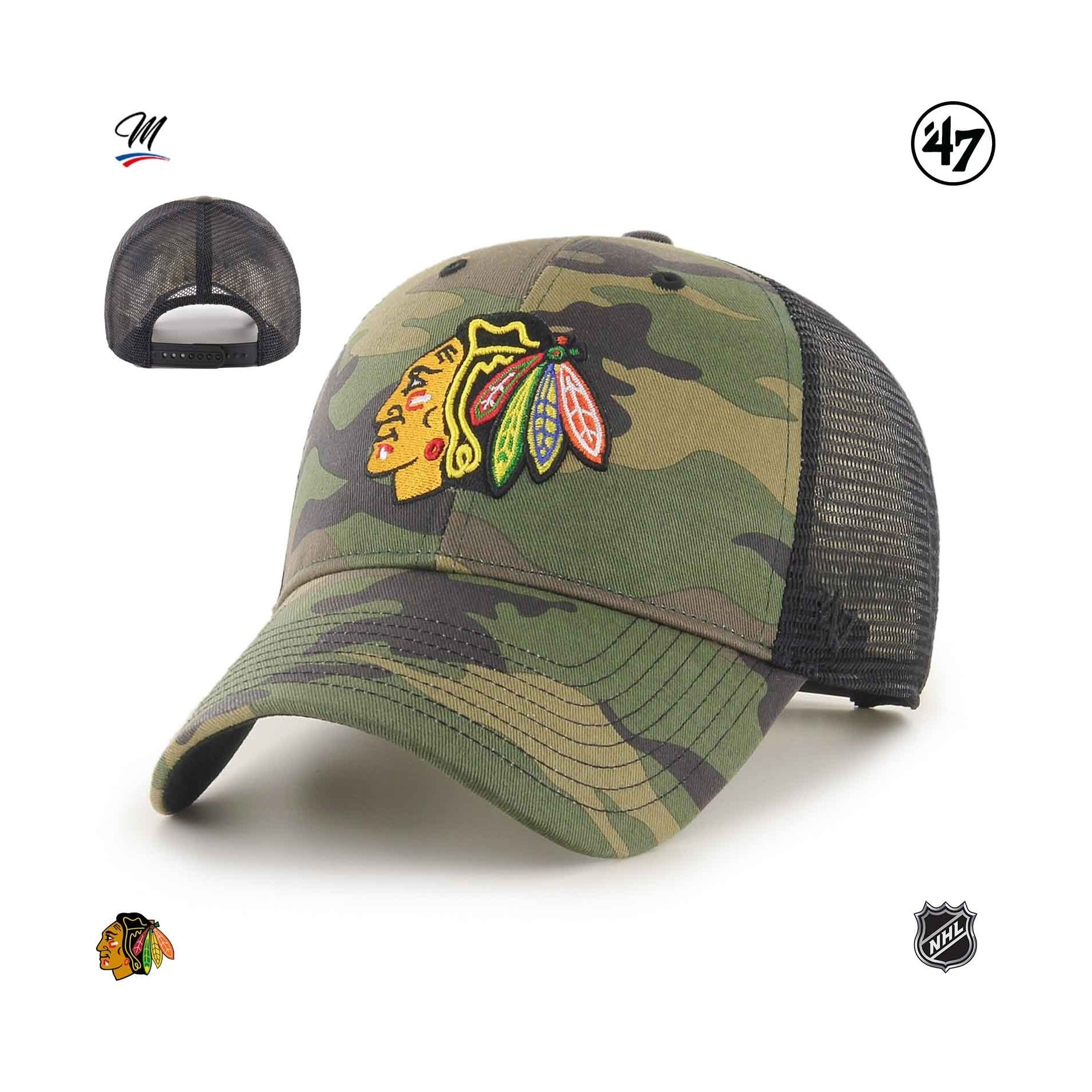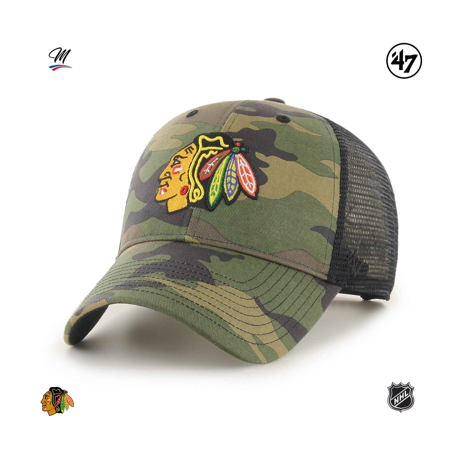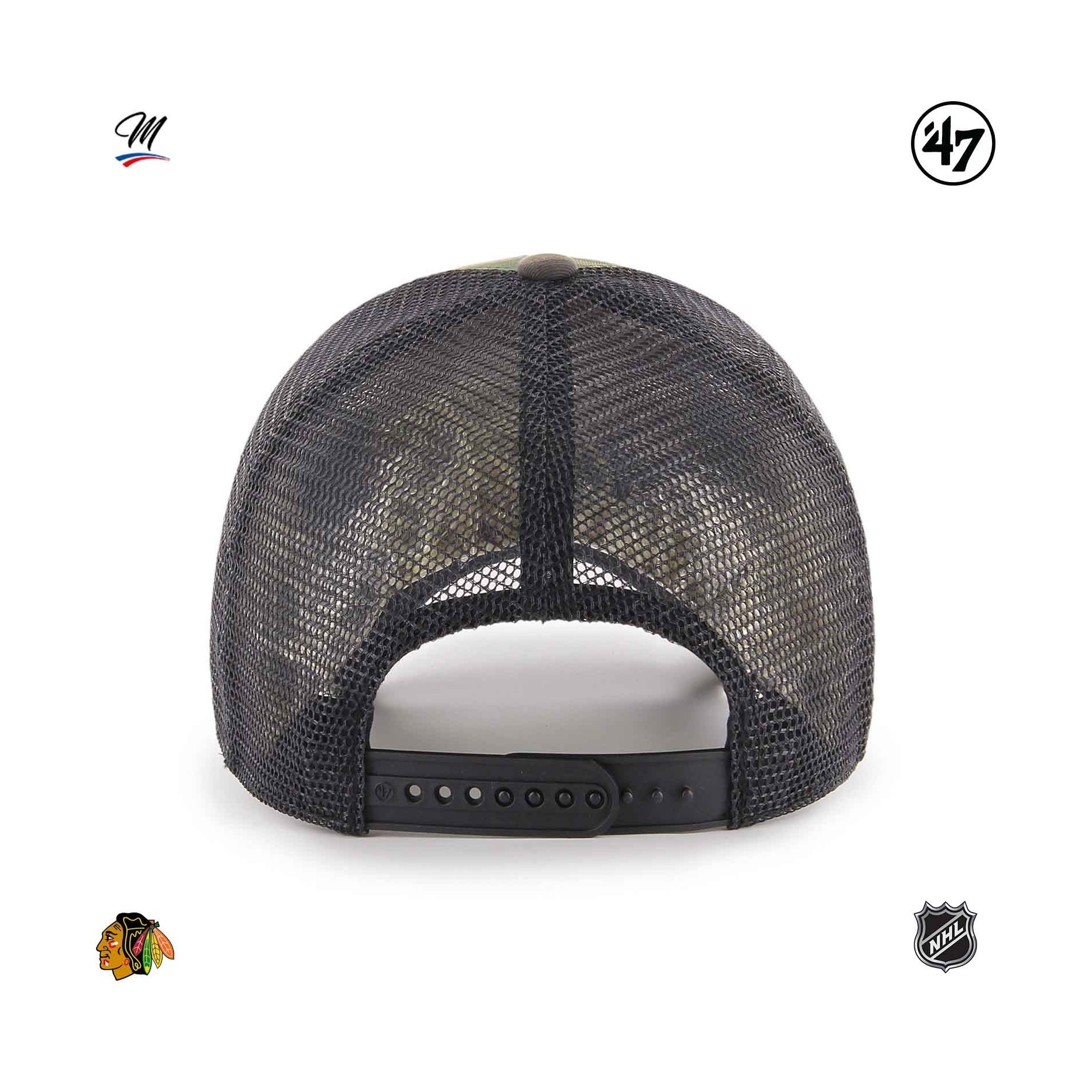 NHL Branson Camo '47 MVP Chicago Blackhawks är en kamouflagefärgad truckerhockeykeps med struktur och böjning, med upphöjt broderi fram och '47-broderi på sidan.