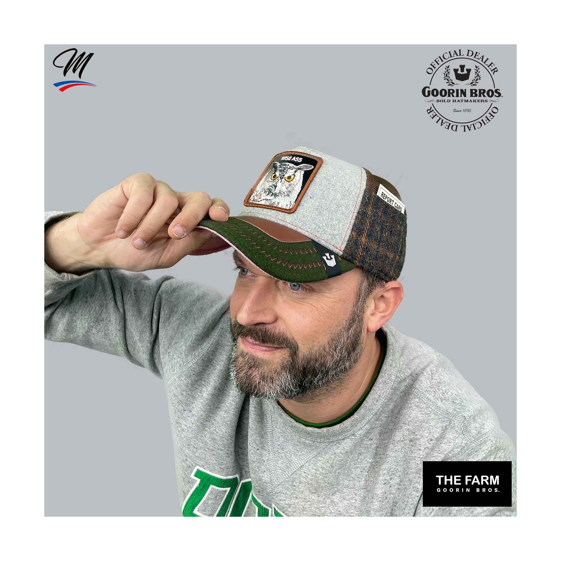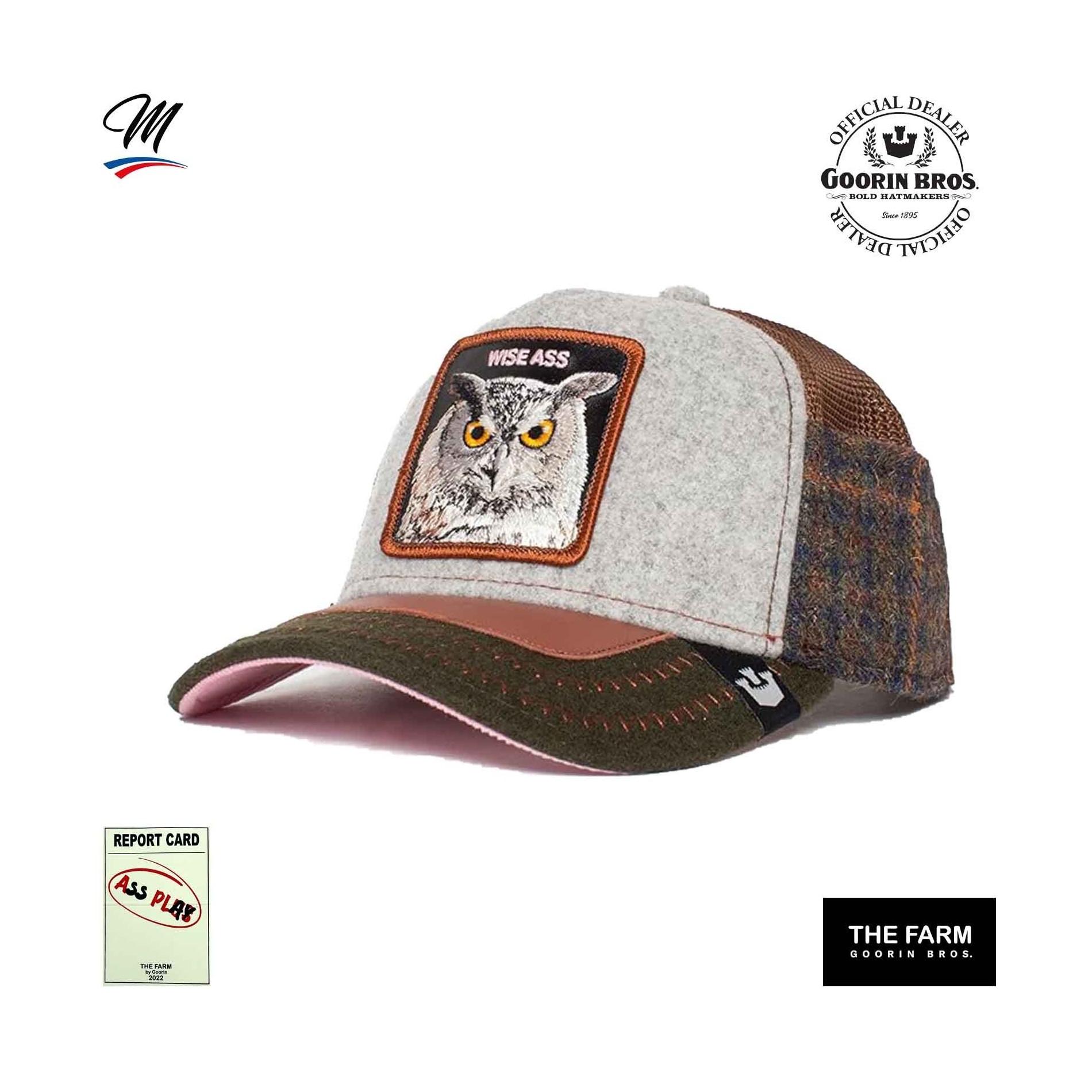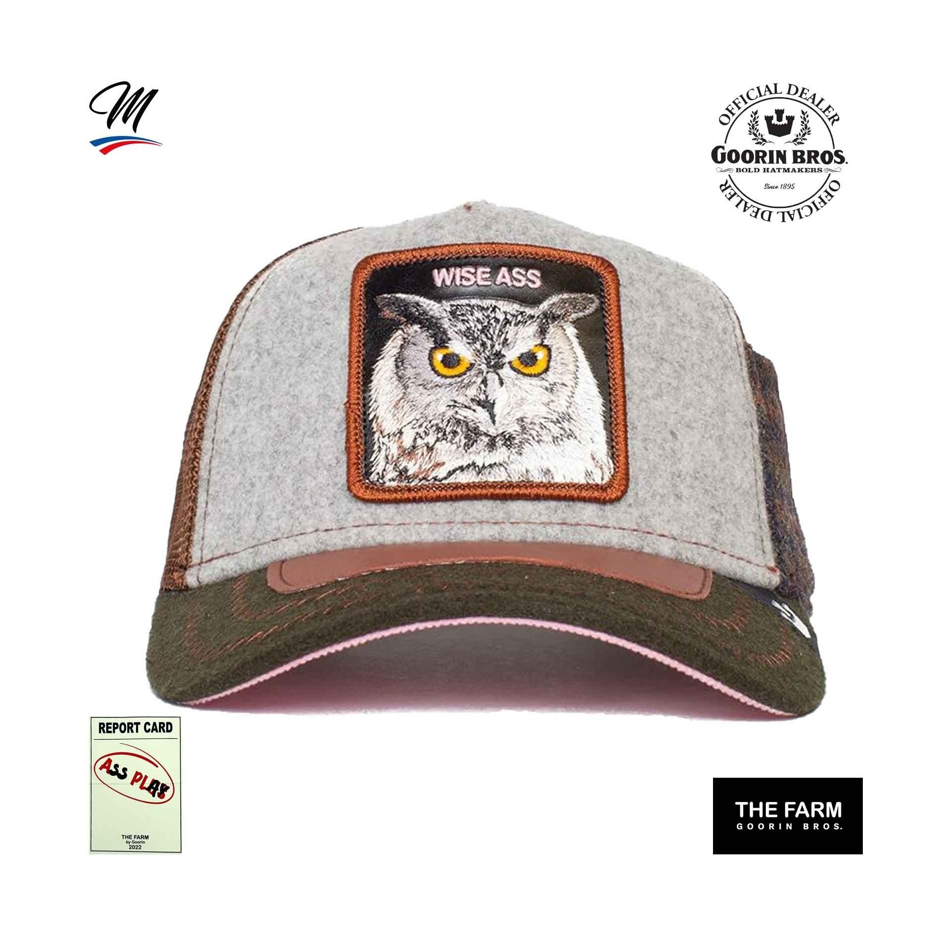 Äkta GOORIN BROS Baseball Truckerkepsmed mesh, broderad HIBOU patch och"WISE ASS" inskription.