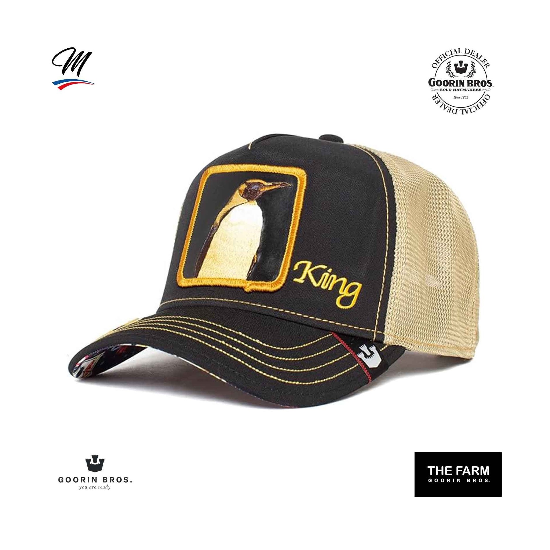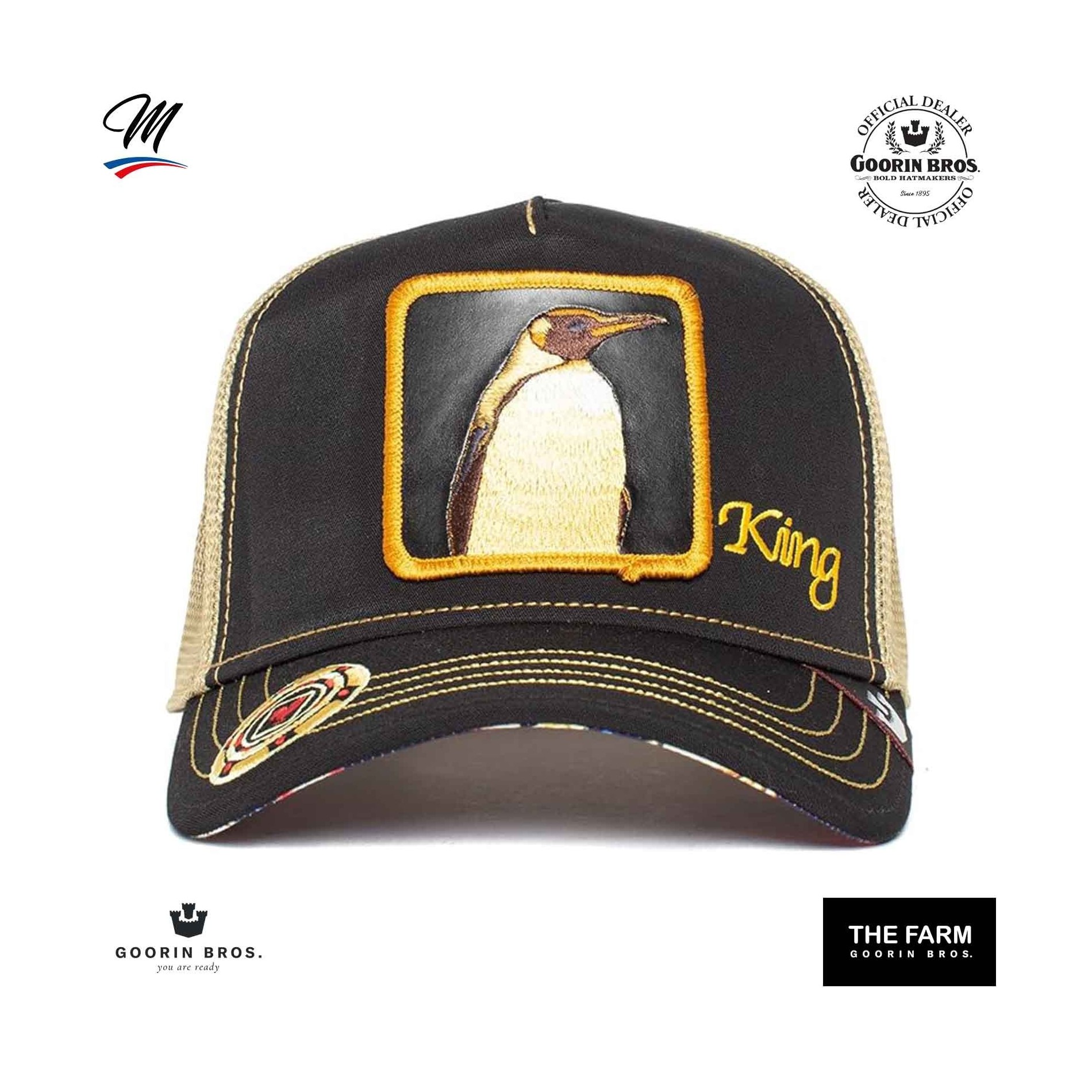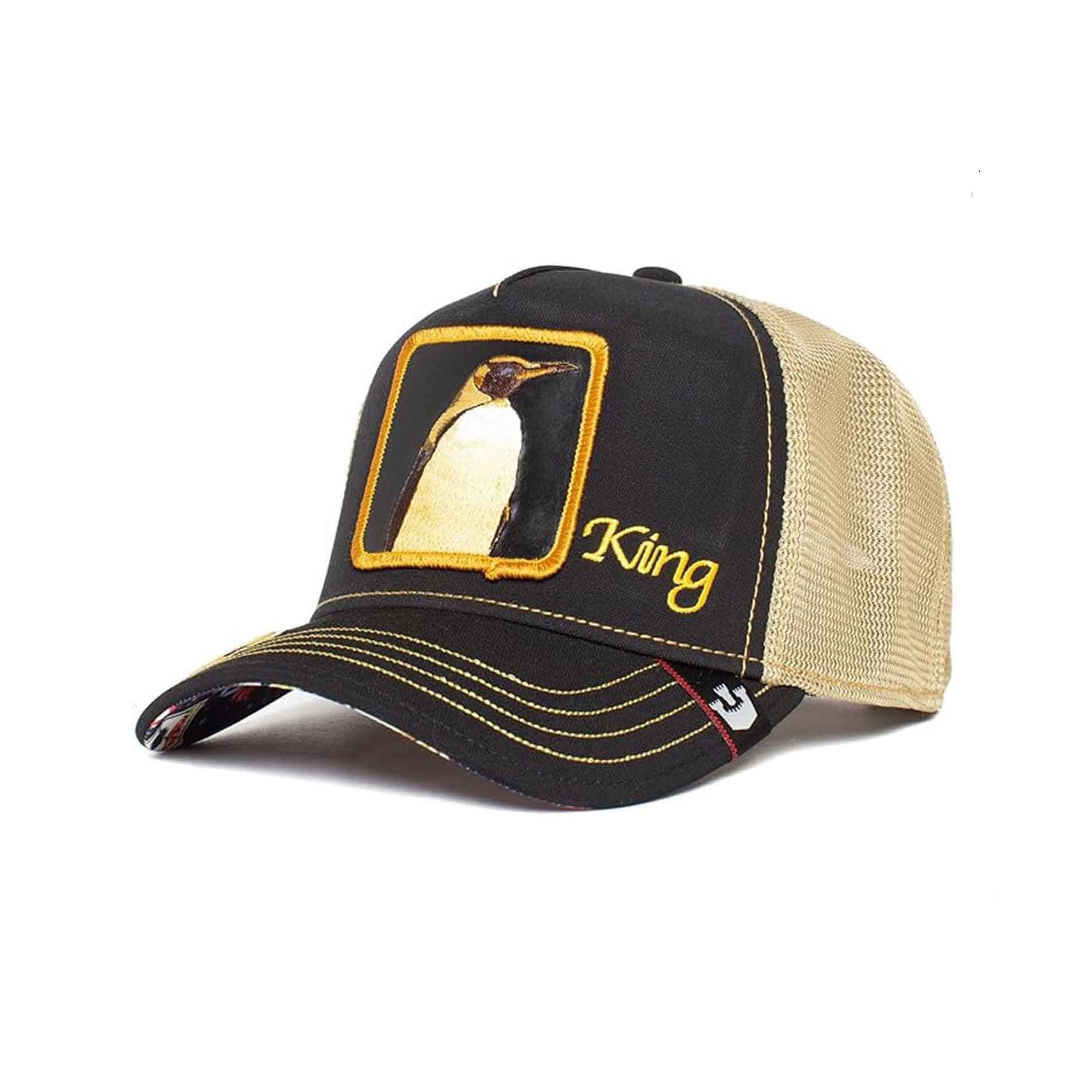 Äkta GOORIN BROS keps, Baseball Trucker med nät, broderad patch av en pingvin med inskriptionen "KING".