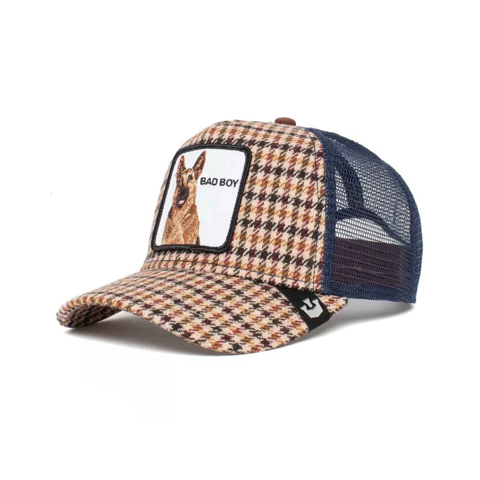 Autentisk GOORIN BROS Baseball Trucker keps med mesh, broderad patch av en tysk herde med inskriptionen "BAD BOY".