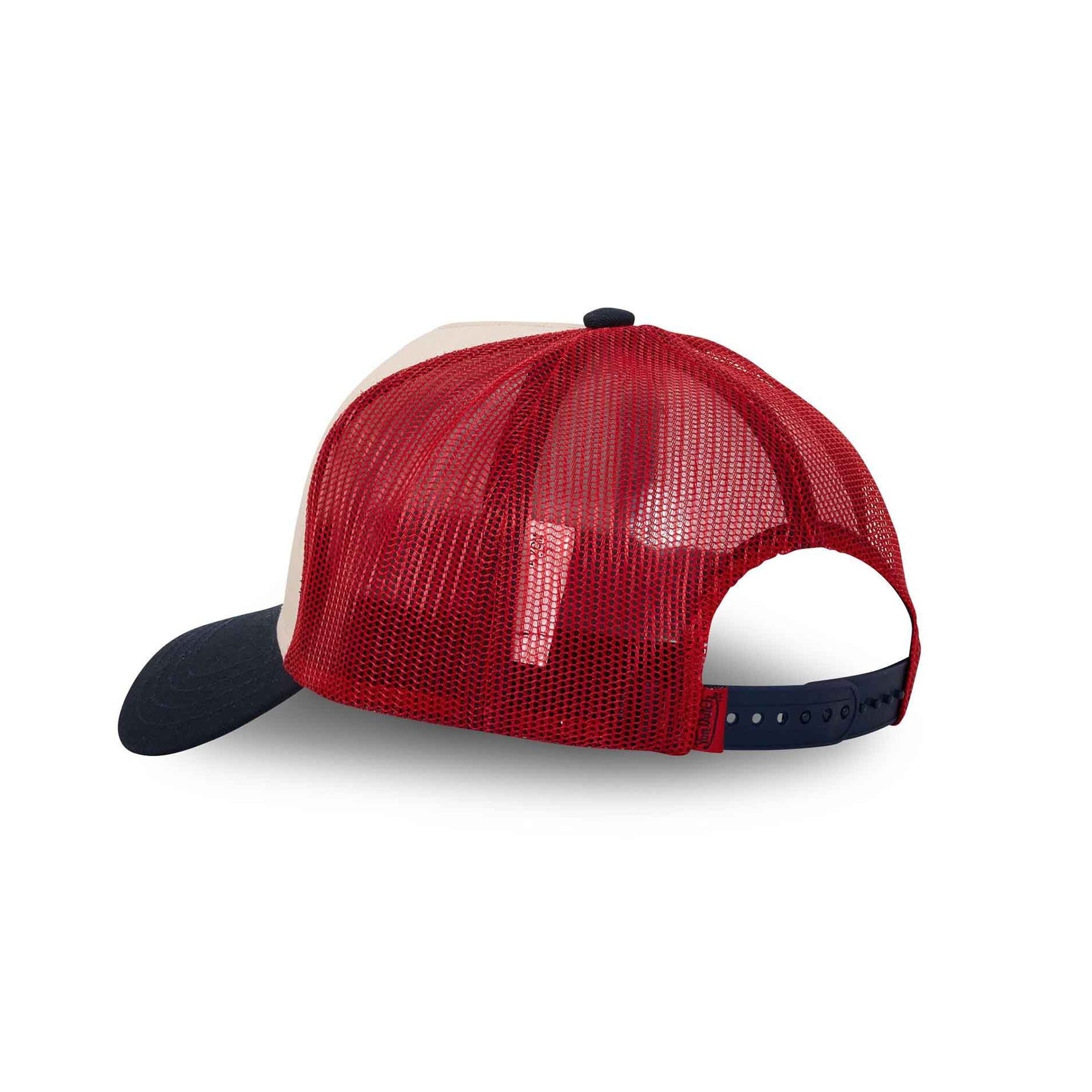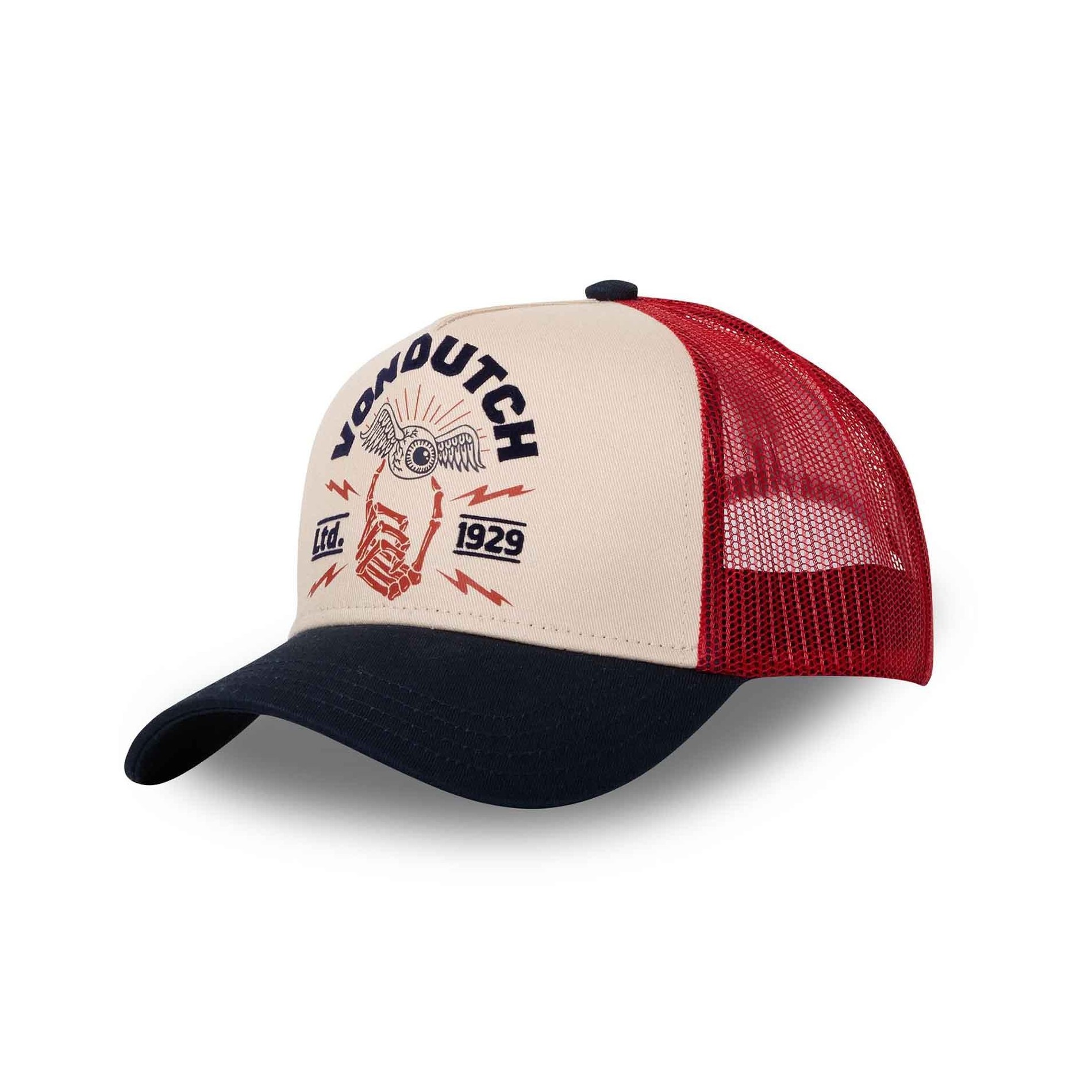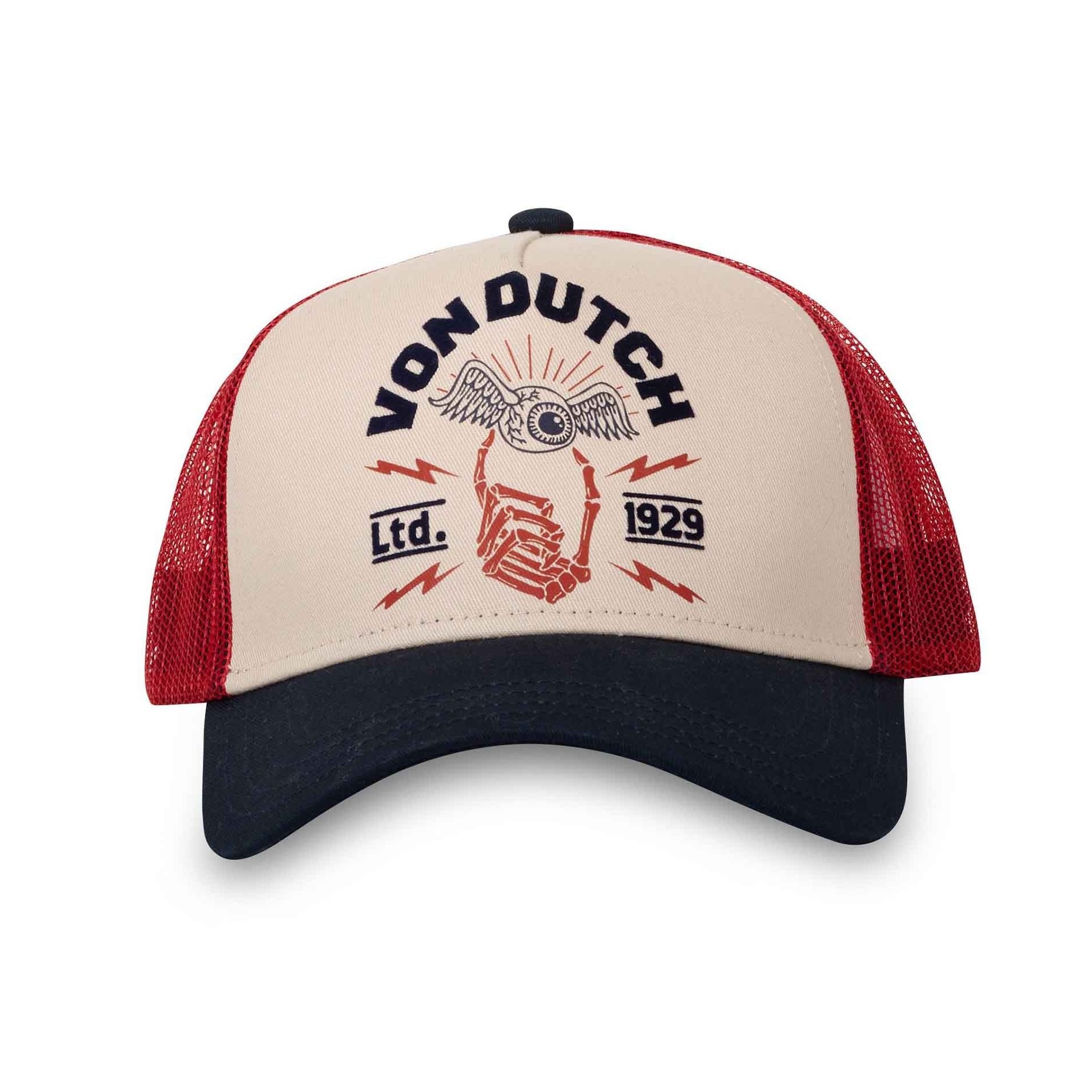 Keps från Von Dutch, Grab The Eye collection, Keps för män eller kvinnor med en beige bas och en skeletthand som tar tag i det bevingade ögat på Von Dutch och ett rött nät. 50% Bomull, 50% Polyester. Justerbar snapback