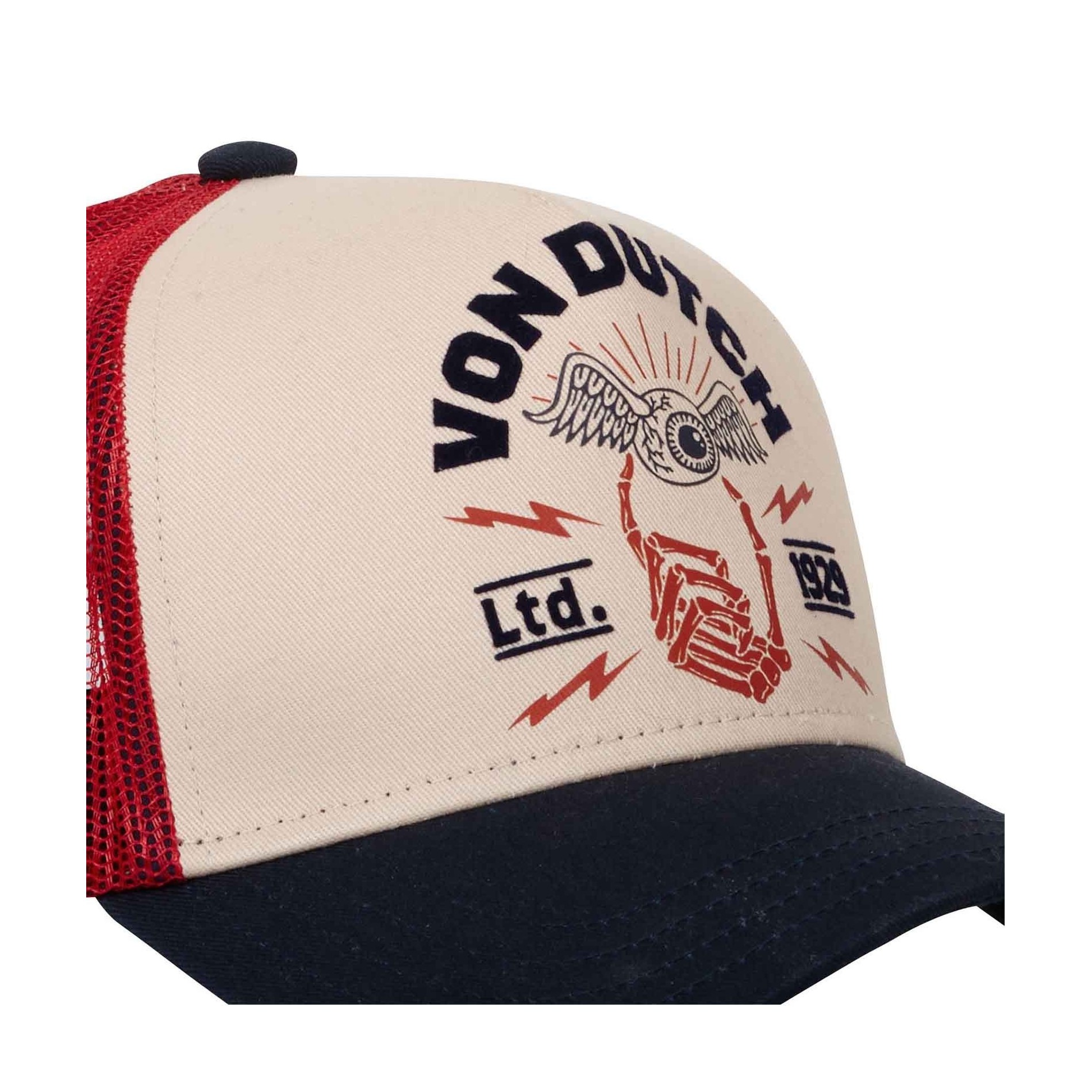 Kepsen har en beige bas och är flockad med en skeletthand som griper tag i Von Dutch:s bevingade öga och ett rött nät.