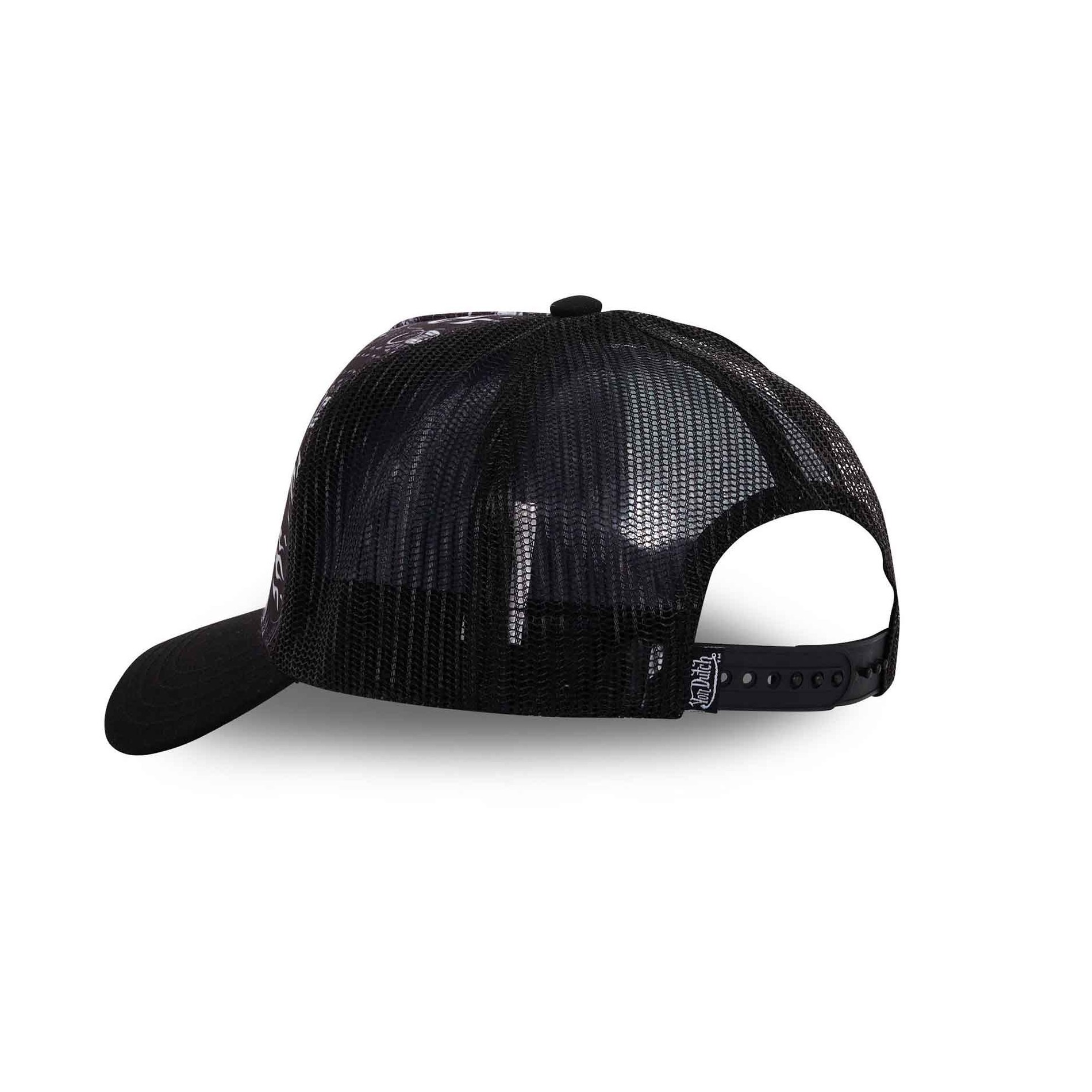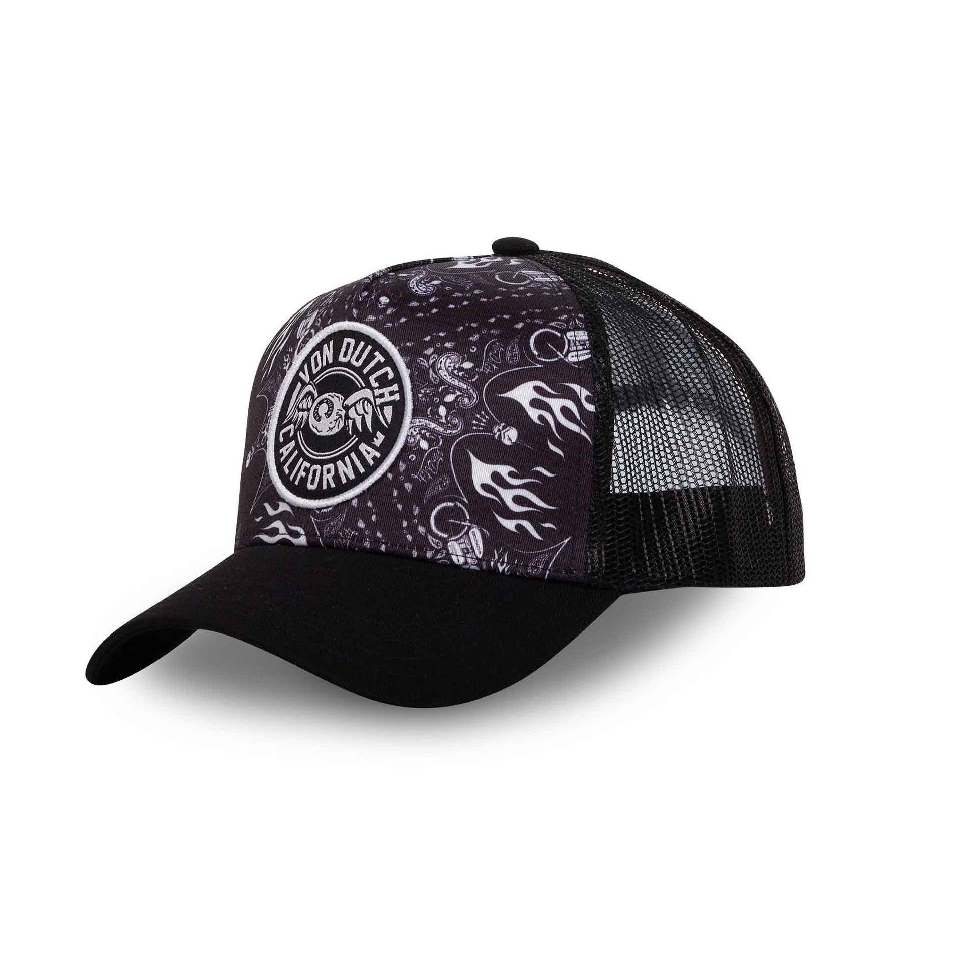 Denna keps är i original med VON DUTCH CALIFORNIA-patch broderad i mitten av en bandana fresco och har ett nät baktill.
