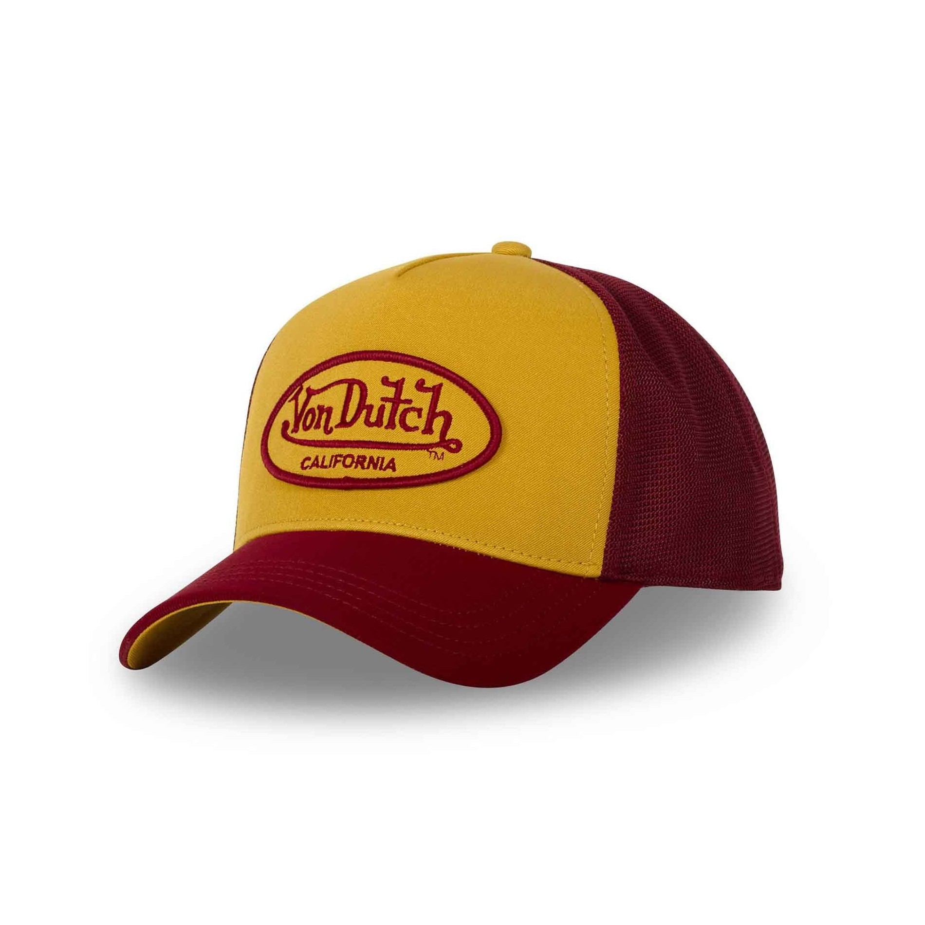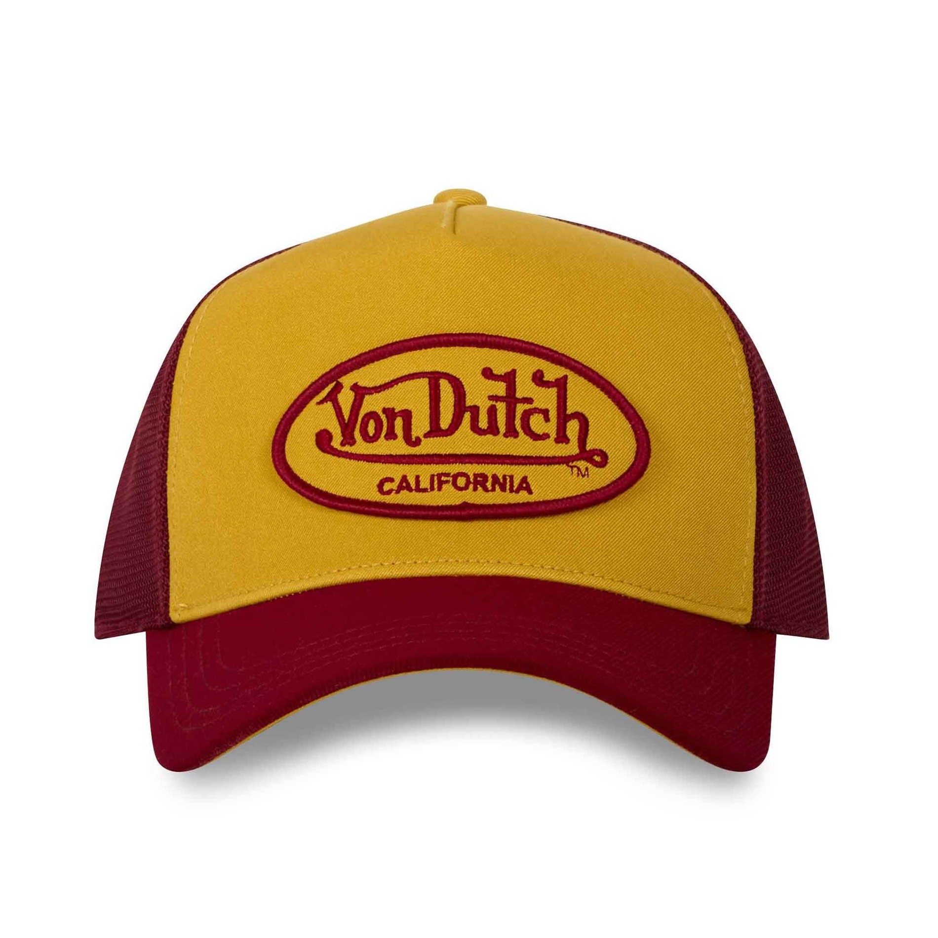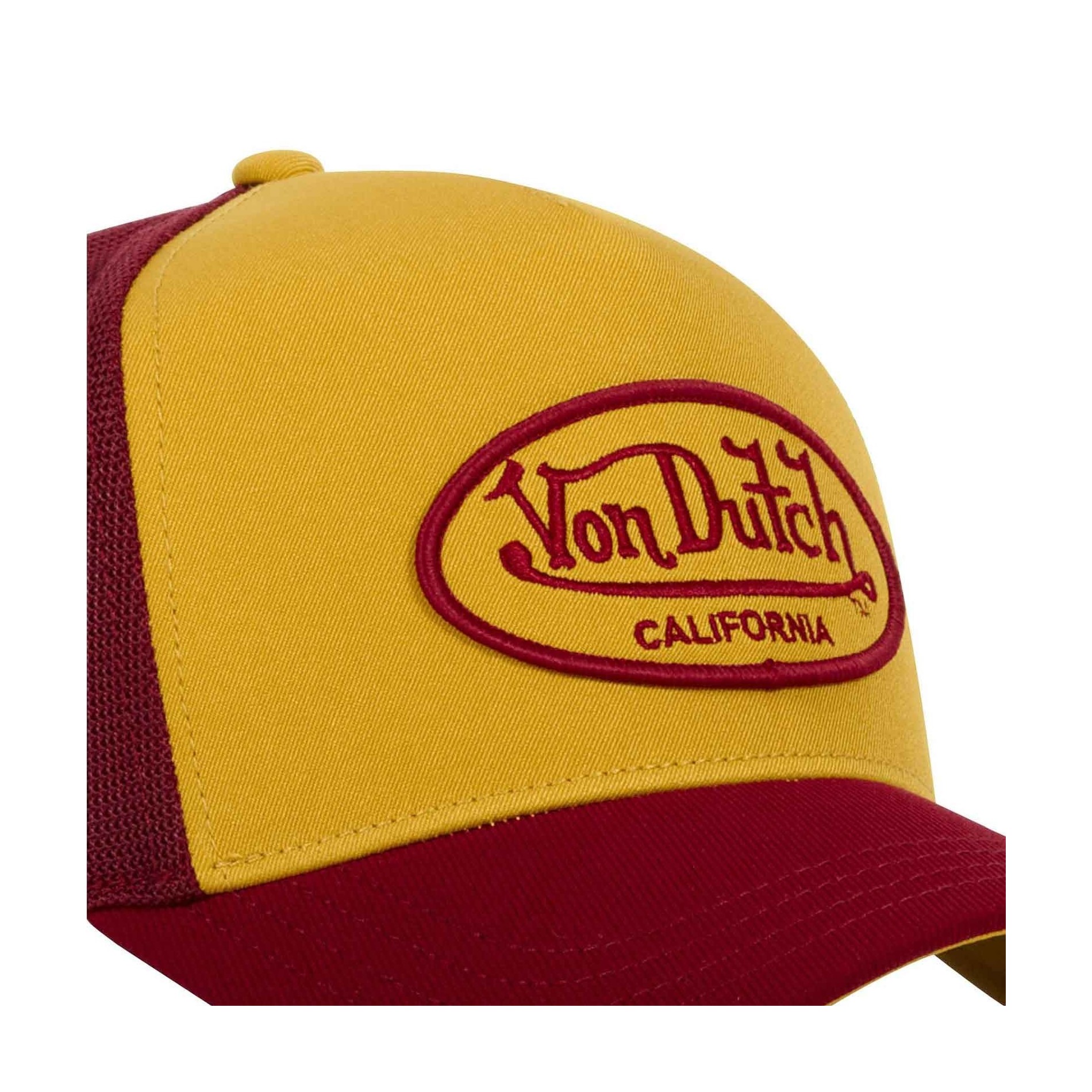 Broderad "VON DUTCH"-lapp med kontur och skrift som kontrasterar mot kepsens färg.