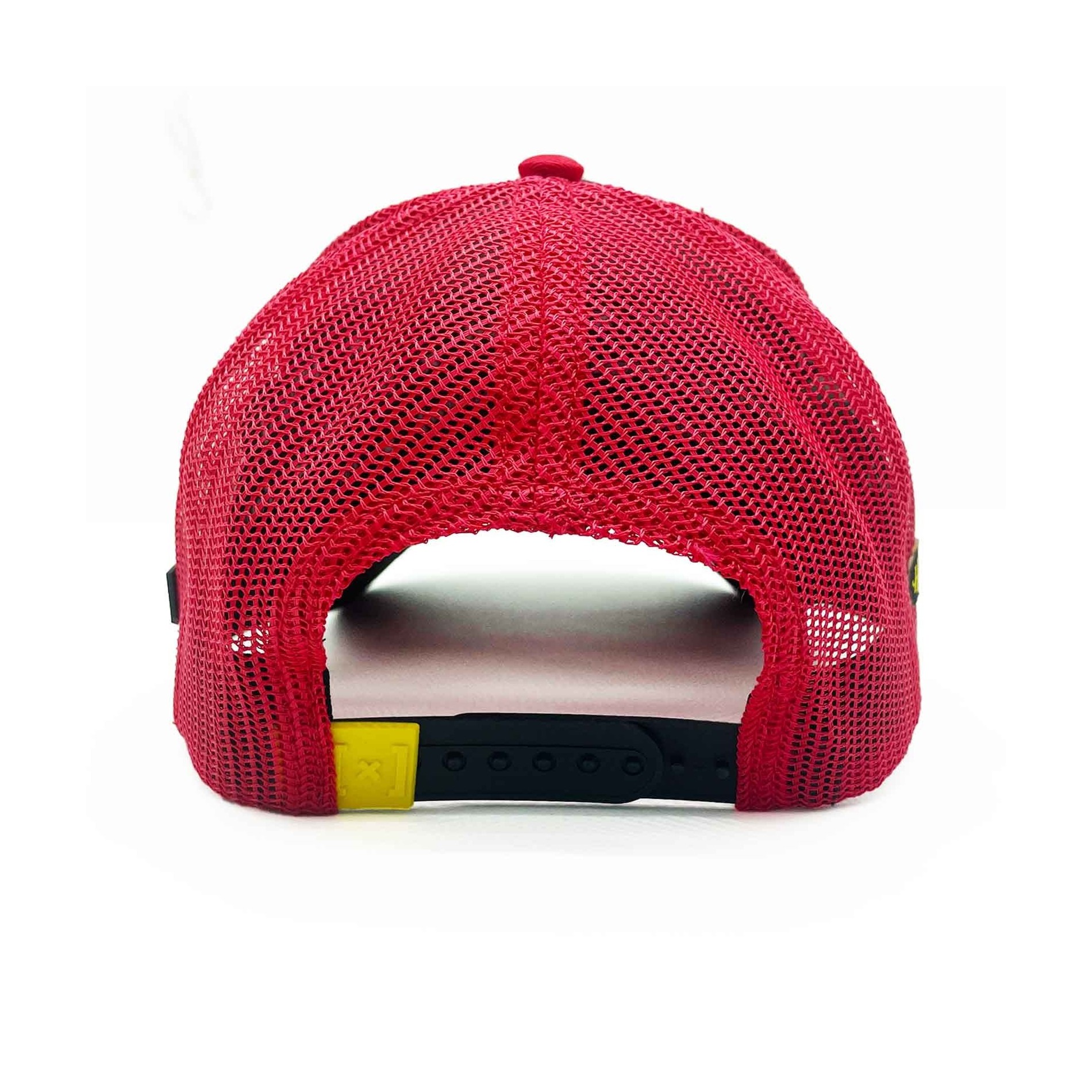 Böjd skärm. Rött mesh-nät baktill.