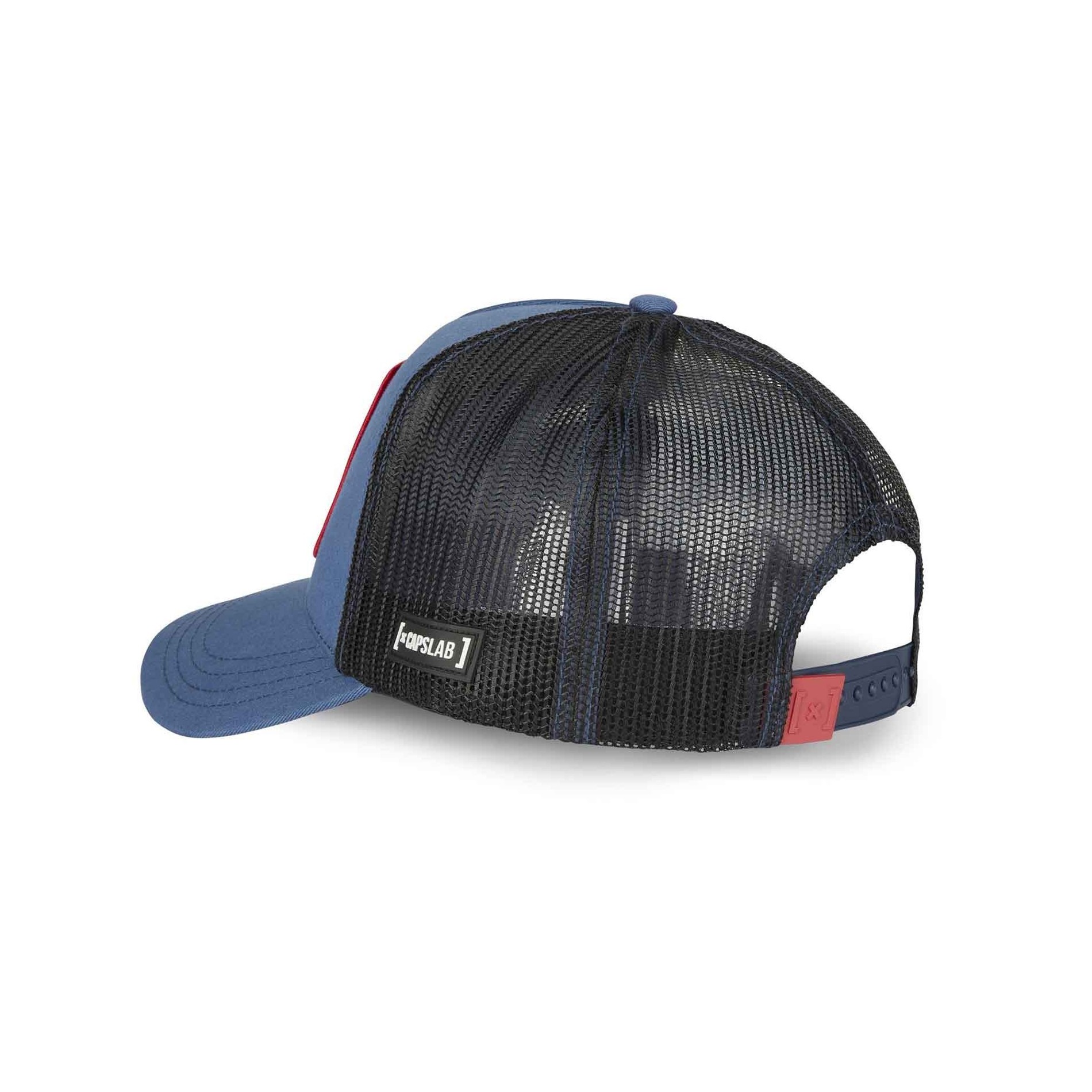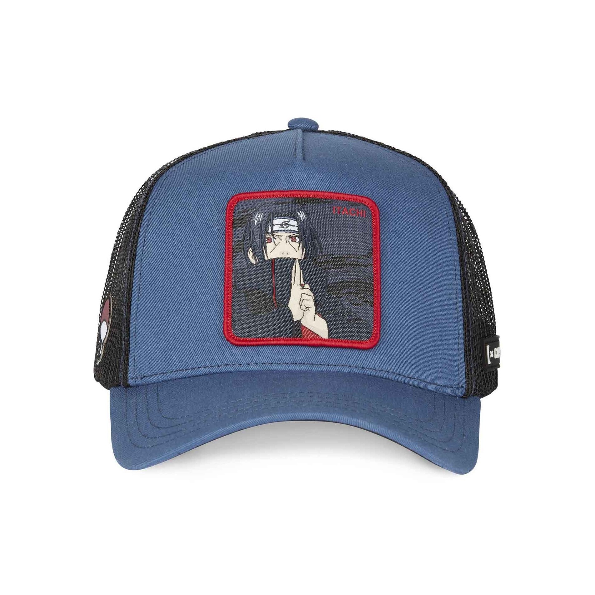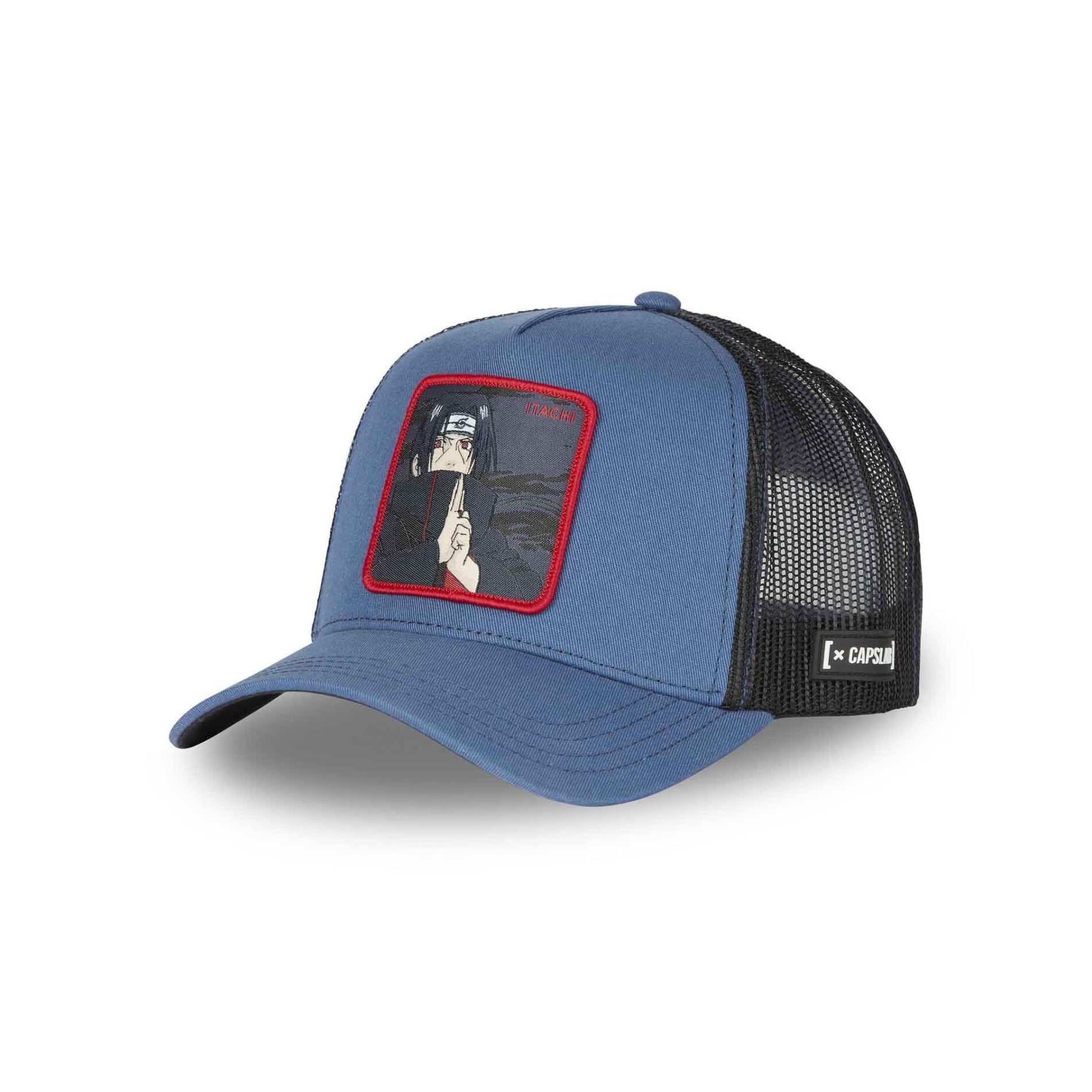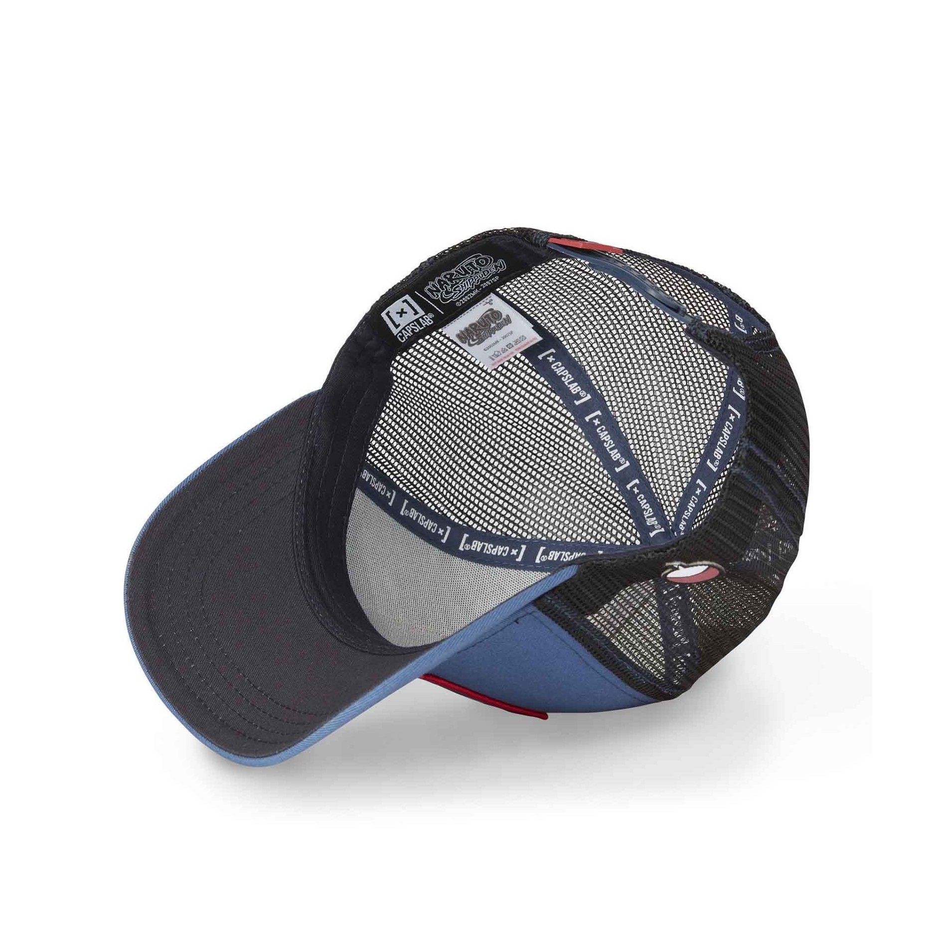 CAPSLAB Trucker Naruto Shippûden "Itachi Uchiwa" keps med officiell Naruto-licens. Böjt visir och baksida i svart mesh med Snapback-justering. 50% bomull 50% polyester