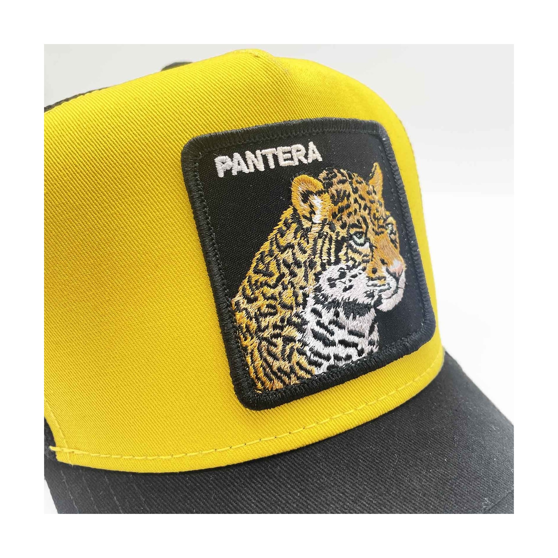 L eopardbroderad patch med"PANTERA"-inskription på framsidan, mjuk mesh på baksidan.