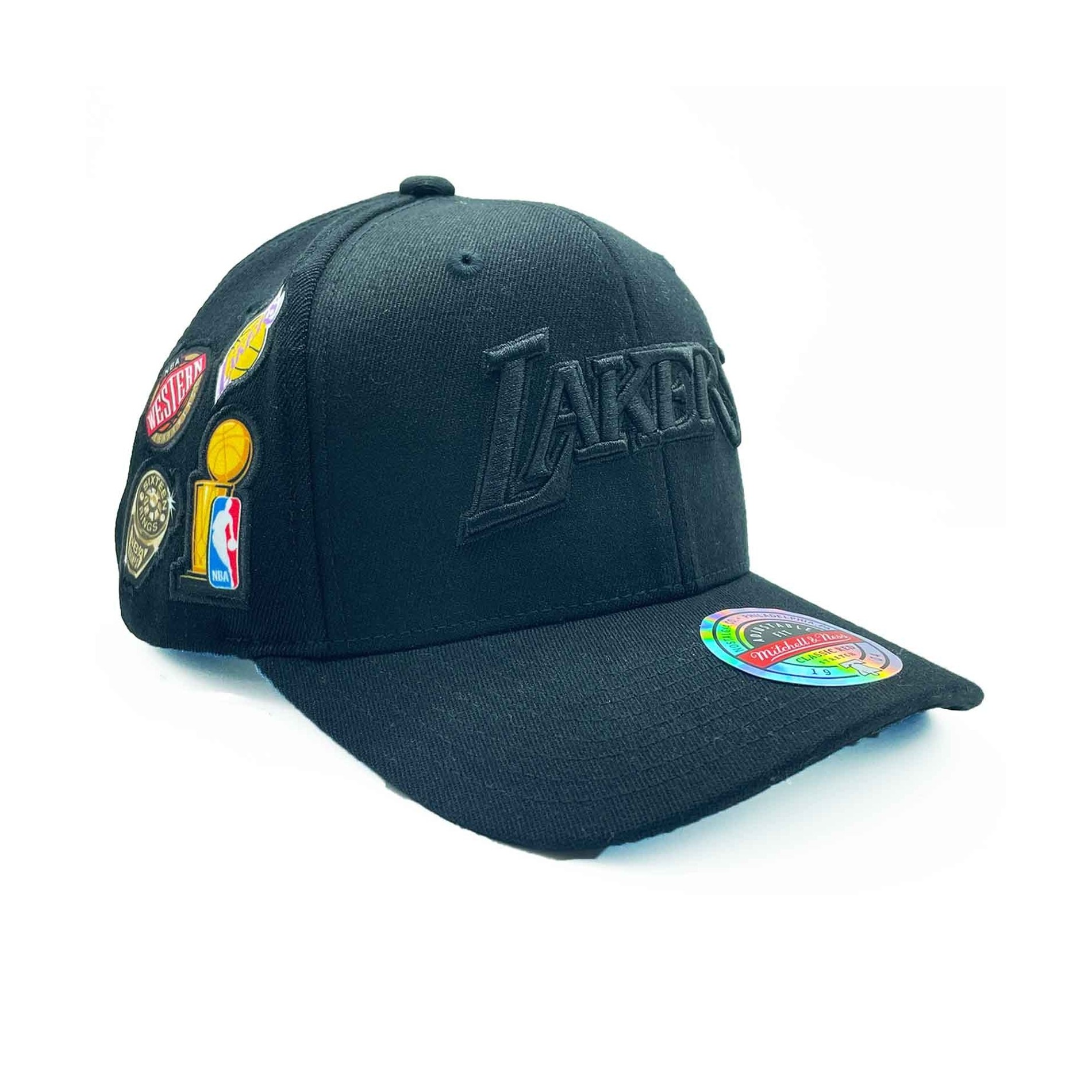 Mitchell & Ness - Los Angeles Lakers "Rings Snapback" NBA Snapback Keps. Champion Broderad Los Angeles Lakers-logotyp på framsidan, Western patch, NBA Finals och 16x ring på sidorna. Böjt visir. 87% akryl 10% ull 3% bomullsspandex. Snapback-justering baktill