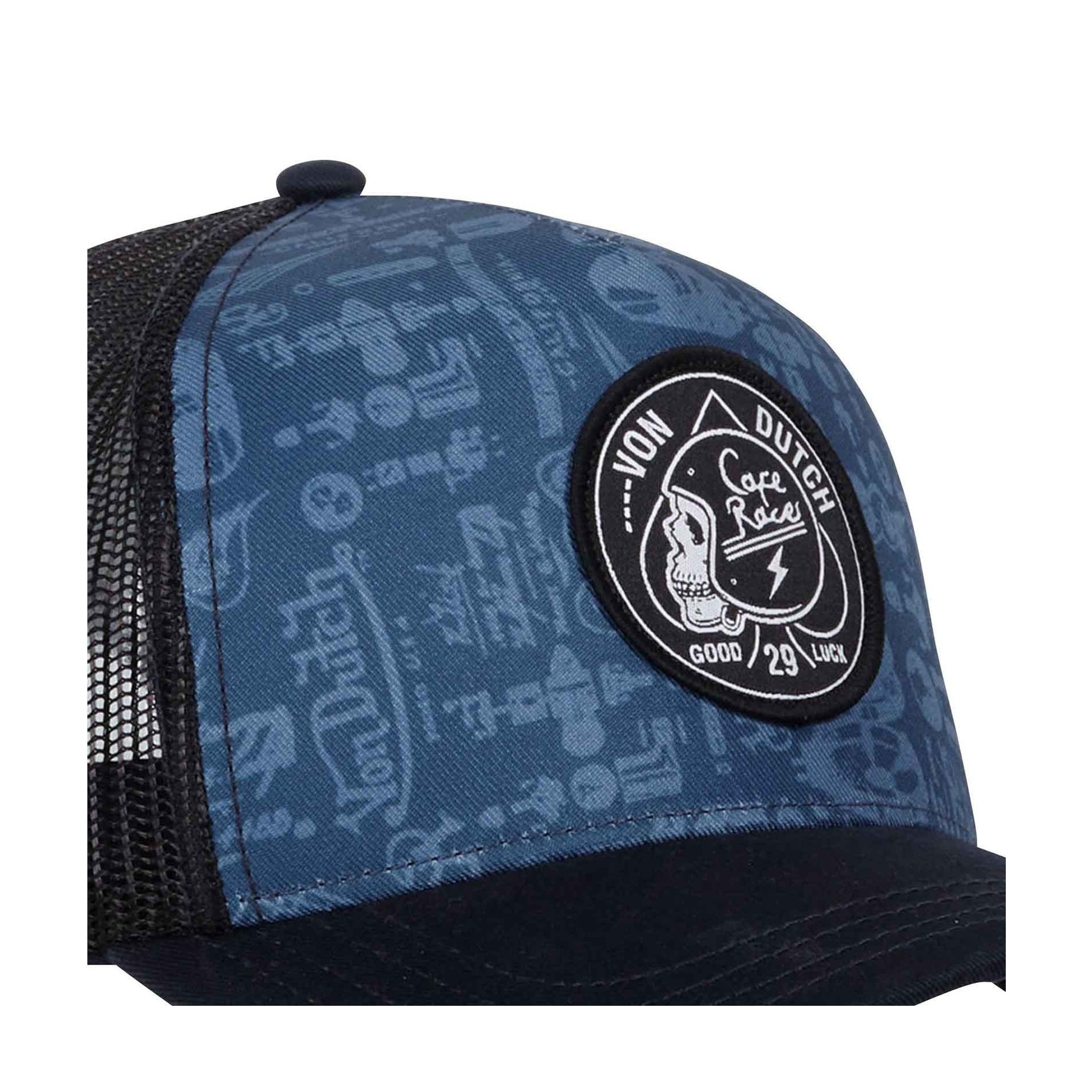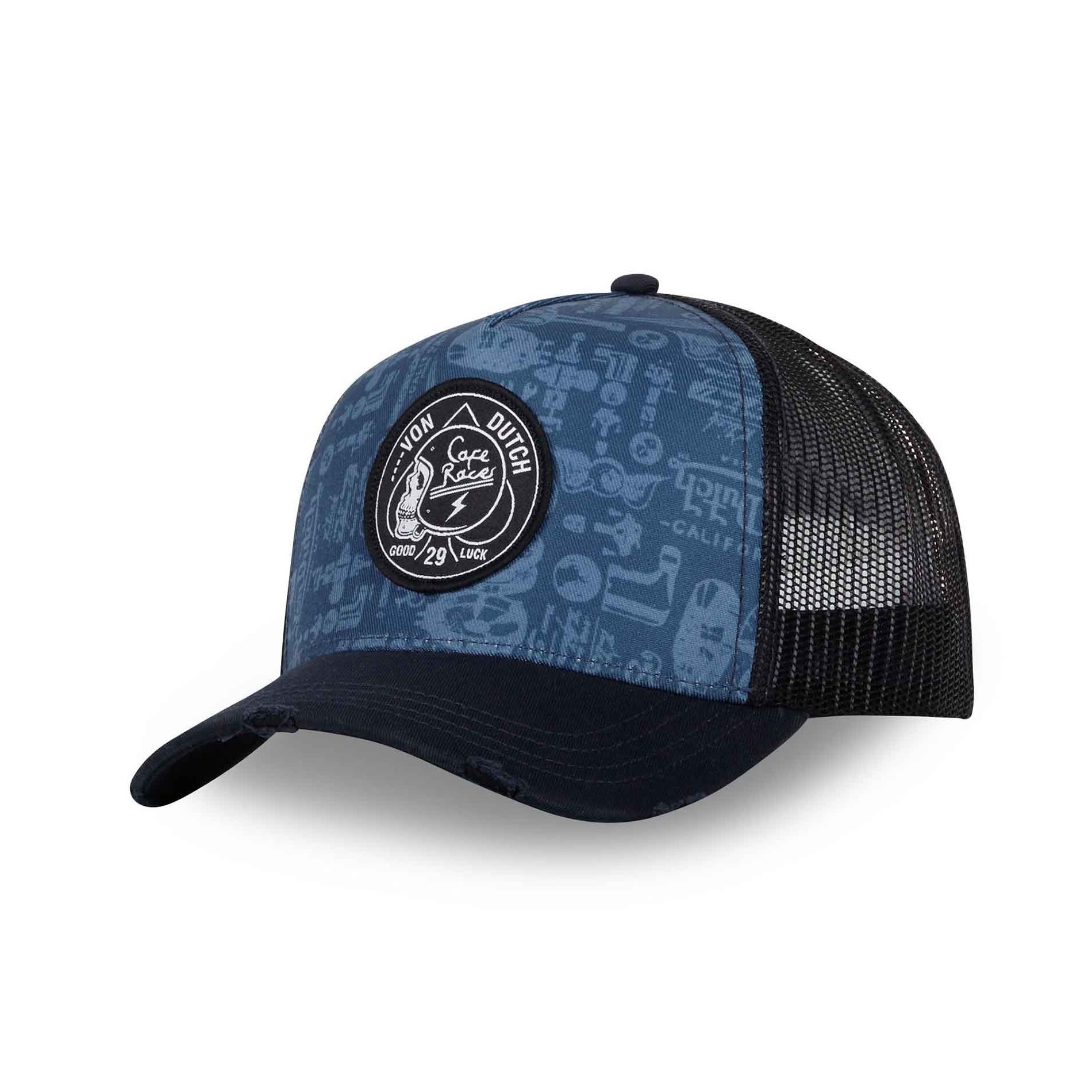 Von DutchKeps från , LOGOS-kollektionen. Truckerkeps för män eller kvinnor, blå, verktygsmotiv.Von Dutch Rund patch " " Skull and crossbones " Cafe Racer " motorcykelhjälm. sliten effekt på visiret Svart mesh. 60% Polyester 40% Bomull. Justerbar snapback
