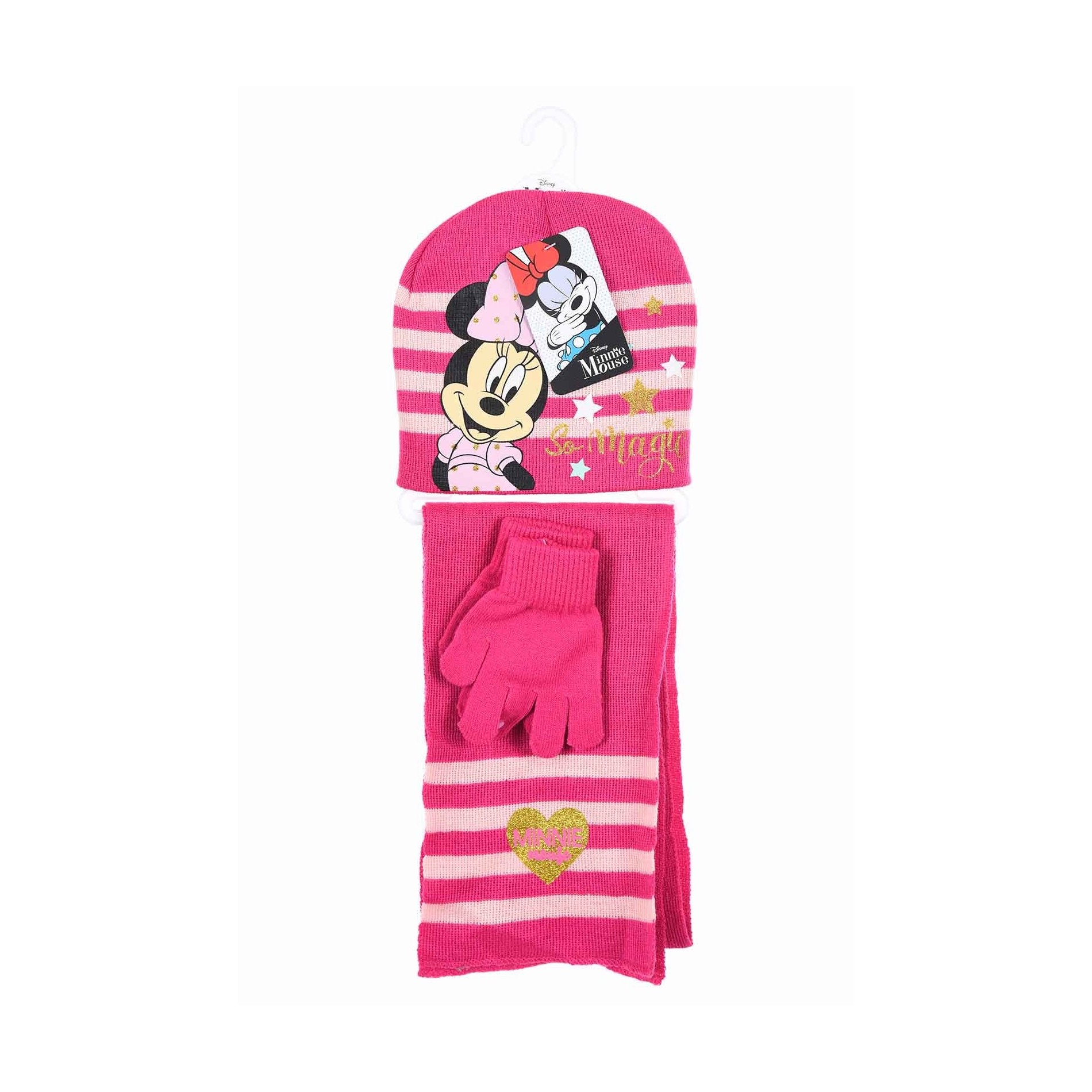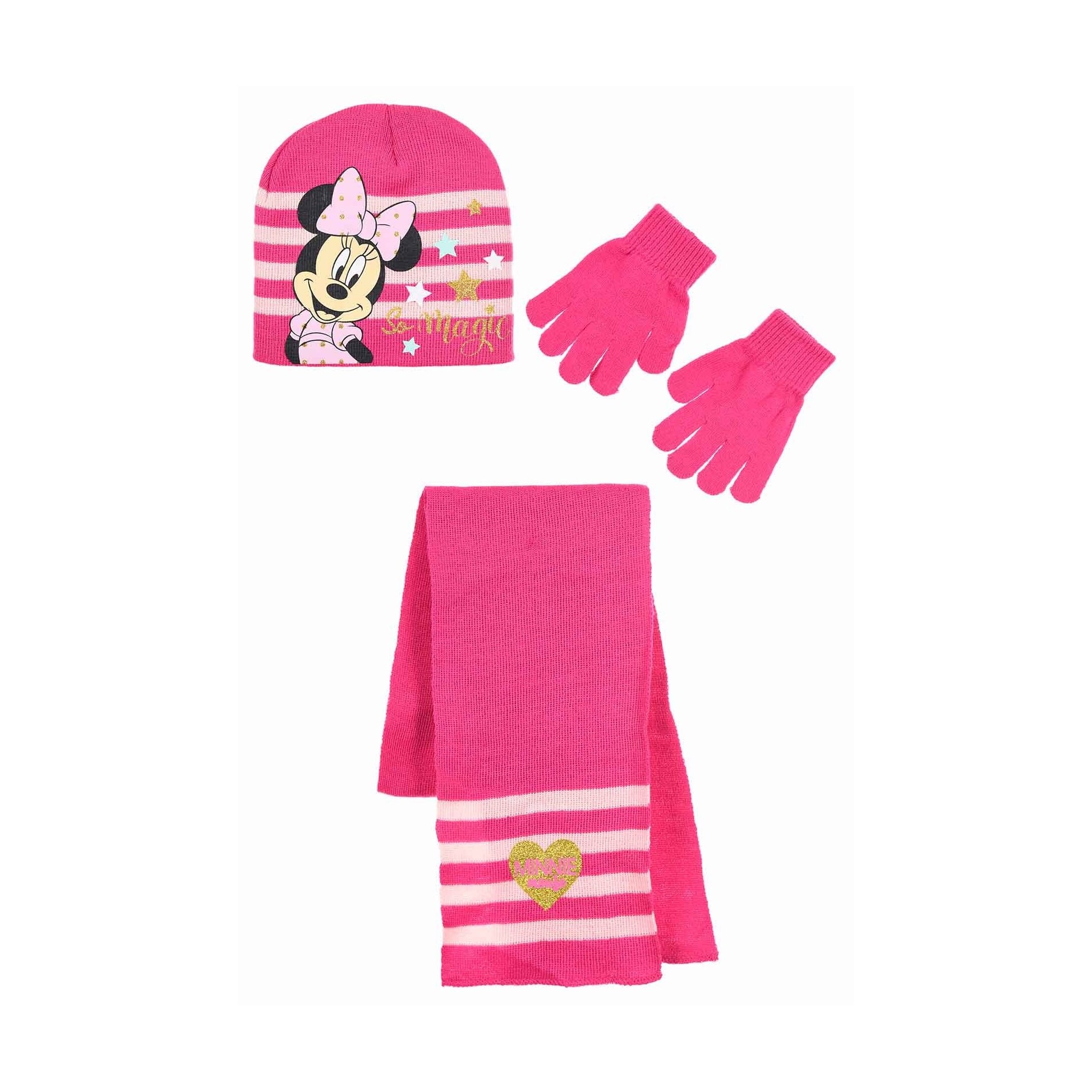 Detta kompletta Minnie Mouse-set för barn innehåller en Minnie-mössa, halsduk och handskar. Setet är tillverkat i mjuk akryl och är perfekt för att hålla ditt barn varmt samtidigt som det visar upp sin favorithjältinna med stil.