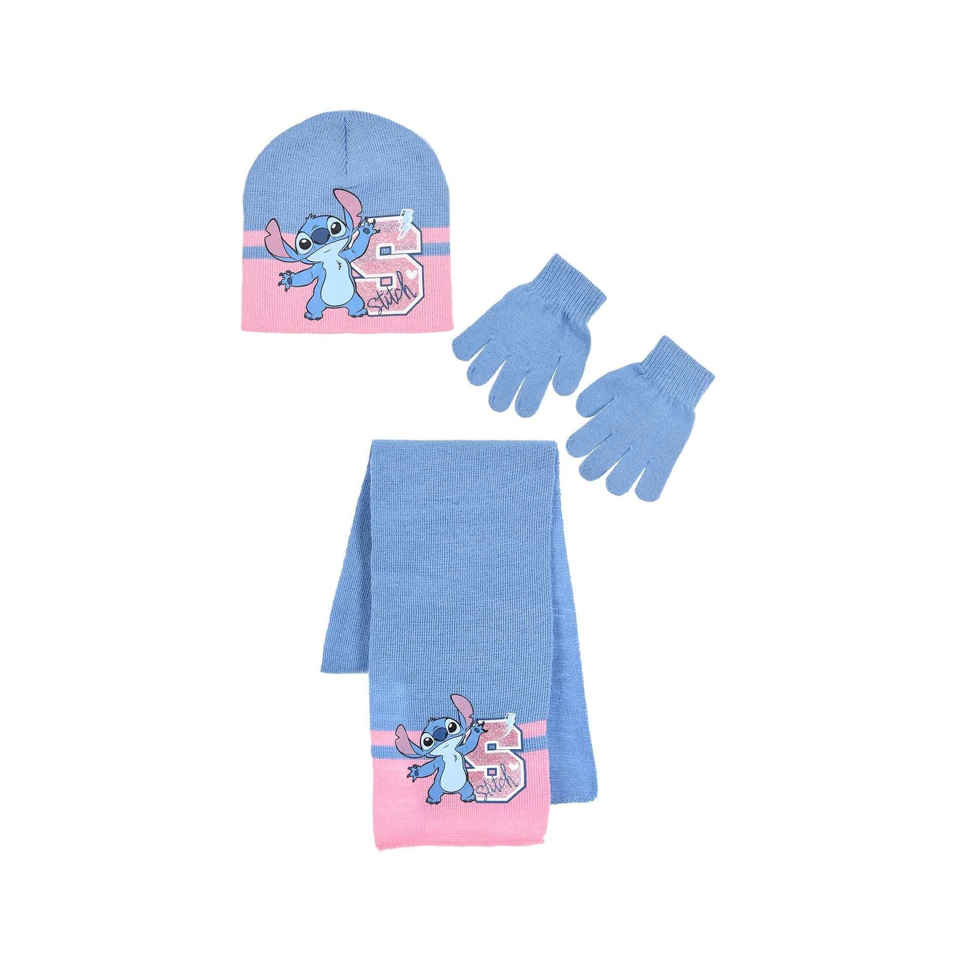Detta kompletta Stitch-set för barn innehåller en mössa, halsduk och handskar, alla med Stitch. Setet är tillverkat i mjuk akryl och är perfekt för att hålla ditt barn varmt samtidigt som det visar upp sin favorithjältinna med stil. Officiell Lilo & Stitch-licens.