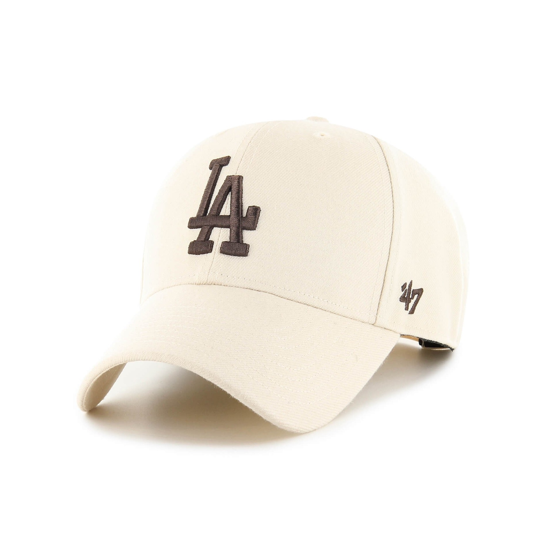 '47 MLB Los Angeles Dodgers MVP Snapback Cap i natur är en basebollkeps, strukturerad och böjd, med präglat broderi på framsidan, '47-broderi på sidan, snapback-stängning på baksidan.