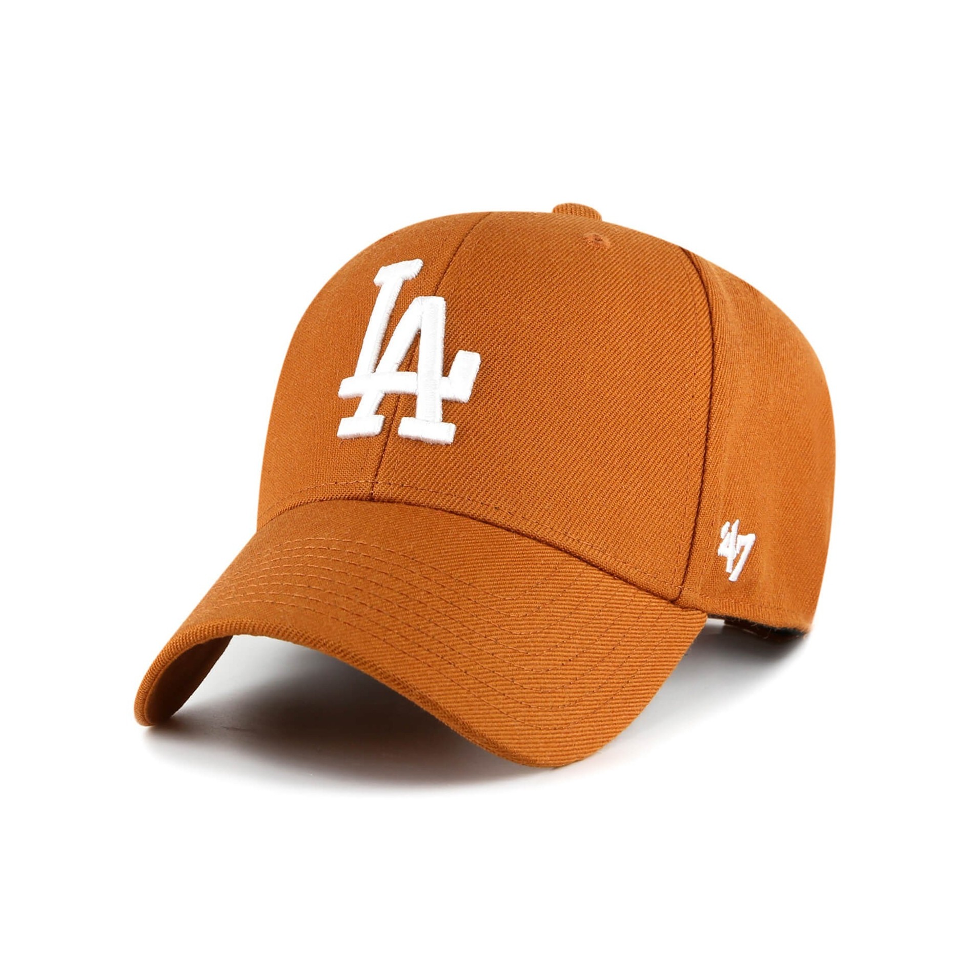 ORANGE '47 MVP Los Angeles Dodgers-kepsen är en basebollliknande keps, strukturerad och rundad, med upphöjt broderi framtill, '47-broderi på sidan och snapback-knäppning baktill.
