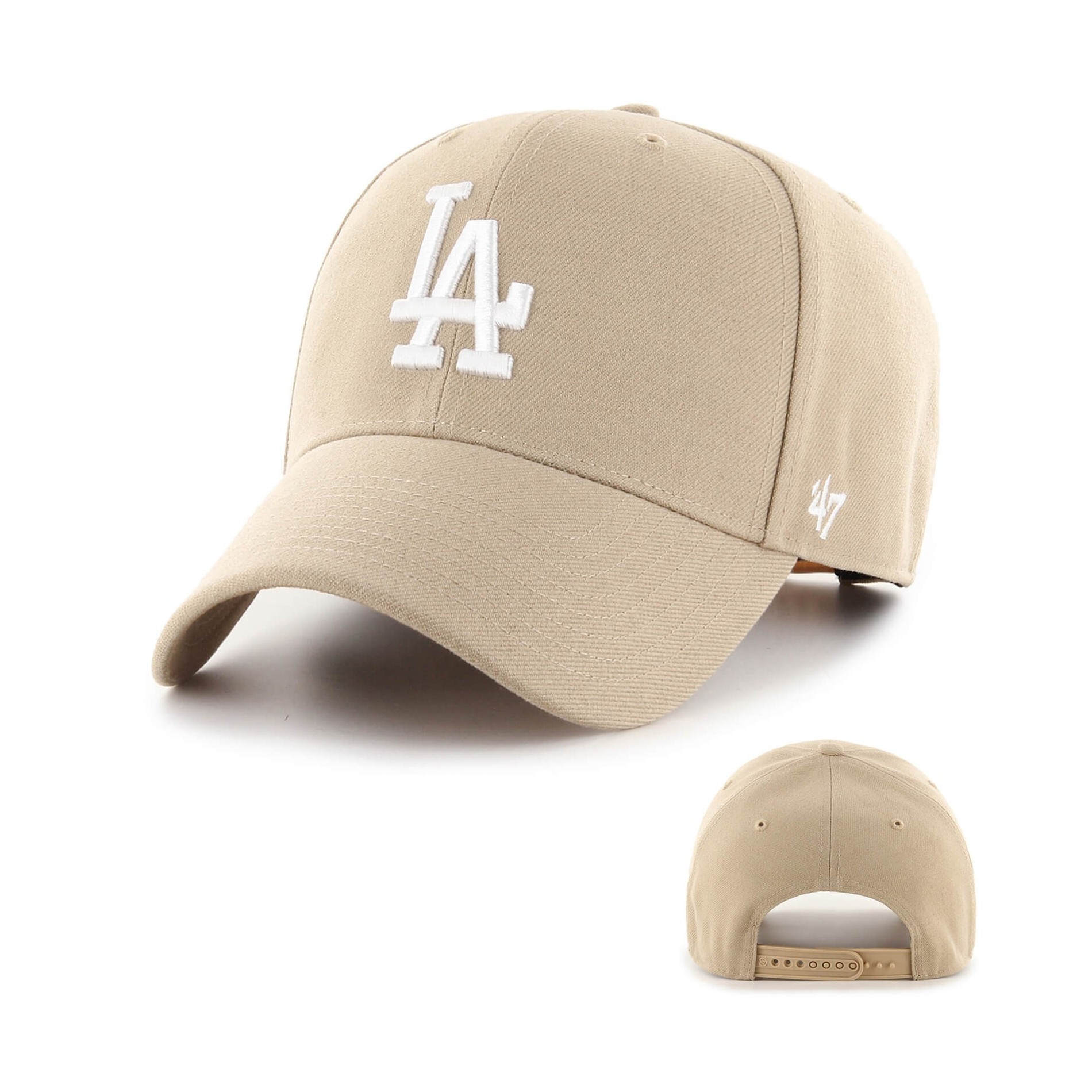 '47 MVP Los Angeles Dodgers-keps i Beige är en keps i basebollstil, strukturerad och böjd, med präglat broderi framtill, '47-broderi på sidan och snapback-knäppning baktill.