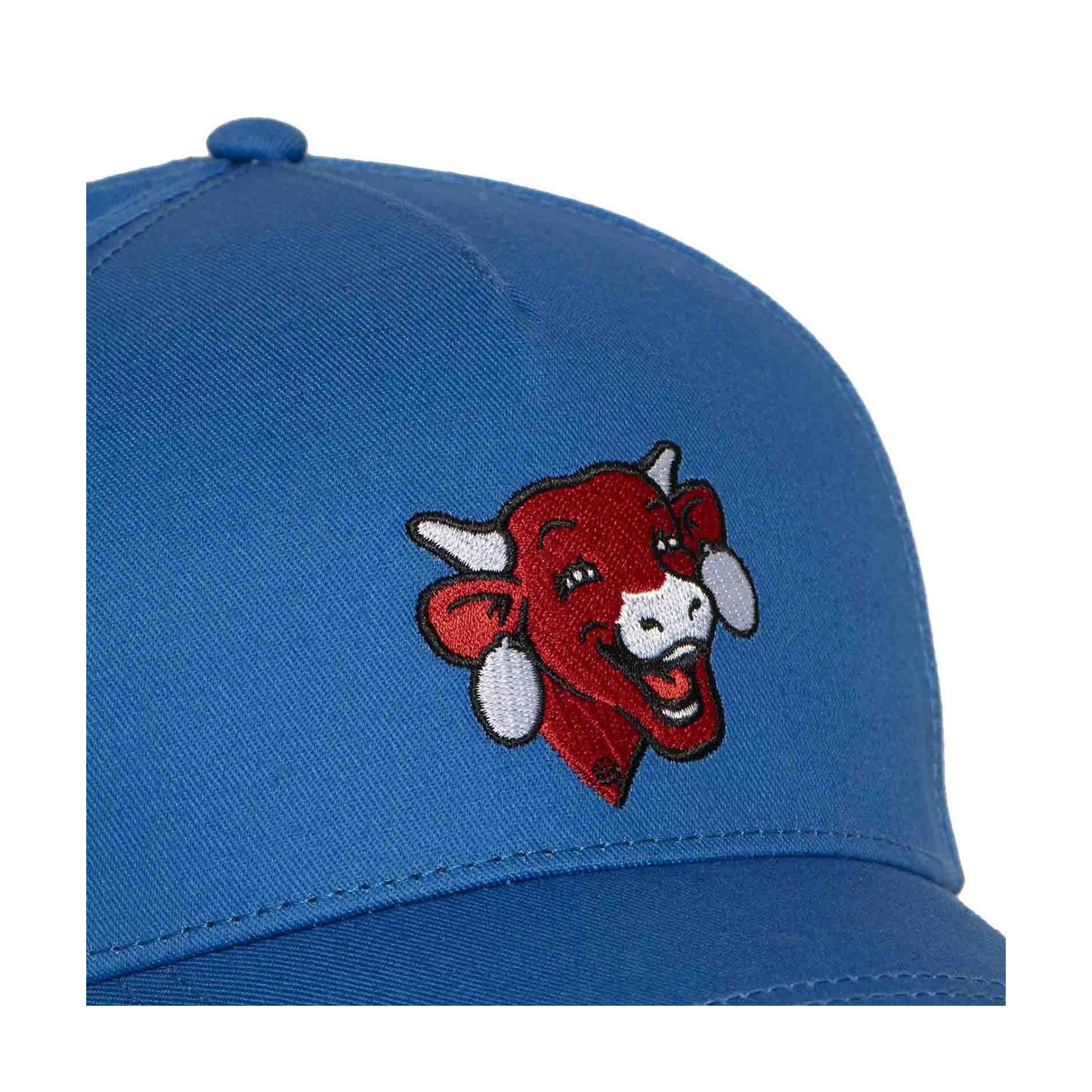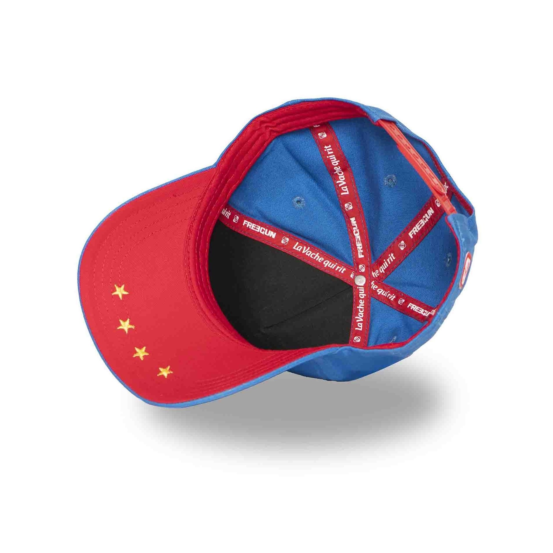 Få en originell look med den här kepsen Freegun i samarbete med La Vache qui Rit. Den blå och röda designen har den emblematiska skrattande kossan broderad på framsidan. Under det röda visiret ger gula stjärnor en dynamisk touch, medan insidan har ett personligt svettband med logotyperna Freegun och La Vache qui Rit. En trendig och bekväm accessoar för fans av streetwear och unika samarbeten.