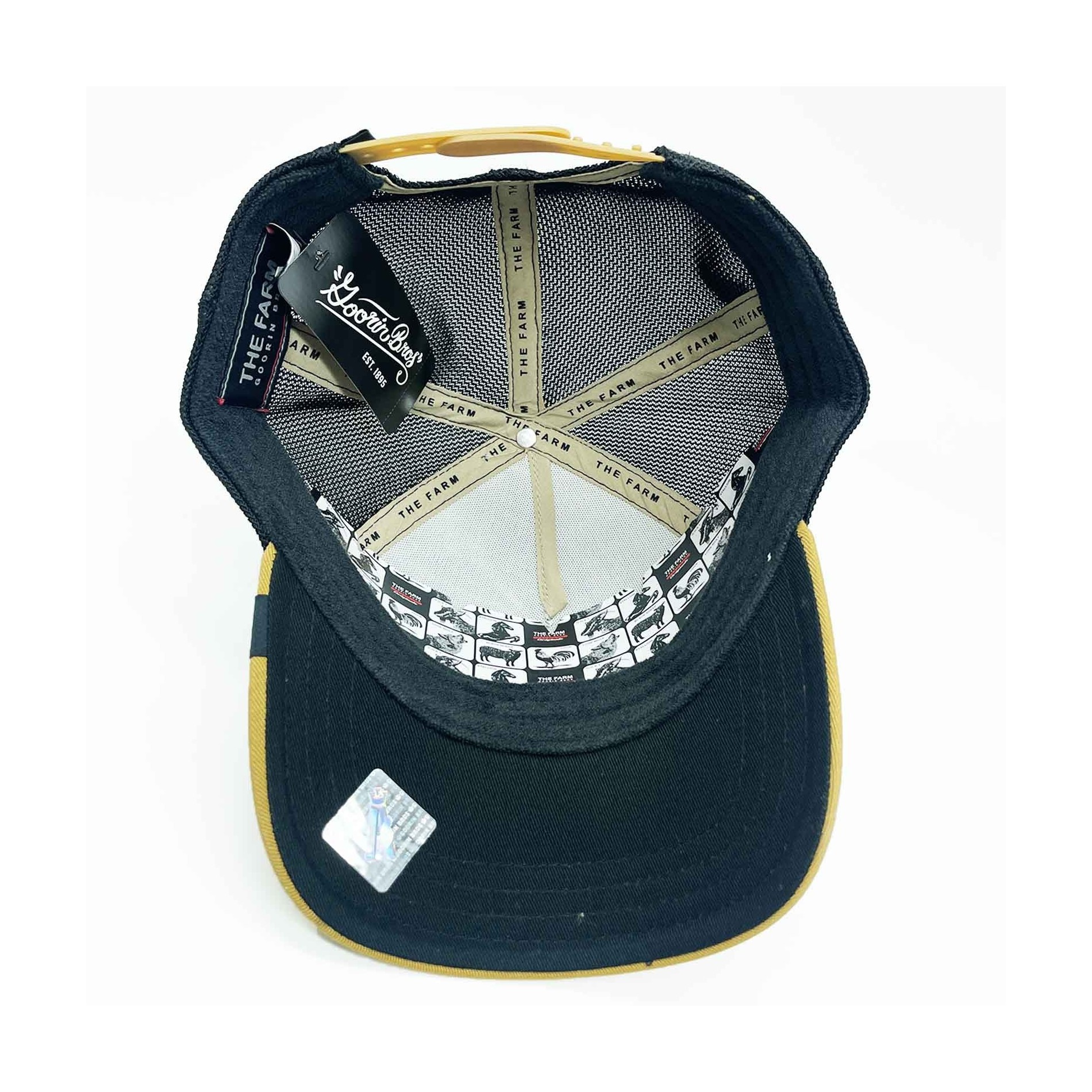 Gör ett stilsäkert intryck med V2 truckerkeps Goorin Bros "TOUGH". Broderad bulldog premium patch, vit front, camel böjd skärm, svart premium mesh och absorberande svettband i frotté. Justerbart snapback-fäste, en storlek passar alla.