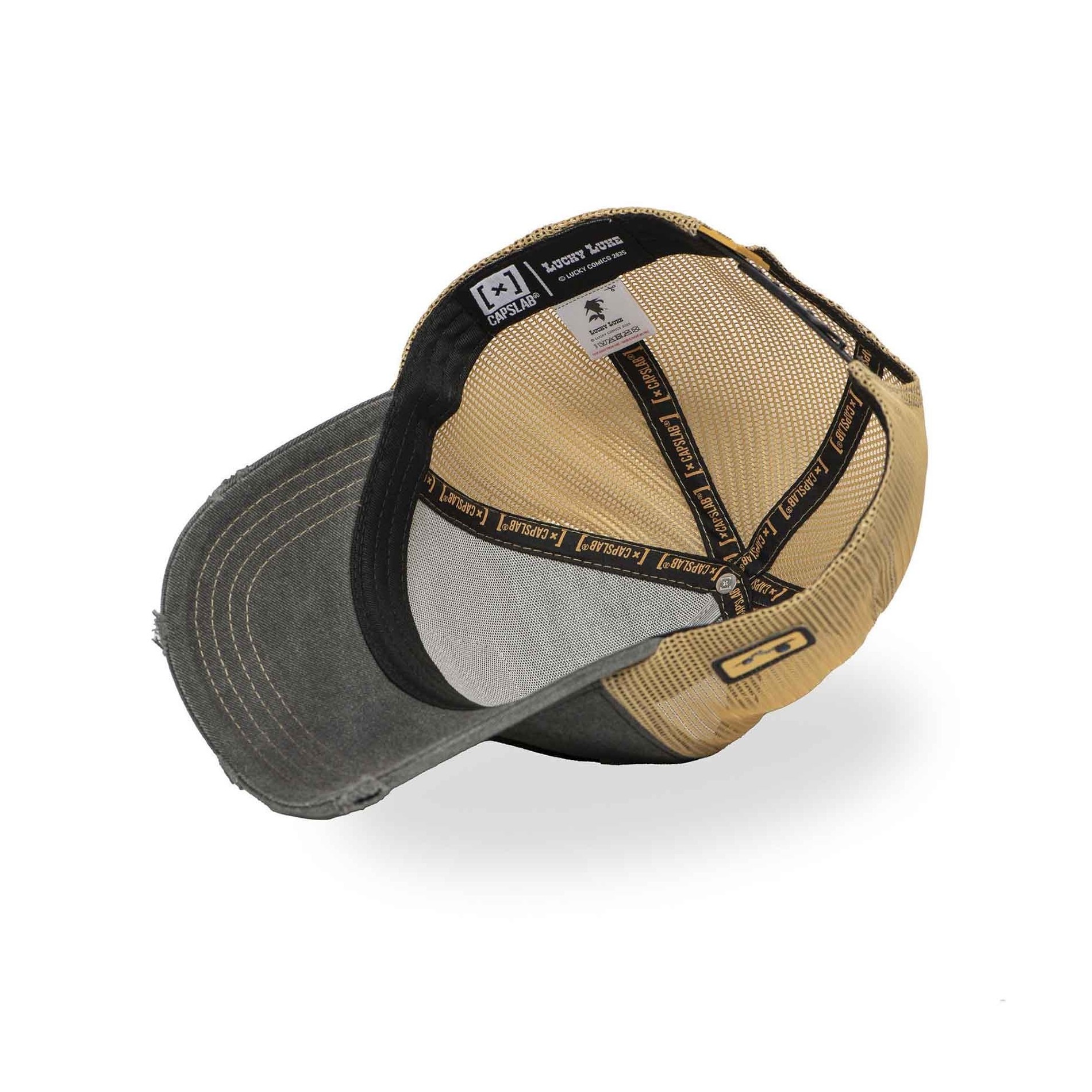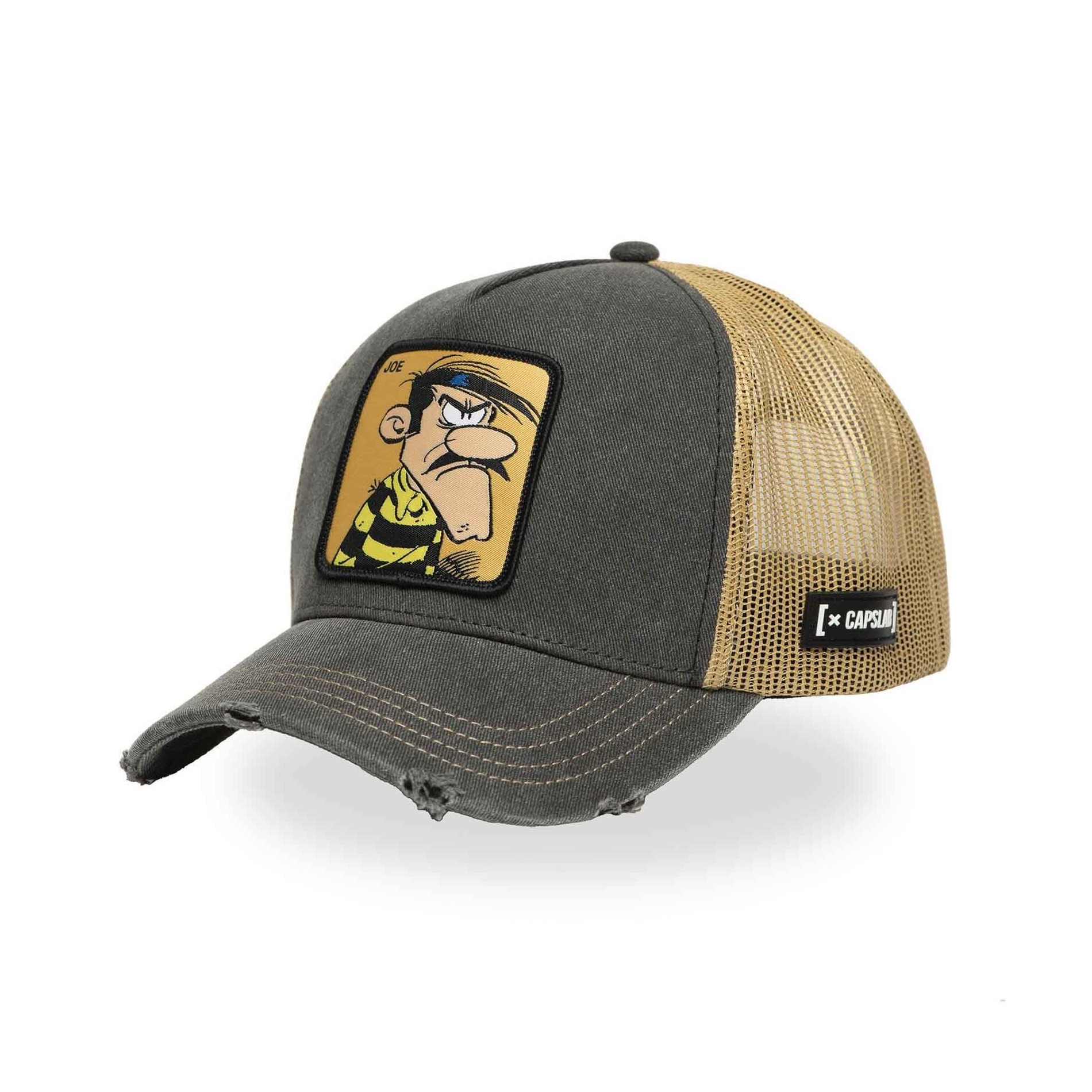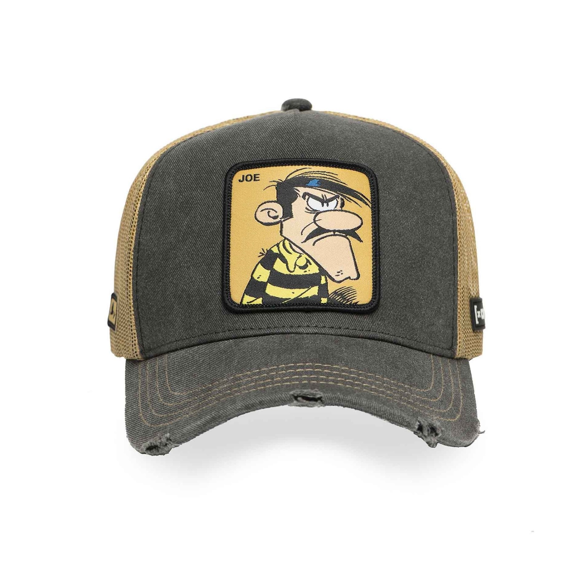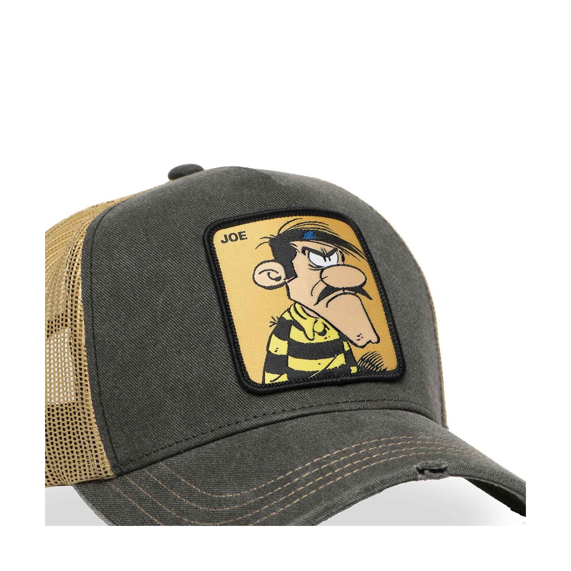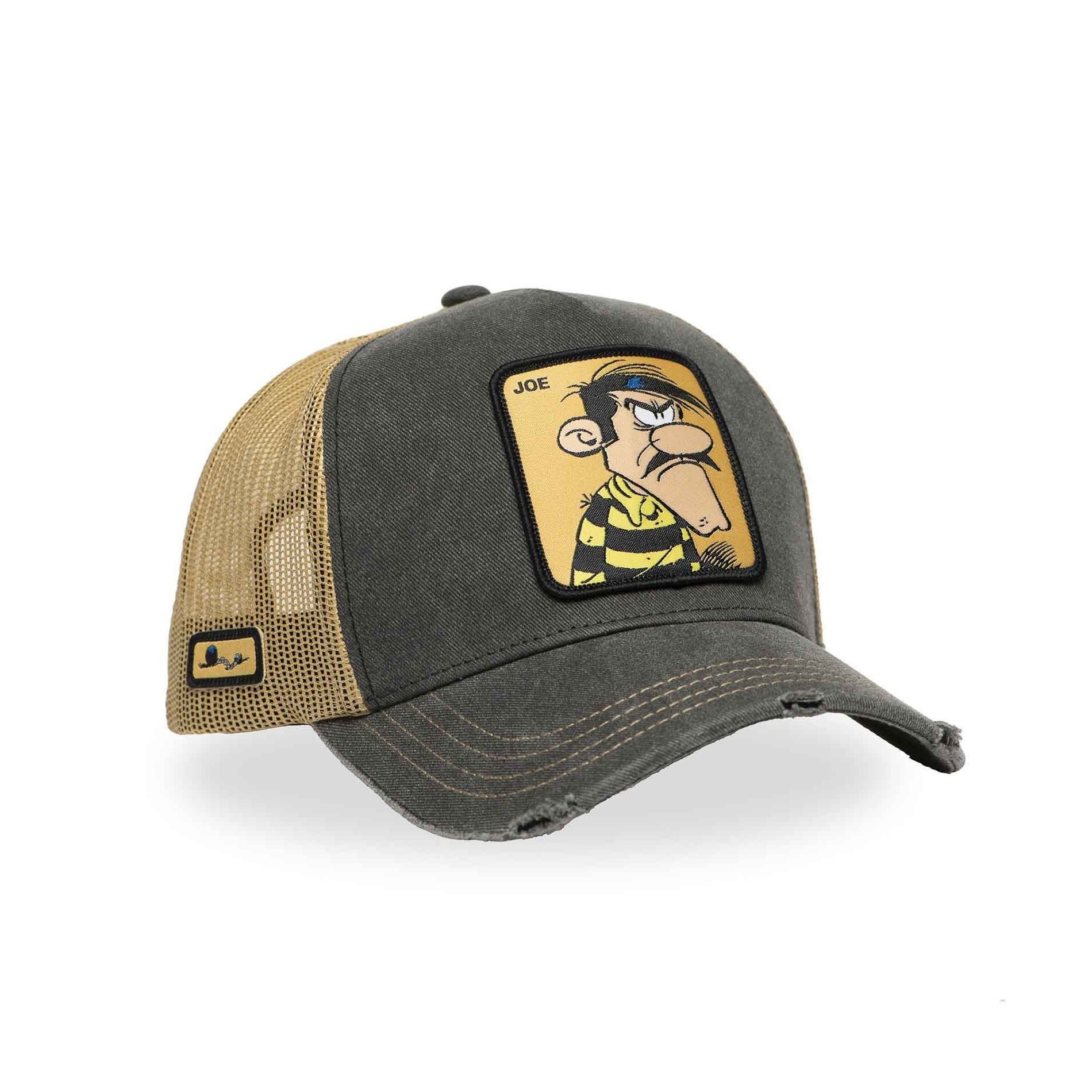 Joe Dalton Truckerkeps Capslab (officiell Lucky Luke-licens). Kolgrå canvas framtill med broderad Joe-patch, förböjd visir med sliten effekt, andningsbar sand mesh baktill. Justerbart snapback-fäste. Storlek för vuxna unisex.