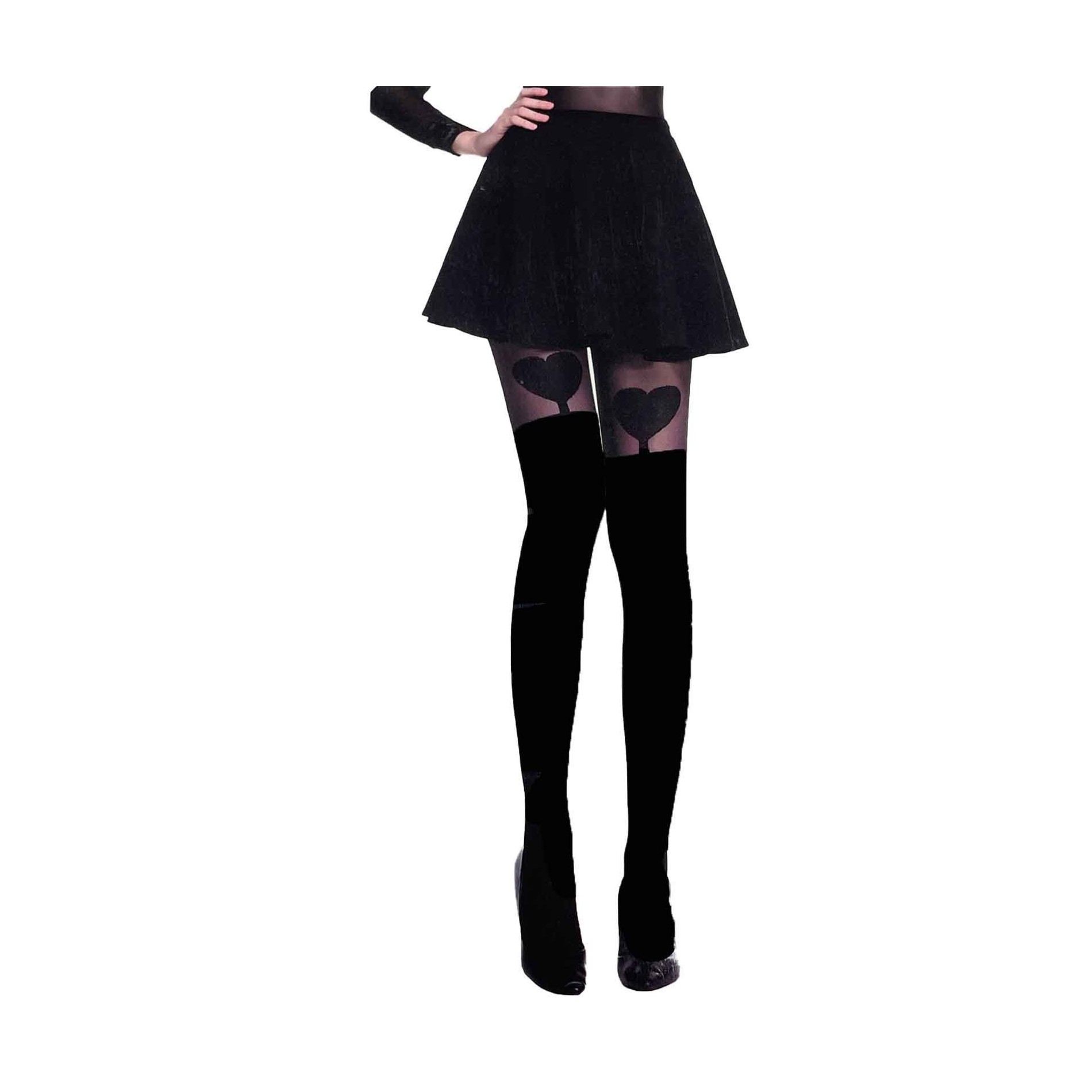 Dessa svarta strumpbyxor spelar på illusionen av en hög strumpa: den nedre delen är ogenomskinlig som en strumpa, medan den övre delen av låret är mer transparent. I korsningen har ett vackert, fullt hjärta ritats på varje lår för en look som är både söt och sexig, perfekt till en kort kjol eller en skaterklänning.