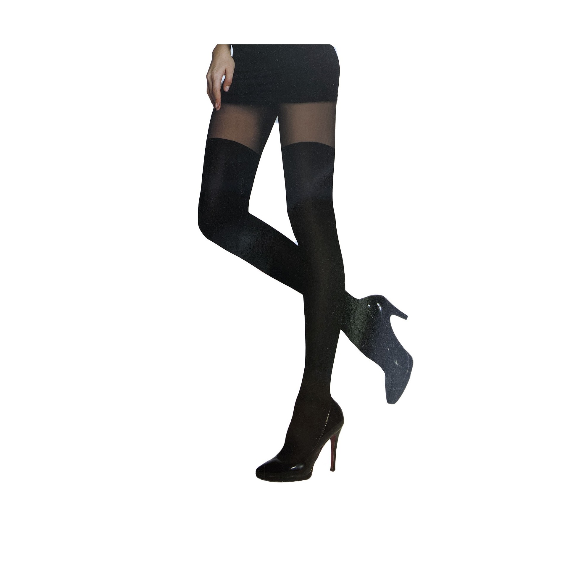 Dessa svarta strumpbyxor har en mycket elegant strumpliknande effekt: den övre delen, från lårets ovansida till midjan, är tillverkad av en mer transparent voile, medan den nedre delen av benet är ogenomskinlig, som en hög strumpa. Kontrasten skapar en illusion av strumpor eller lårhöga stövlar, samtidigt som den ger samma komfort som klassiska strumpbyxor.