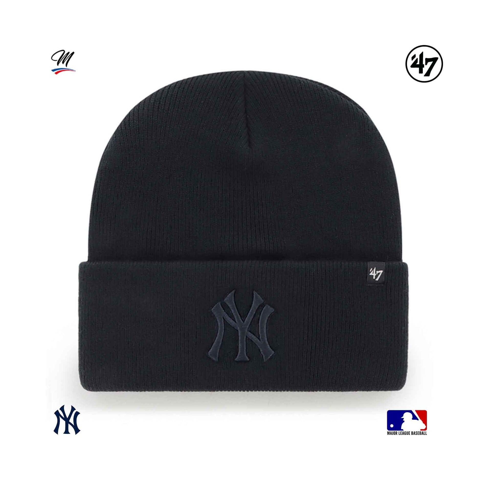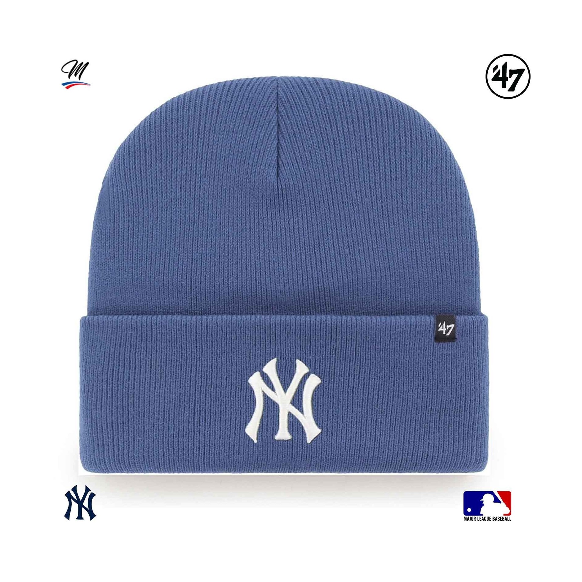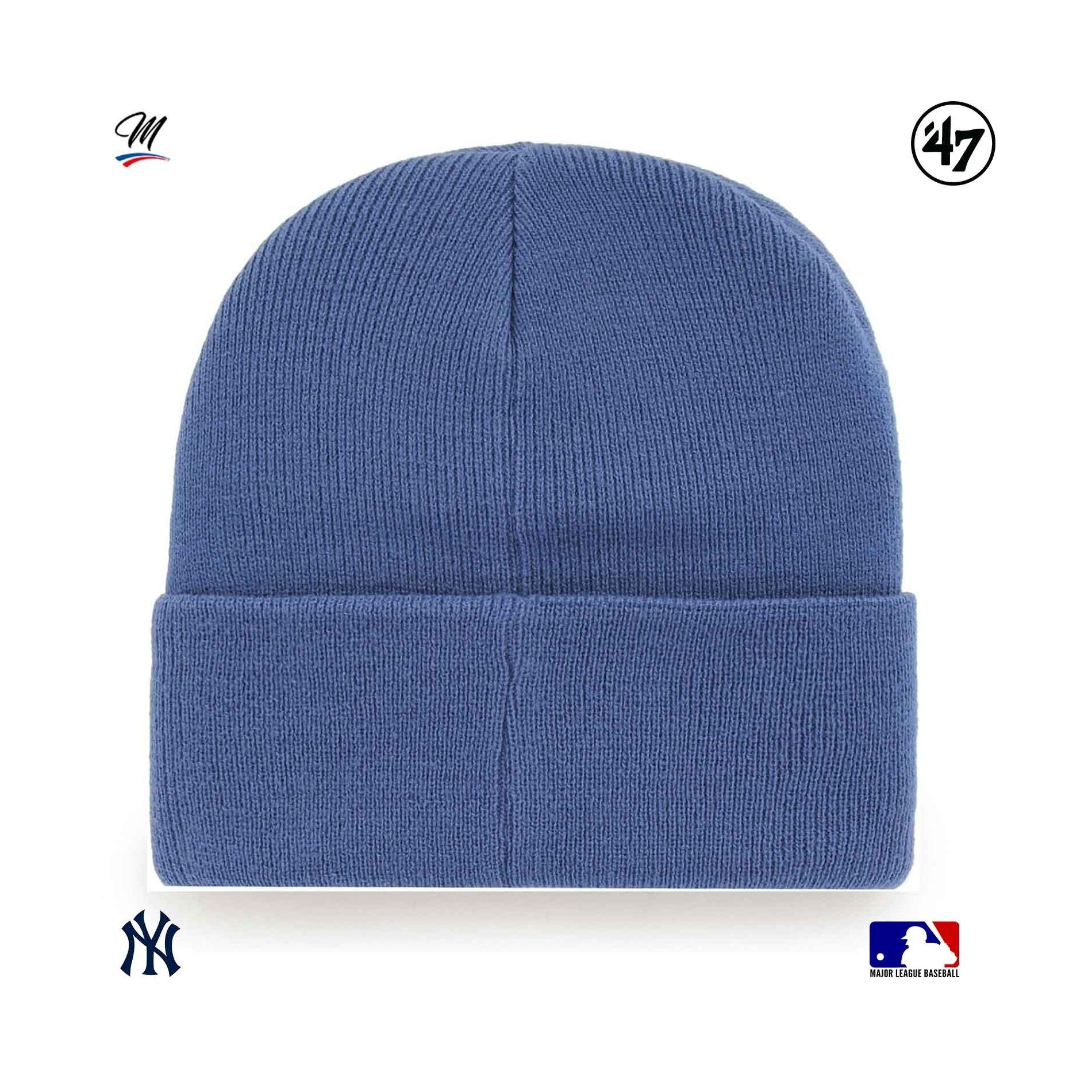 Beanie '47 New York Yankees Haymaker är en kollektion av varma mössor för vintern i blått, med ett New York Yankees-broderi på framsidan i en annan färg.