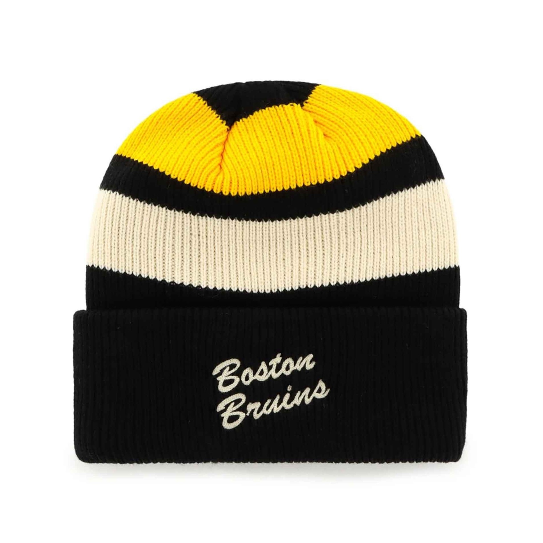 Visa upp din stil med Boston Bruins färger och denna "ClubHouse Jennings" beanie med mudd från 47 Brand. Denna eleganta svartgula modell är designad för att kombinera komfort och stil samtidigt som den skyddar dig mot kylan på matcher eller i vardagen.