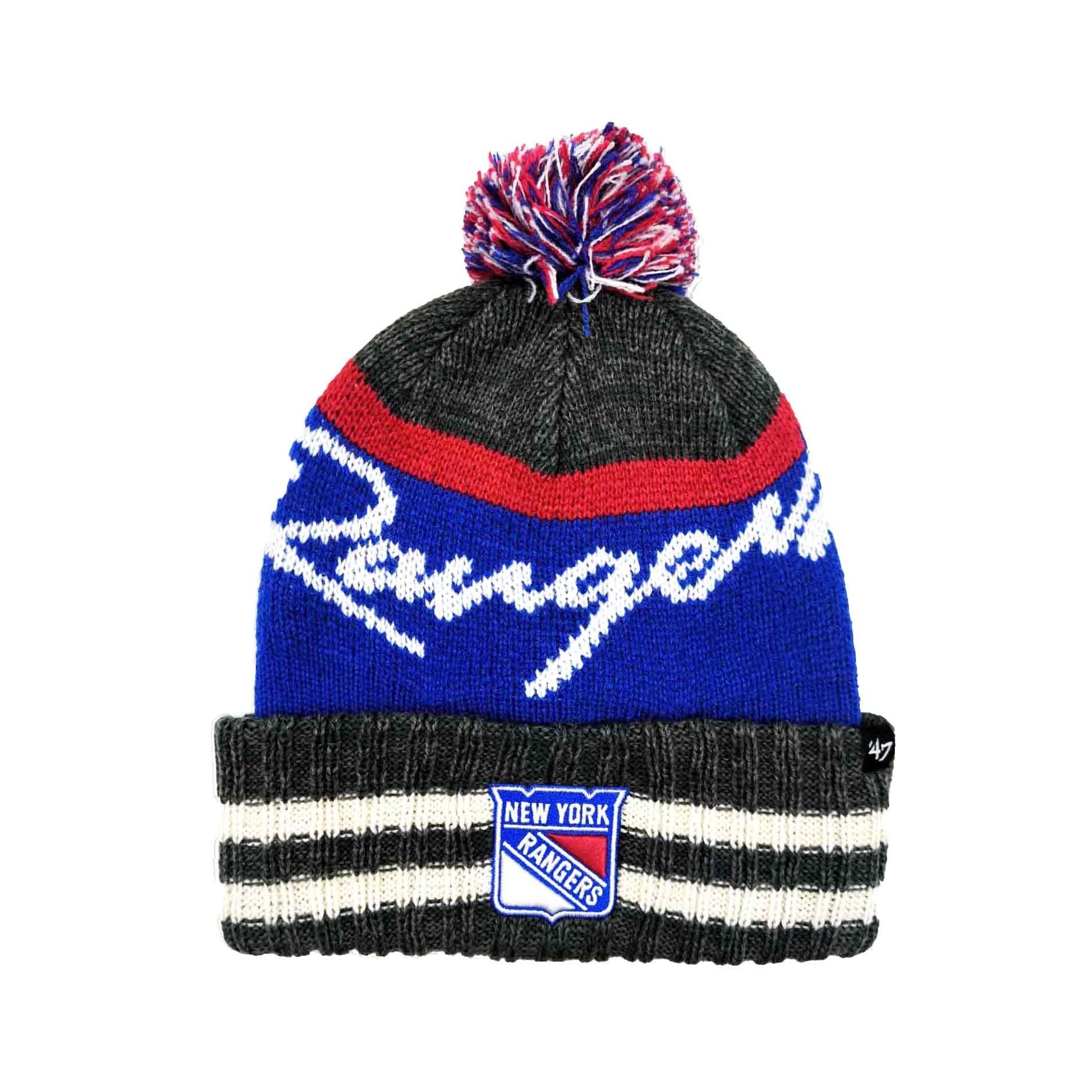 '47 New York Rangers "Hyperbolic" Beanie är en varm, randig mössa för vintern, med en broderad "New York Rangers"-lapp präglad med New Yorks hockeylag på framsidan och en liten '47-etikett på sidan. New York Rangers"-text på framsidan 100% akryl