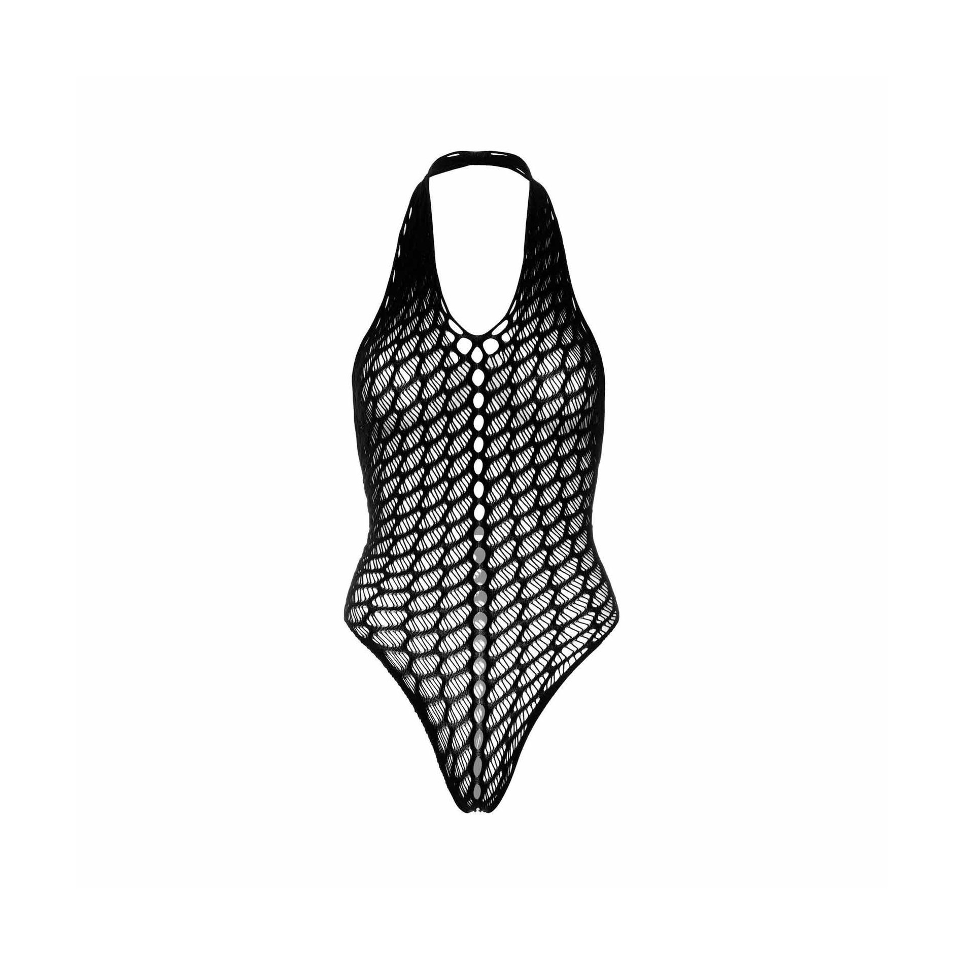 Denna genombrutna nätbody har ett geometriskt mönster som drar en vacker vertikal linje längs bystens mitt och visuellt förfinar silhuetten. Den djupa halterneckringningen frigör axlar och övre delen av ryggen för en mycket glamorös look. Stringtrosan framhäver skinkorna och förlänger benen, medan det stretchiga tyget kramar kroppen som en andra hud utan att strama.