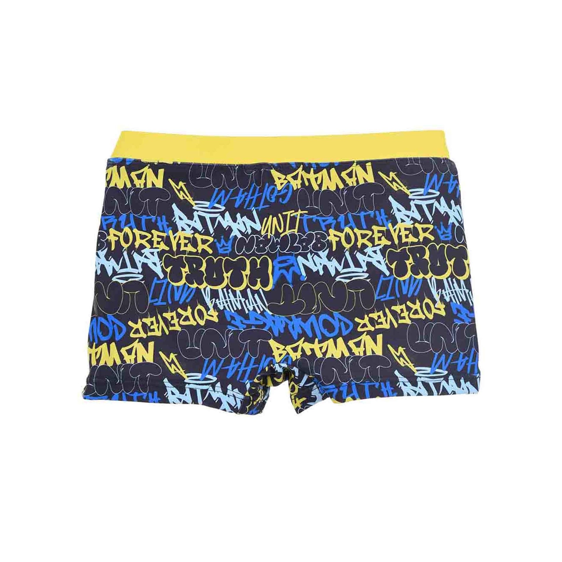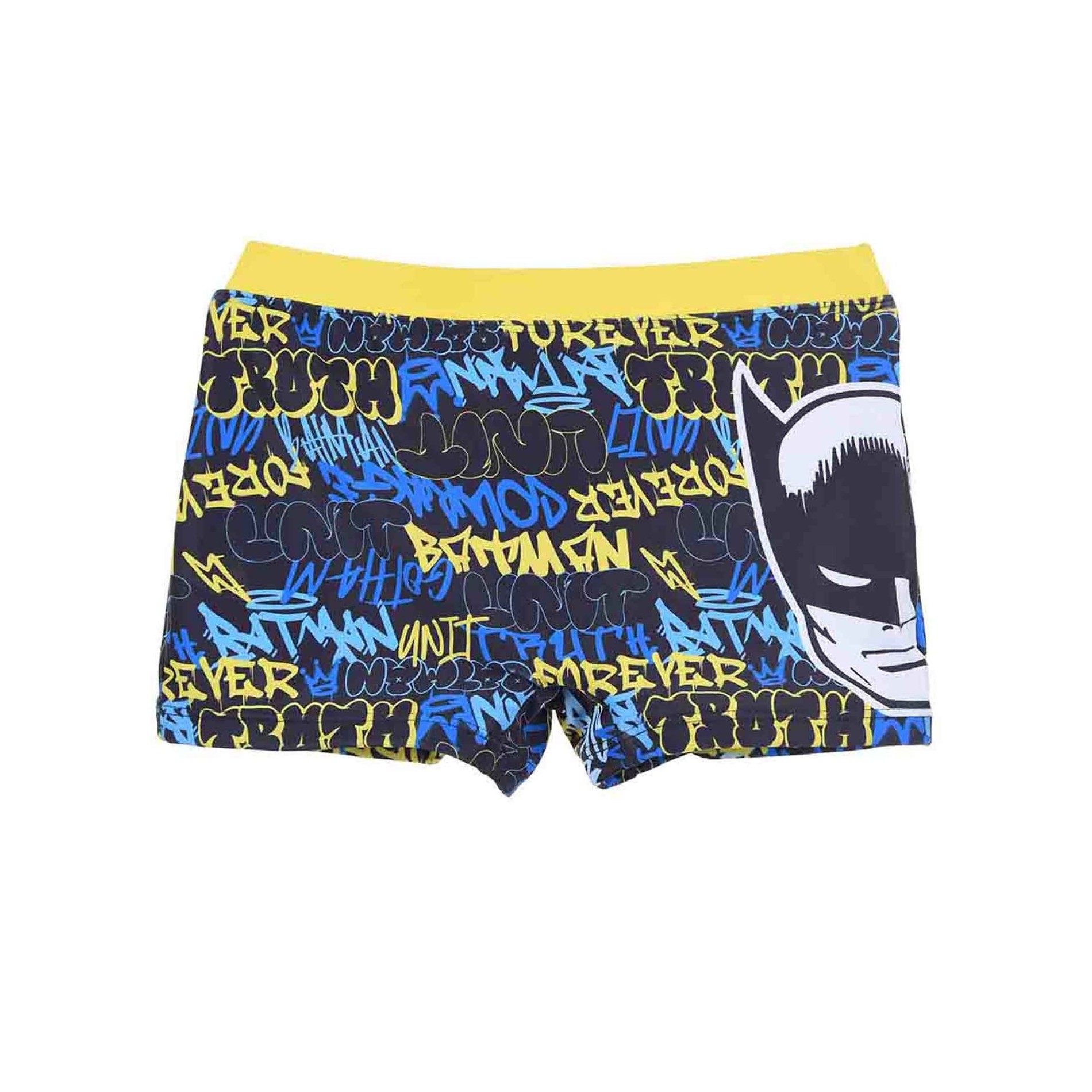 Batman boxer baddräkt för pojkar. Blå och gul street art-design med Batman-logotyp. Bekväm, snygg och officiellt licensierad av DC Comics.