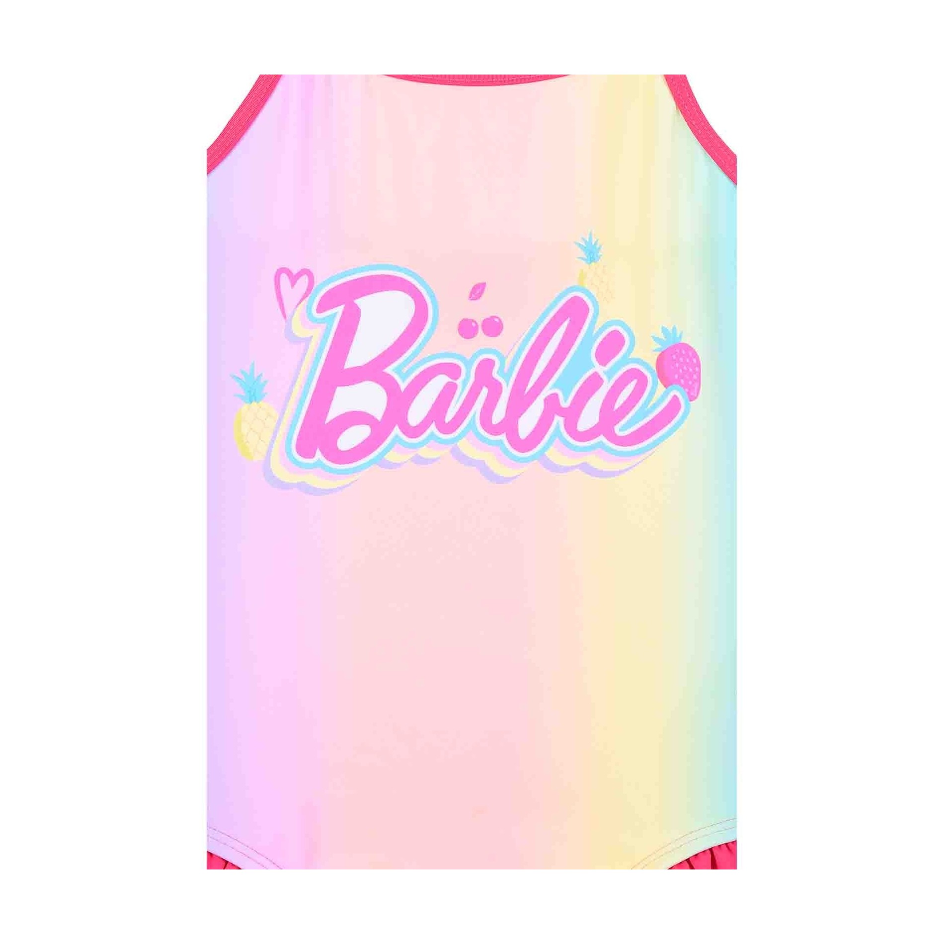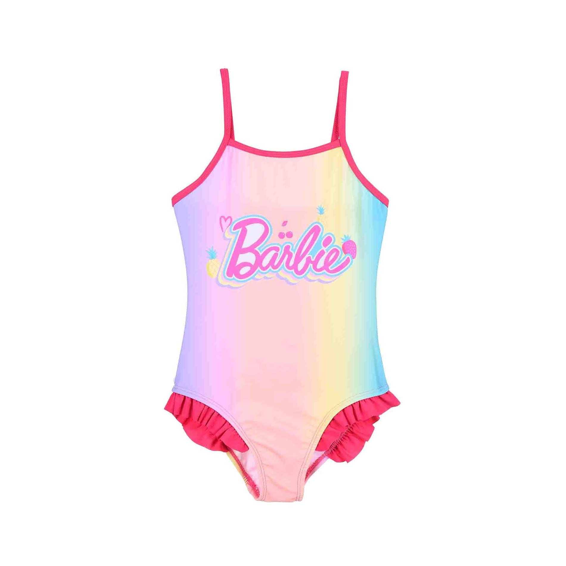 Låt din lilla fashionistas sommar skina med denna Barbie-flickans baddräkt i ett stycke, med pastellfärger och bedårande detaljer. Denna modell är under officiell Barbie-licens och kombinerar stil, komfort och fantasi tack vare sin regnbågsgradient, färgglada Barbie-logotyp och vackra rosa volanger på höfterna.