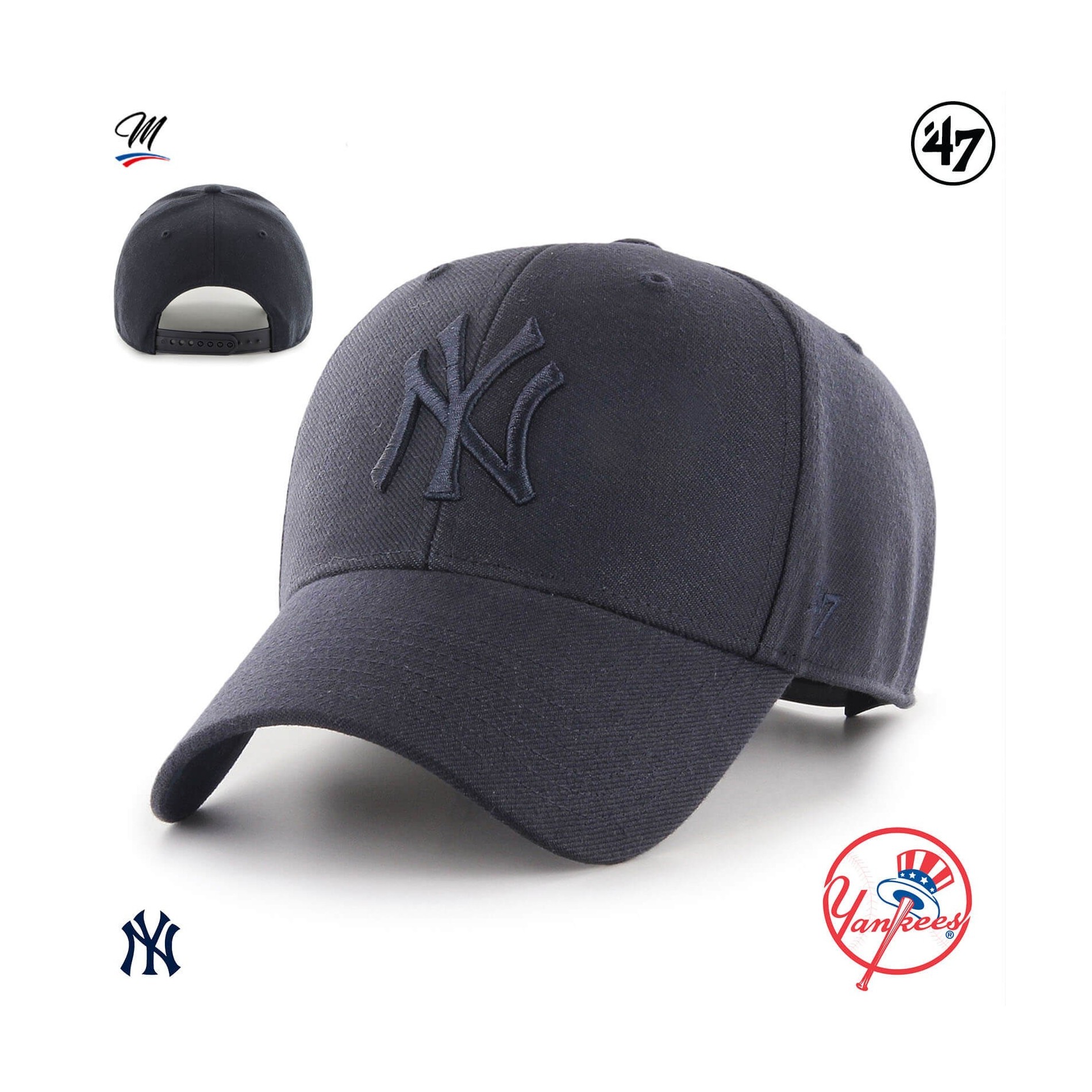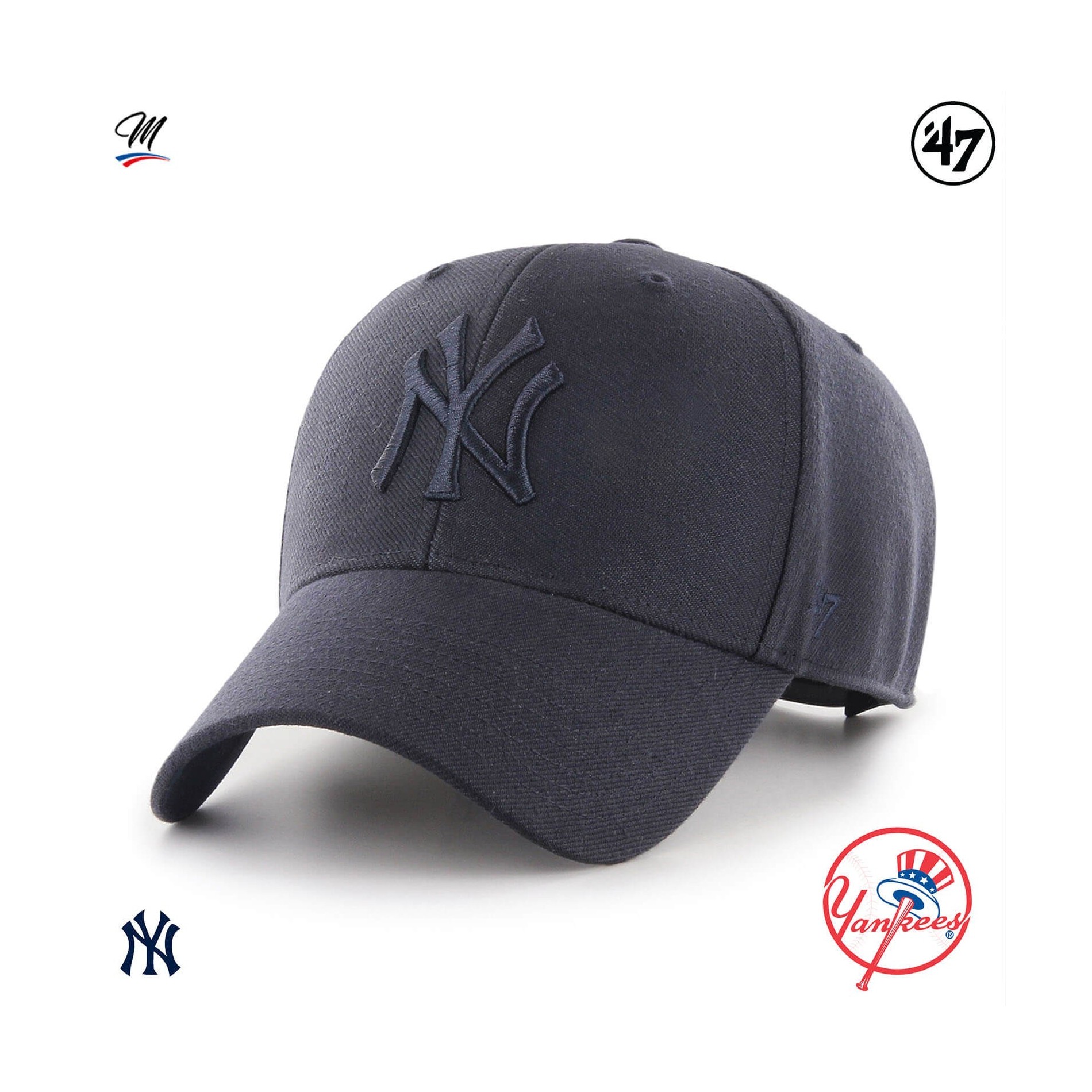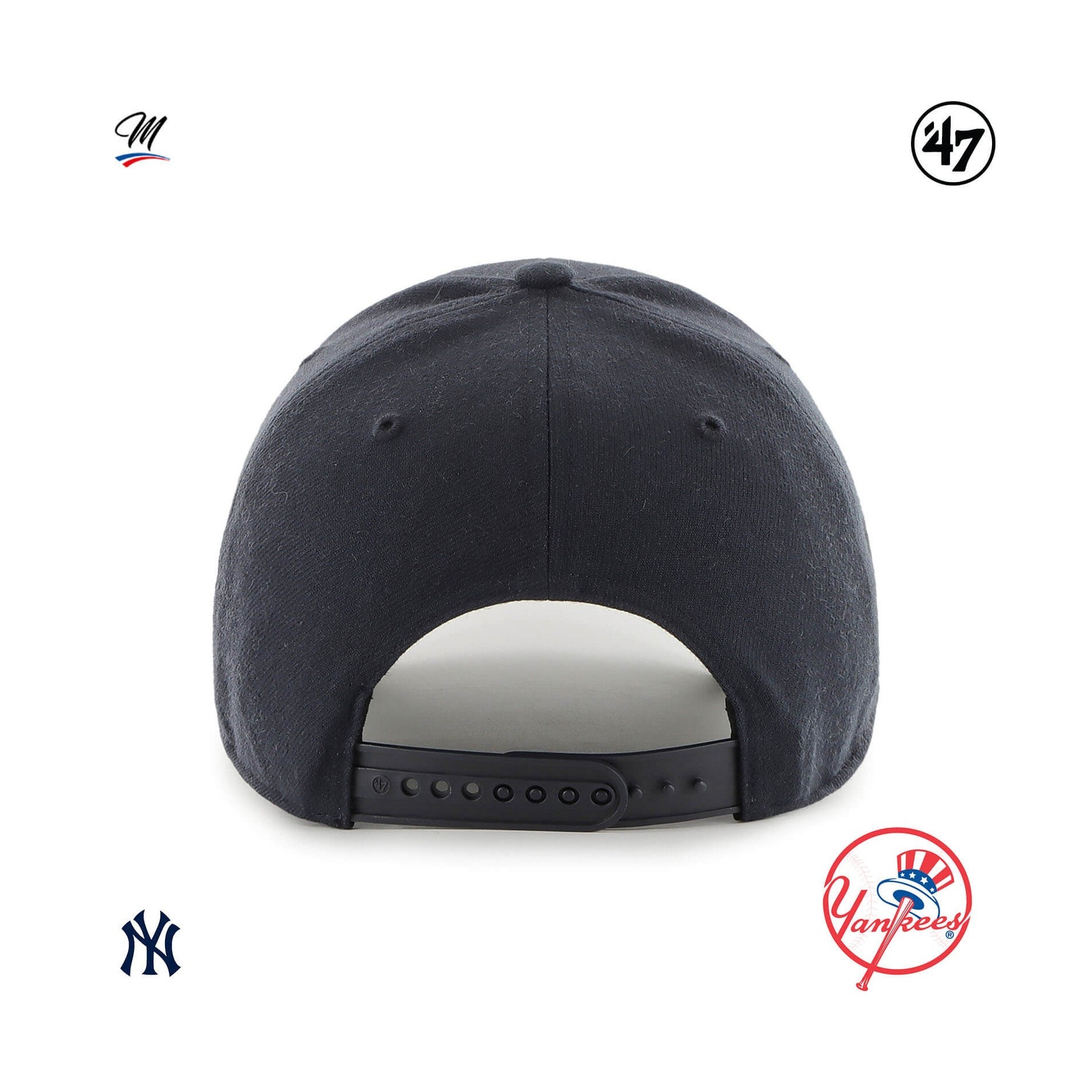 Den '47 MLB New York Yankees MVP Snapback Cap i blått är en strukturerad, böjd basebollkeps med upphöjt broderi på framsidan, '47-broderi på sidan och snapback-knäppning på baksidan.