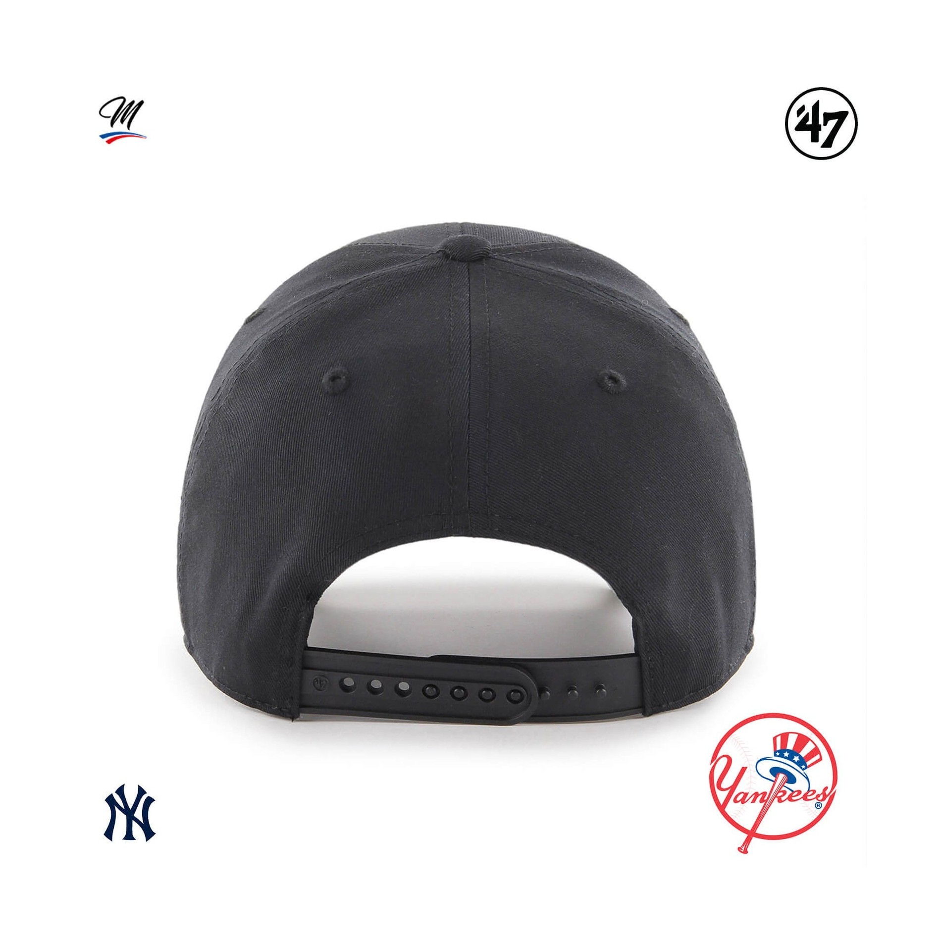 Den '47 MLB New York Yankees MVP Snapback Cap i svart är en strukturerad, böjd basebollkeps med upphöjt broderi på framsidan, '47-broderi på sidan och snapback-knäppning på baksidan.