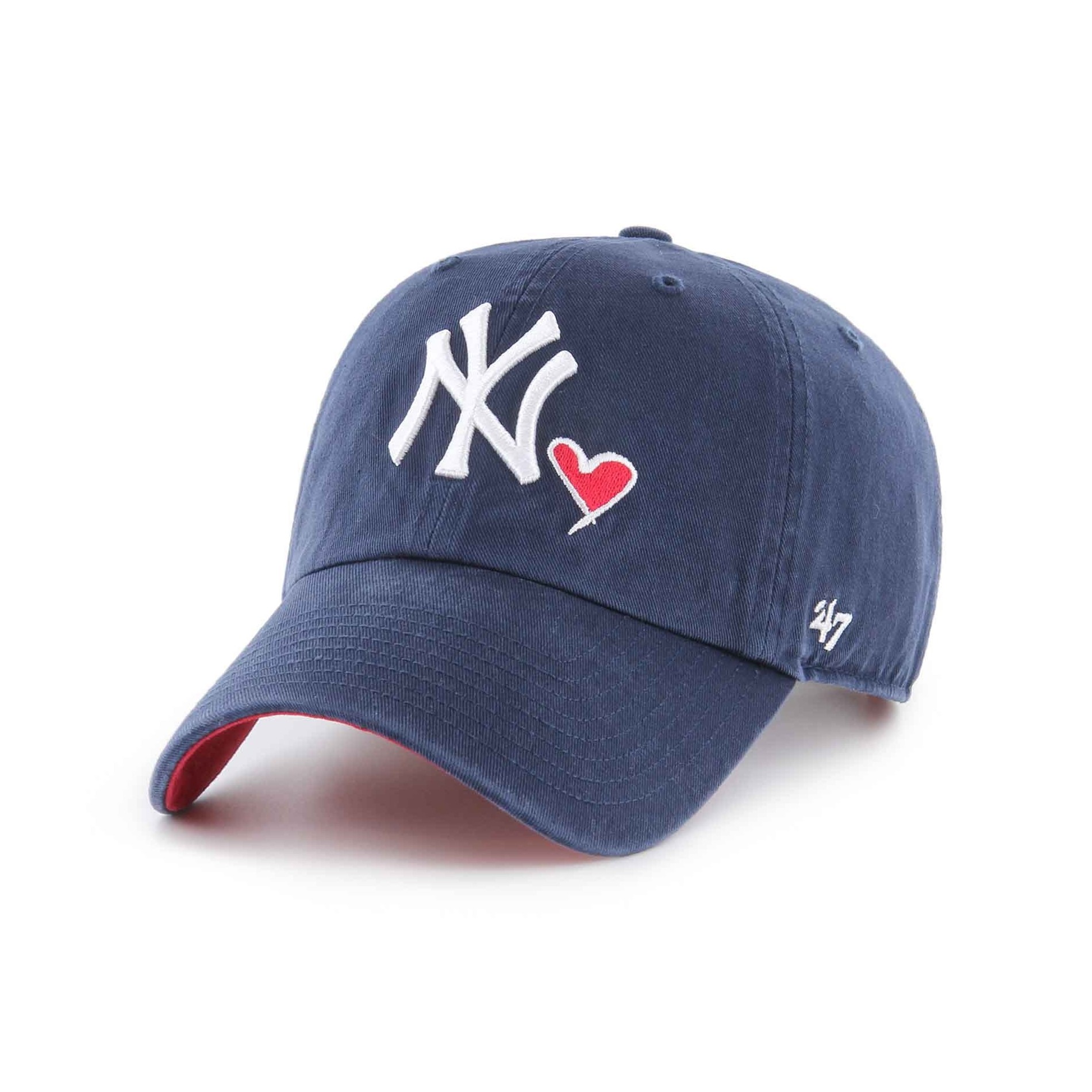 Brodyr: "NY" (New York Yankees) broderat på framsidan, med ett rött hjärta bredvid logotypen, som symboliserar kärlek och passion för laget.