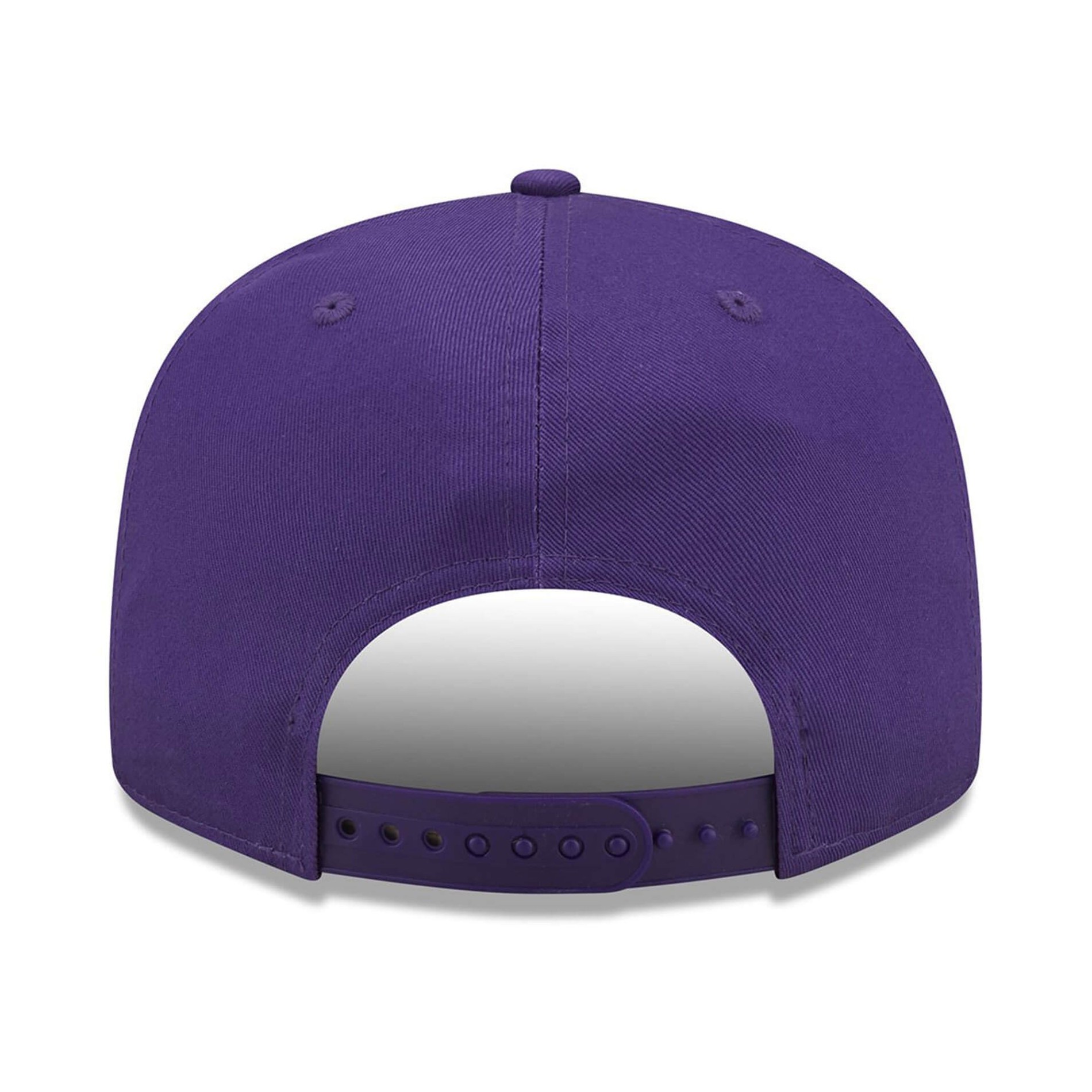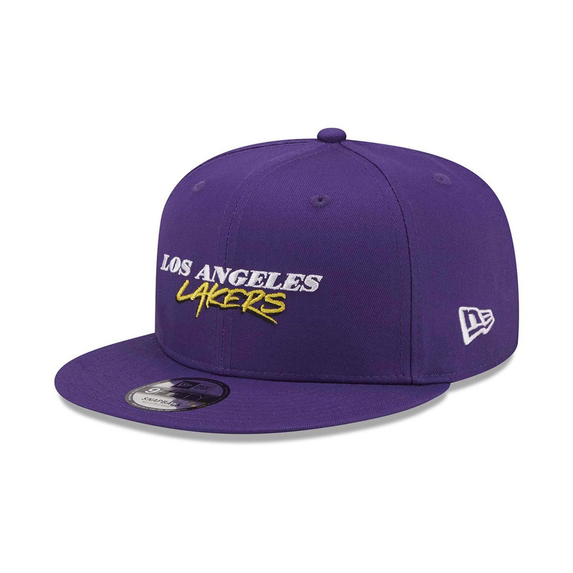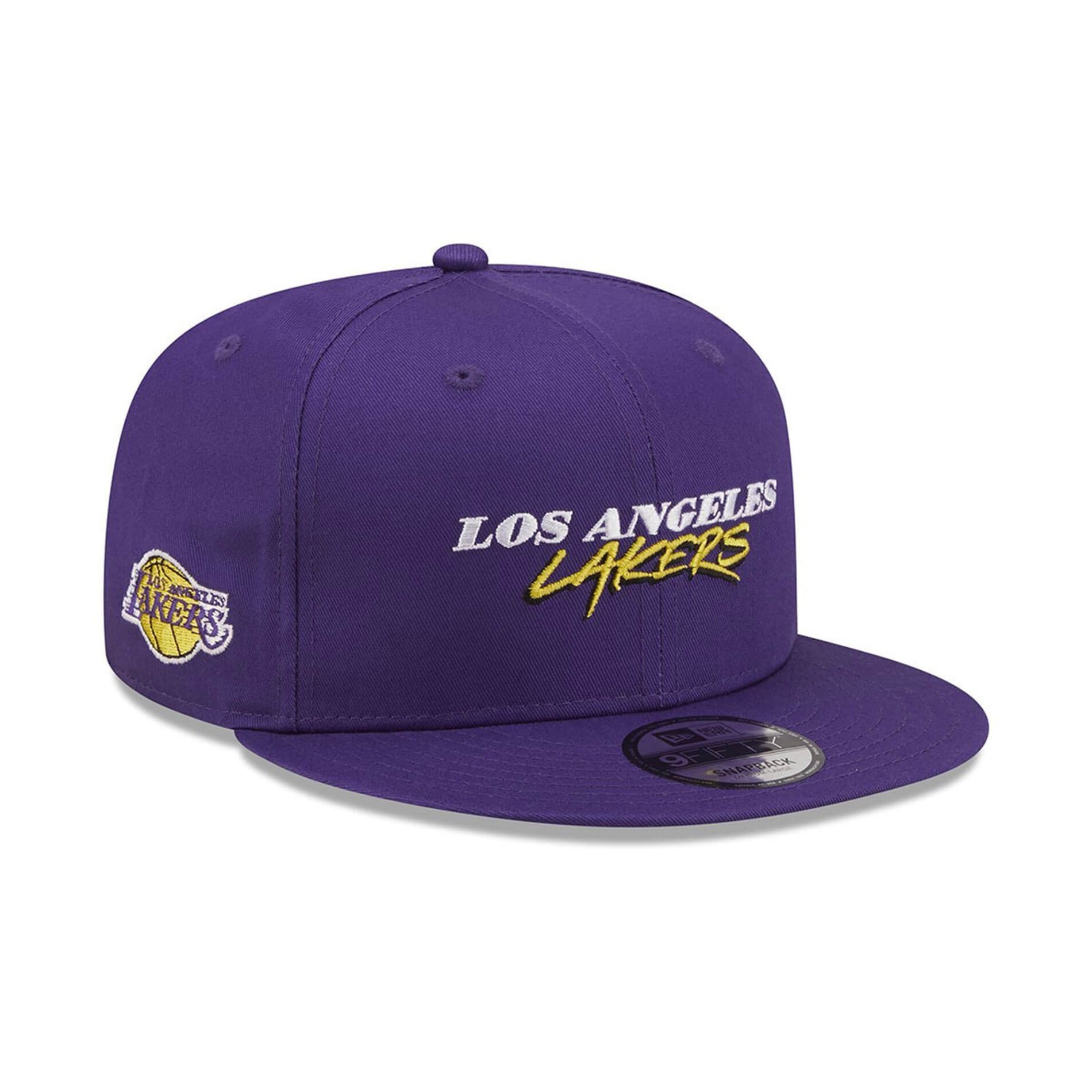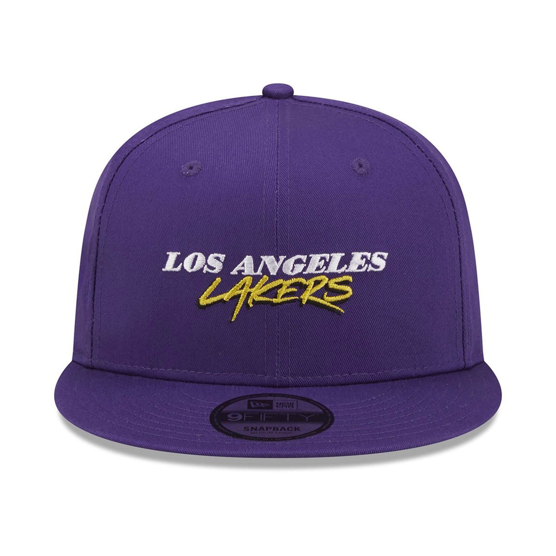 New Era 9FIFTY platt framsida Los Angeles Lakers Script Team NBA cap, snapback justeringssystem, bomullsmaterial med Los Angeles Lakers logotyp och Lakers logotyp på sidan.