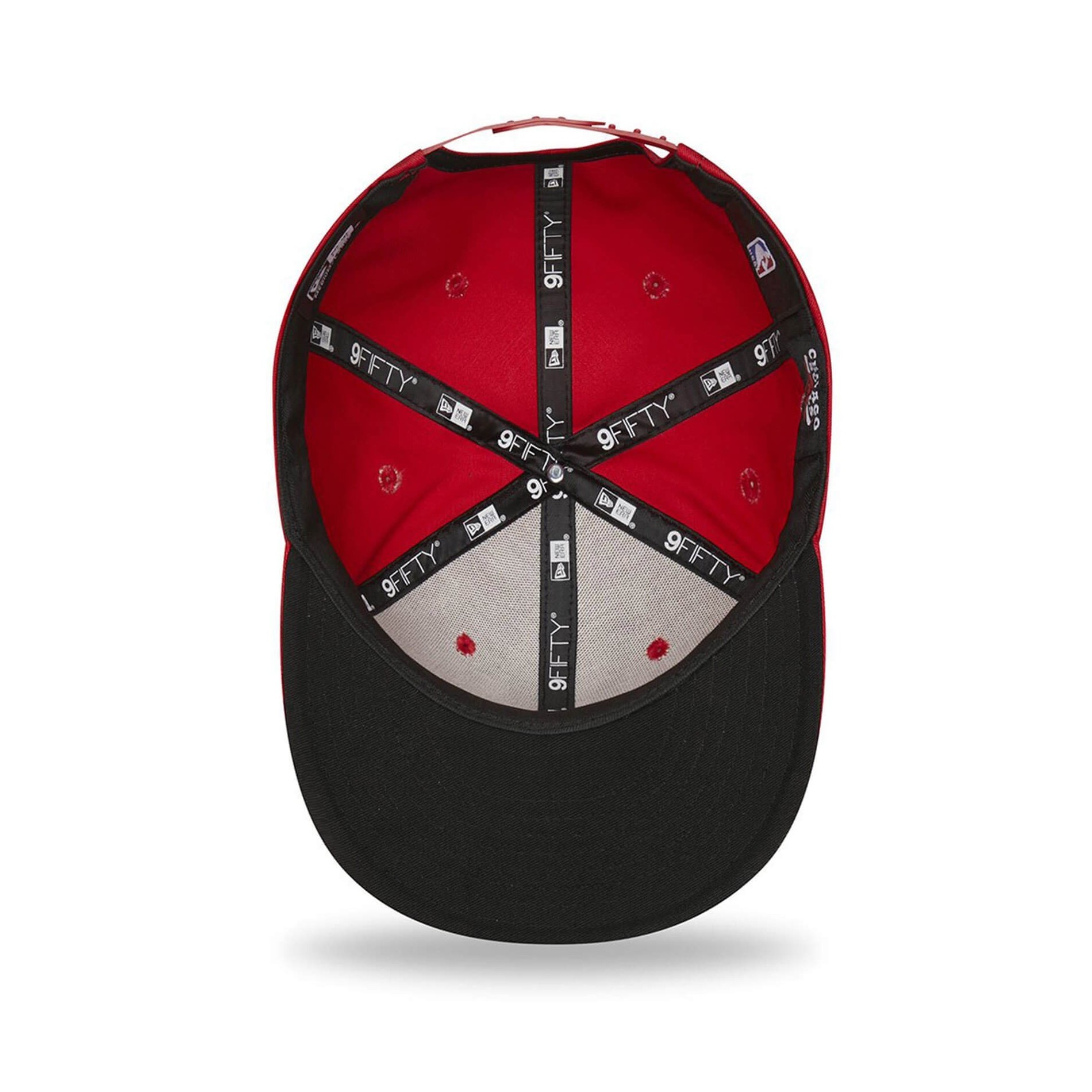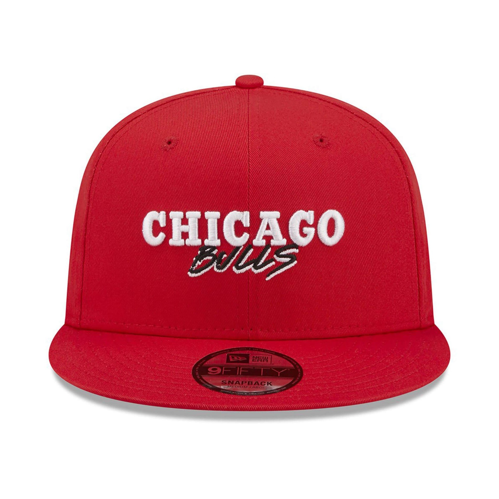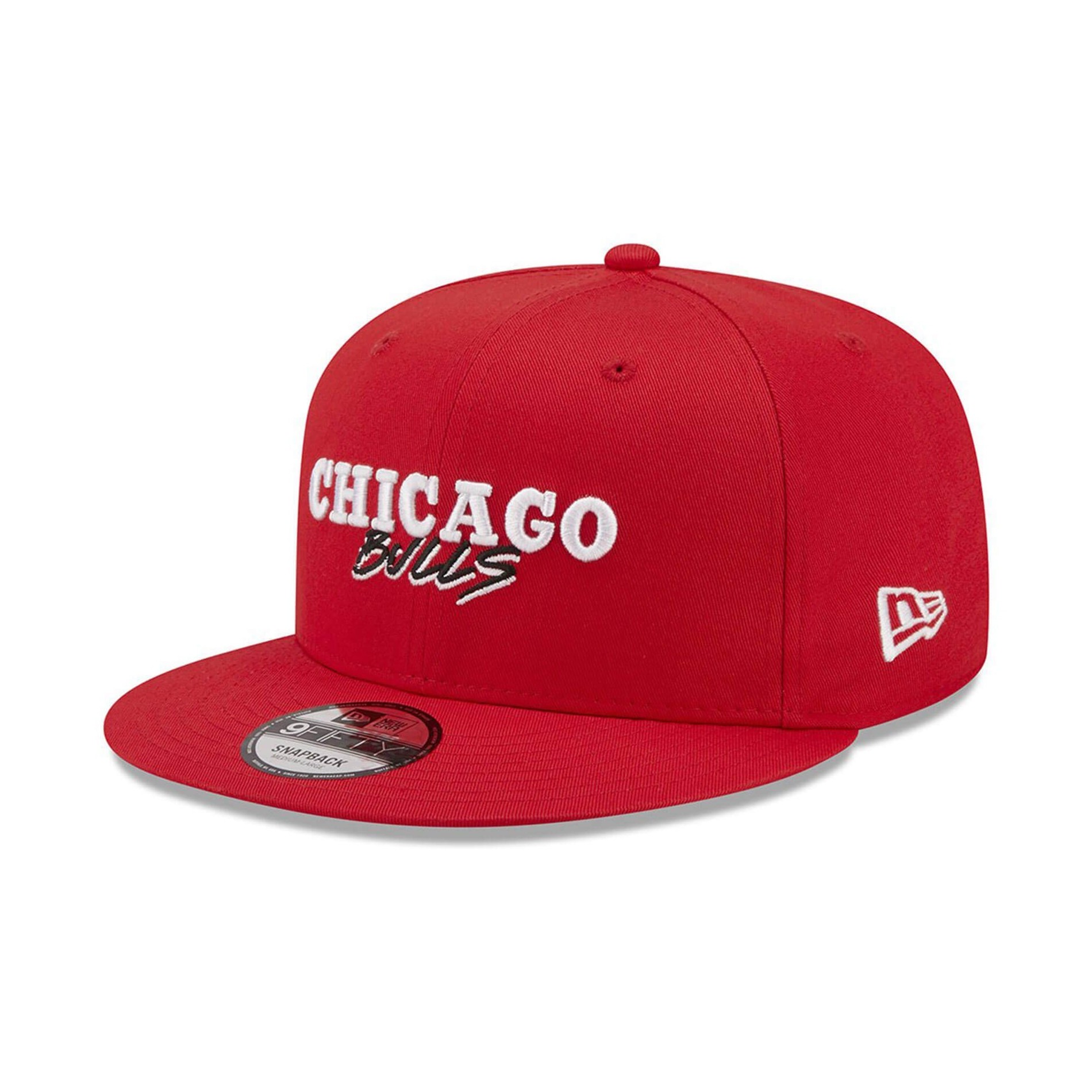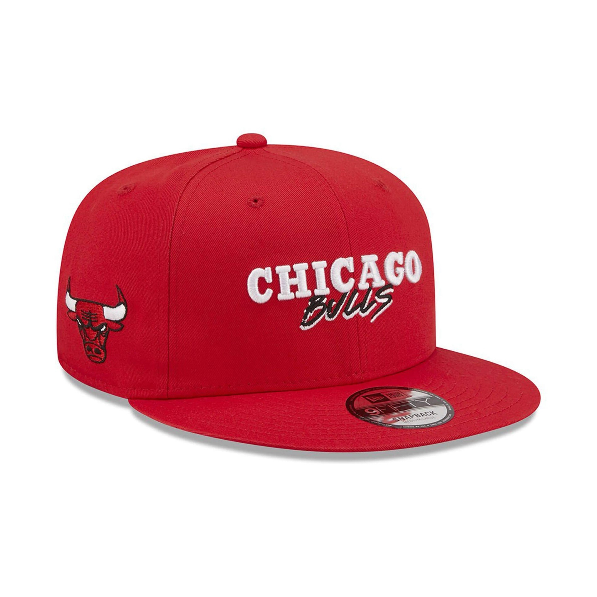 New Era 9FIFTY flat peak cap från Chicago Bulls Script Team NBA-kollektionen, snapbackjusteringssystem, bomullsmaterial med Chicago Bulls logotyp och Bulls logotyp på sidan.