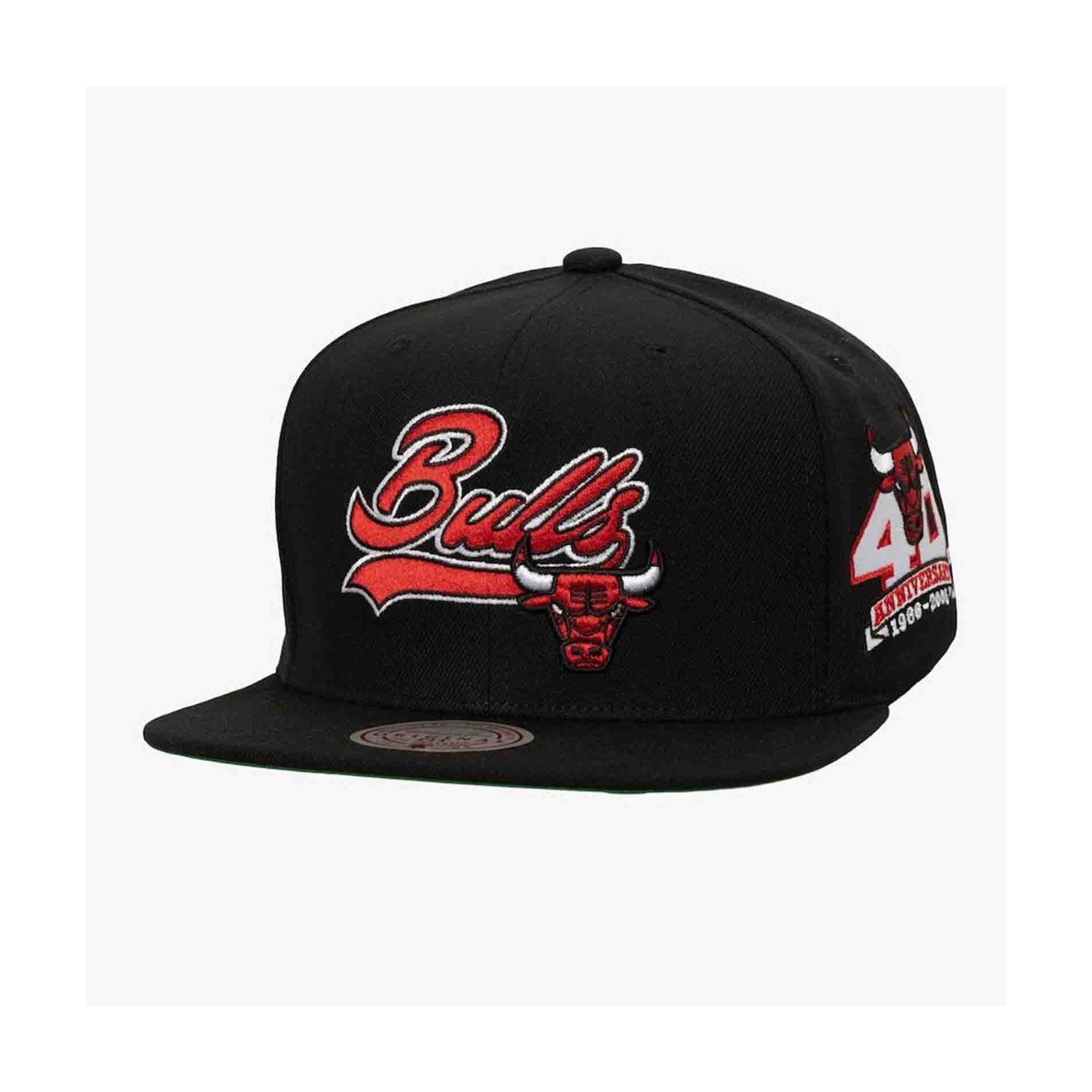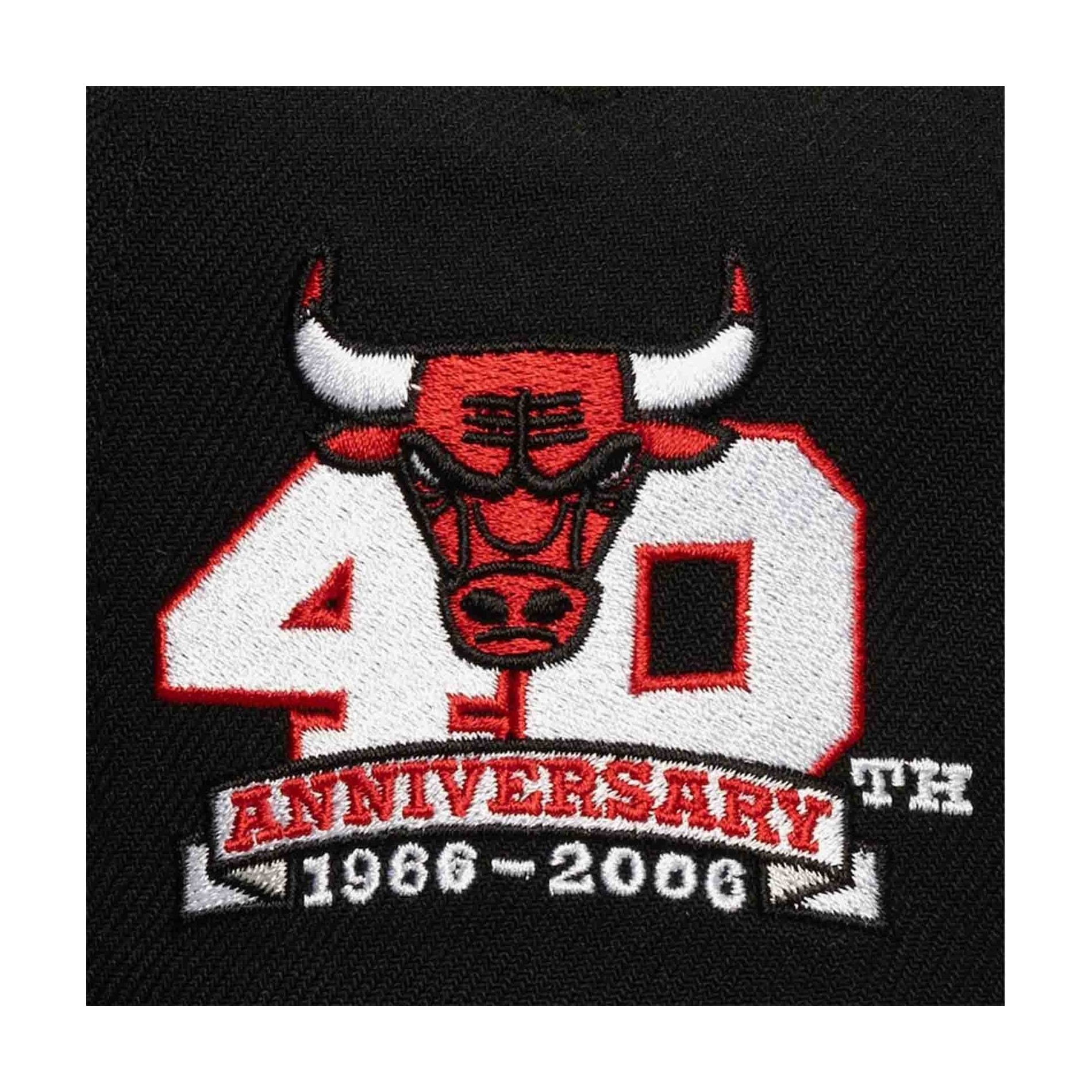 Officiell design: Chicago Bulls-logotyp broderad framtill. 40-årsjubileumslogotyp på sidan.