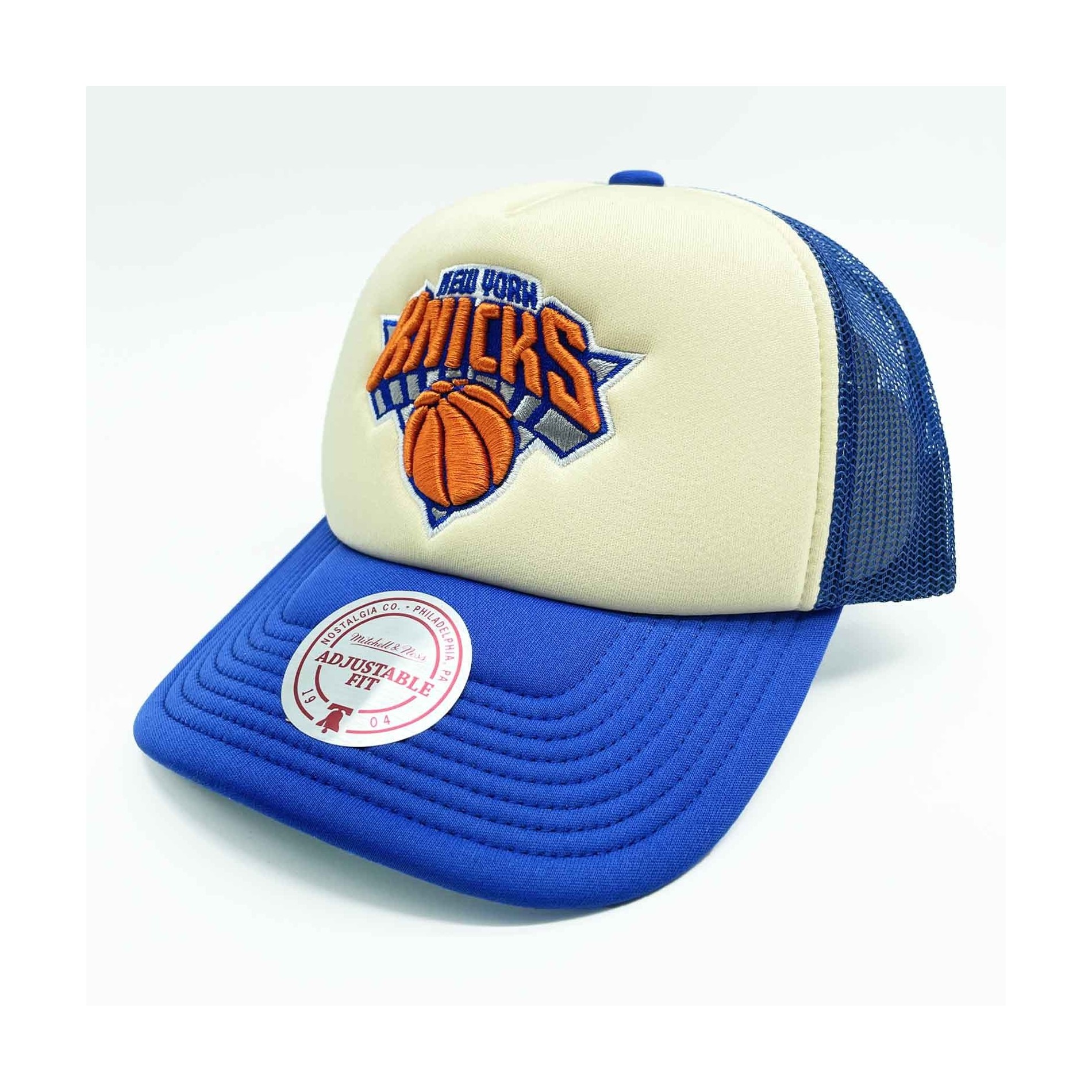 New York Knicks "Vintage Block" NBA Trucker keps - Mitchell & Ness. Strukturerad hög krona, frontpanel och visir i 100% polyesterskum, förböjd visir. Bakre paneler i ventilerande mesh. Broderad Knicks-logotyp (upphöjd + platt). Justerbar snapback-stängning. Unisex-storlek för vuxna. Officiell NBA-licens.
