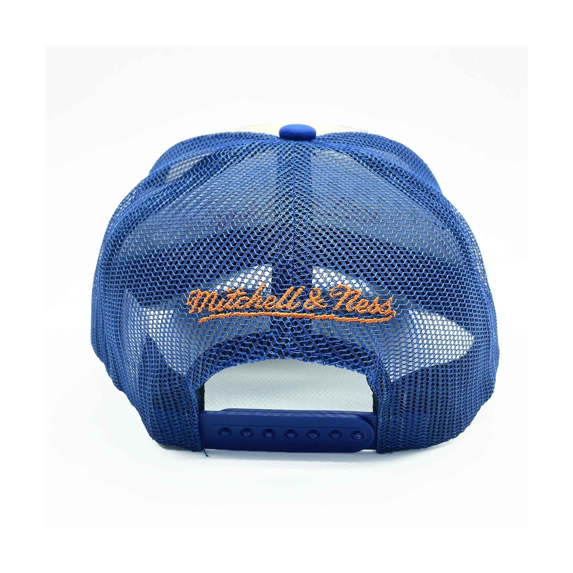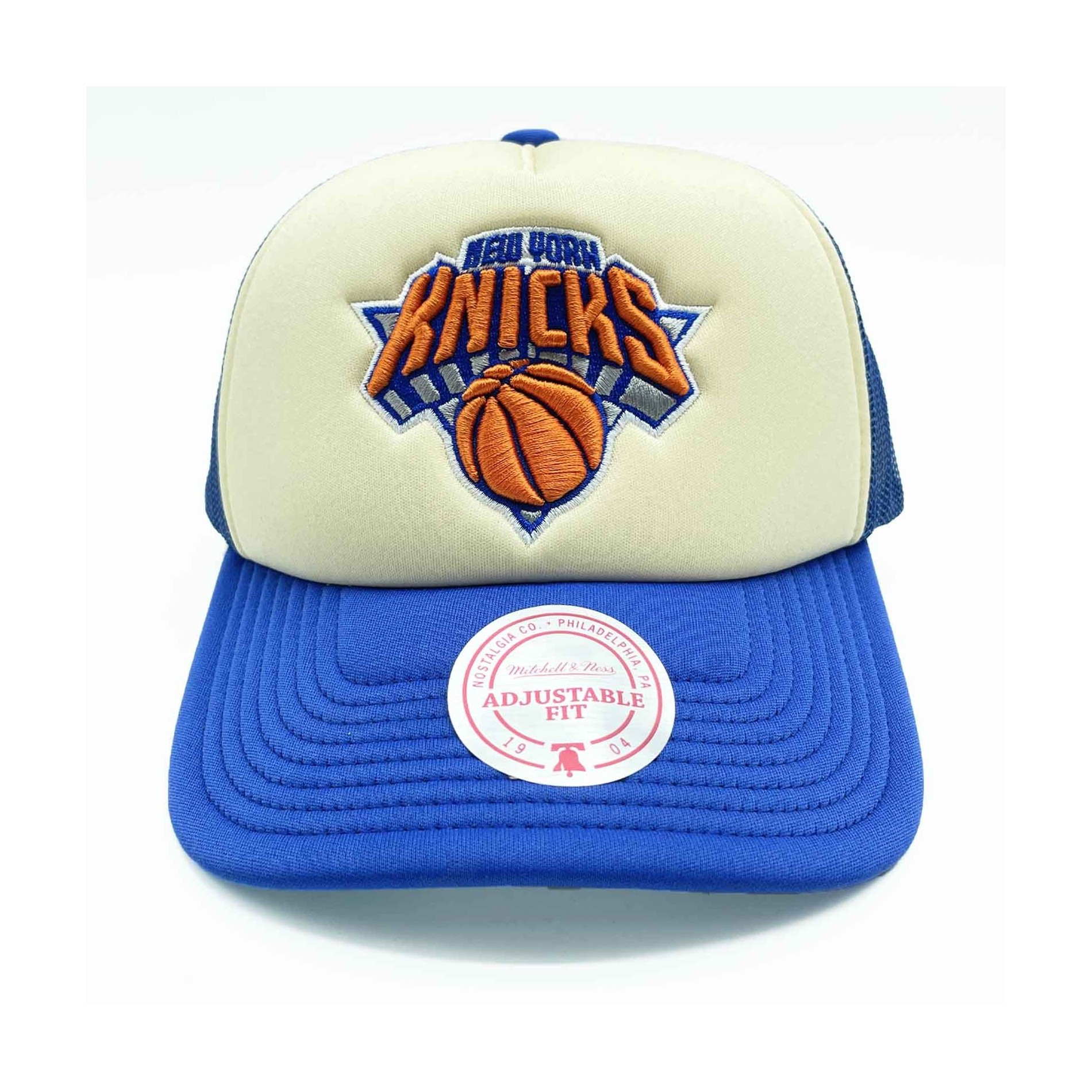 Visa upp New York Knicks med denna Trucker Mousse "Vintage Block" signerad Mitchell & Ness. Silhuetten med hög krona är strukturerad och visiret är förböjt för en retrolook. Frontpanelen (cream/ecru) och visiret i skumplast av 100% polyester ger stöd och komfort, medan bakpanelerna i mjuk mesh (blå) maximerar andningsförmågan. Den broderade Knicks-logotypen i relief + platt (orange/blå) ger en förstklassig finish. Enkel snapback-justering. Officiell NBA-licens.