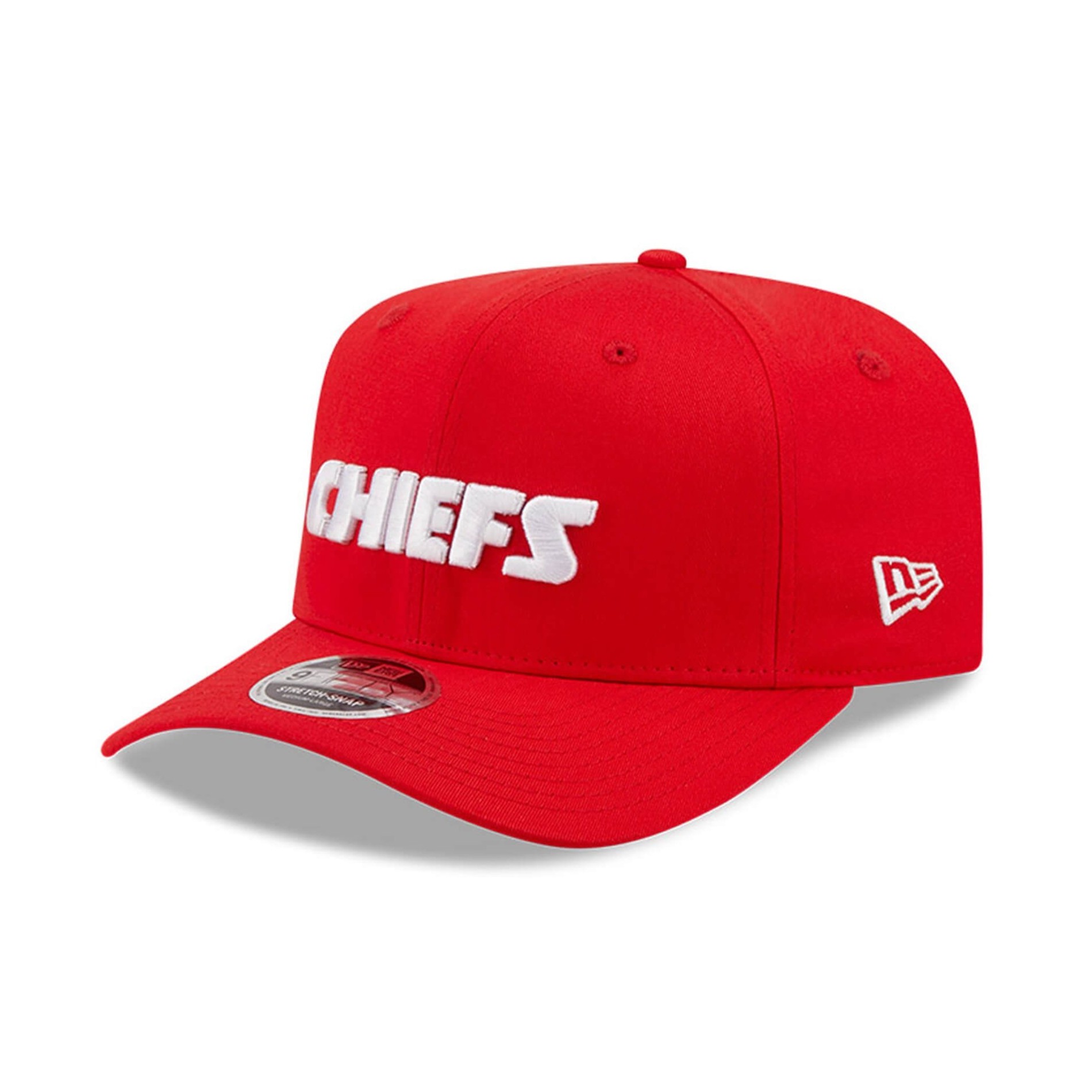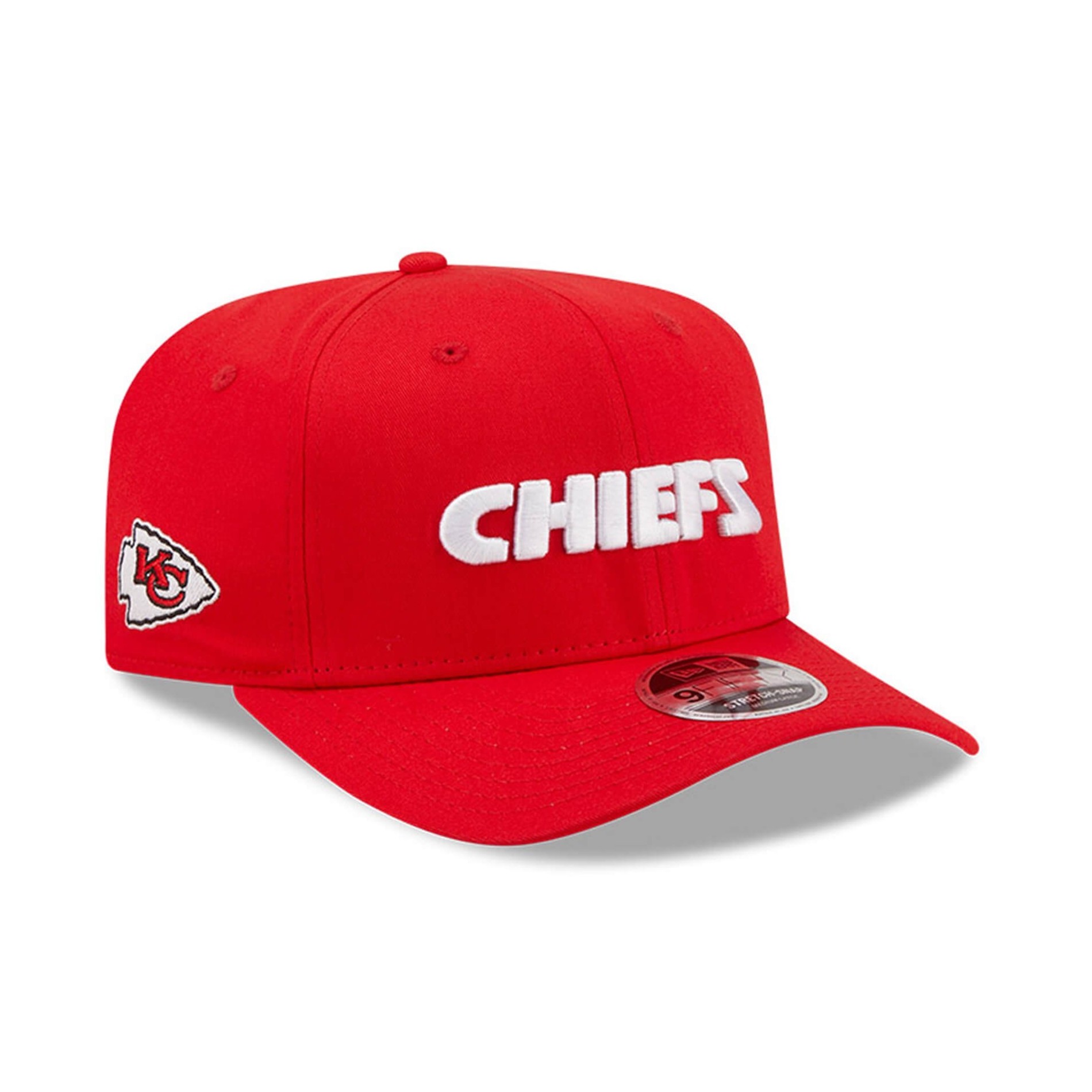 New Era 9FIFTY Kansas Chiefs NFL wordmark cap, snapbackjusteringssystem, bomullsmaterial med Kansas Chiefs-logotyp på sidan och Chiefs-skrift på framsidan.