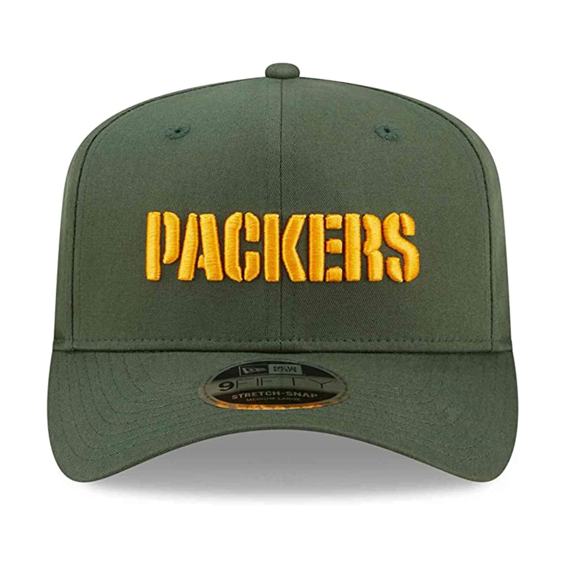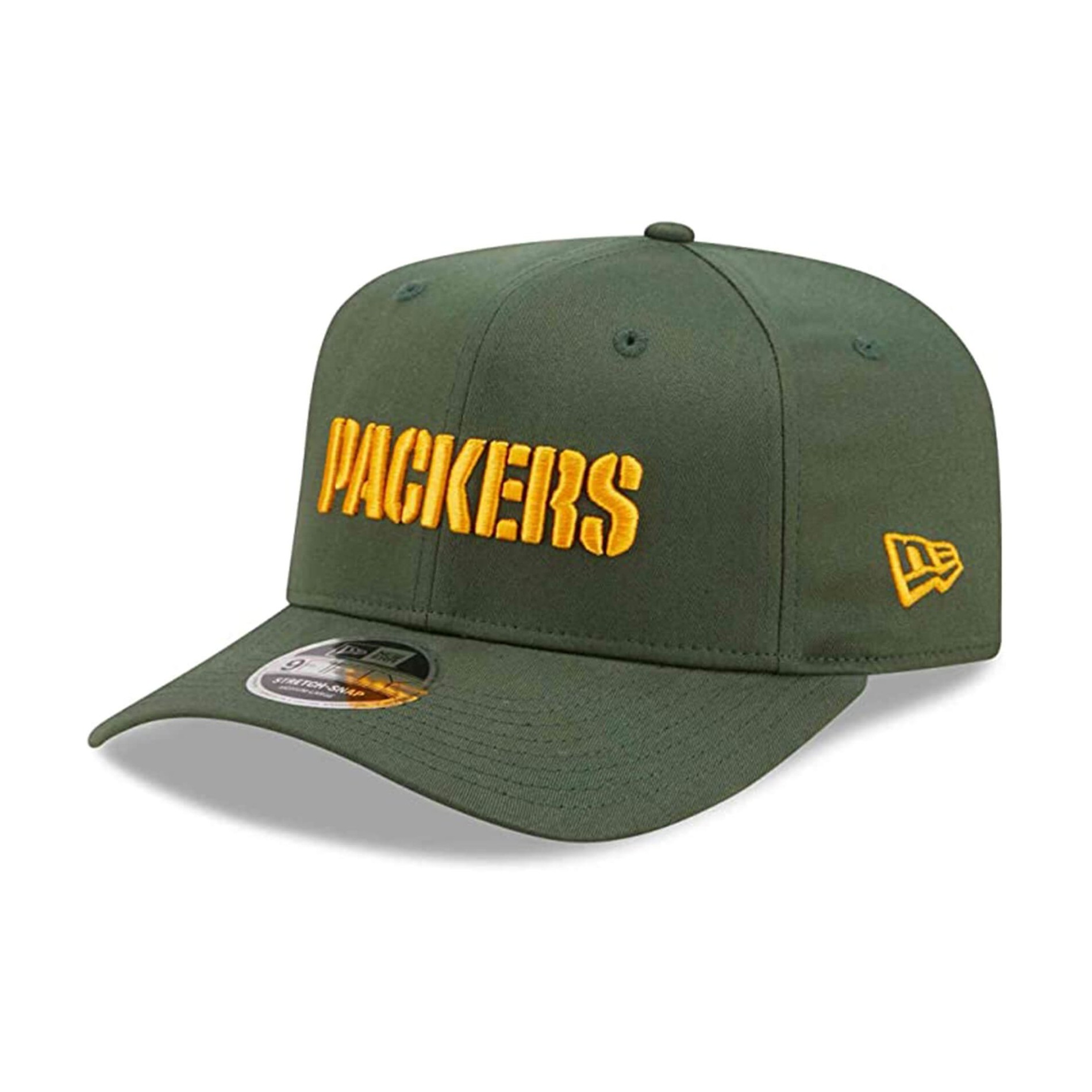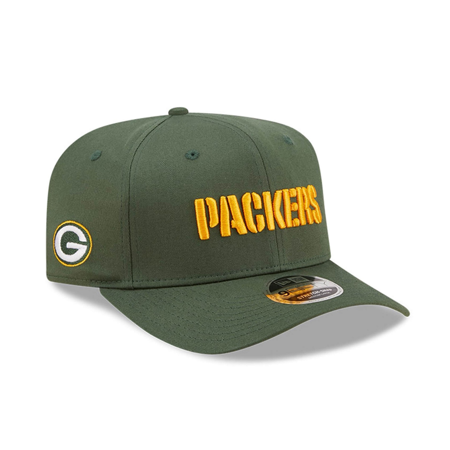 New Era 9FIFTY Green Bay Packers NFL wordmark cap, snapbackjusteringssystem, bomullsmaterial med Green Bay Packers-logotyp på sidan och Packers-bokstäver på framsidan.