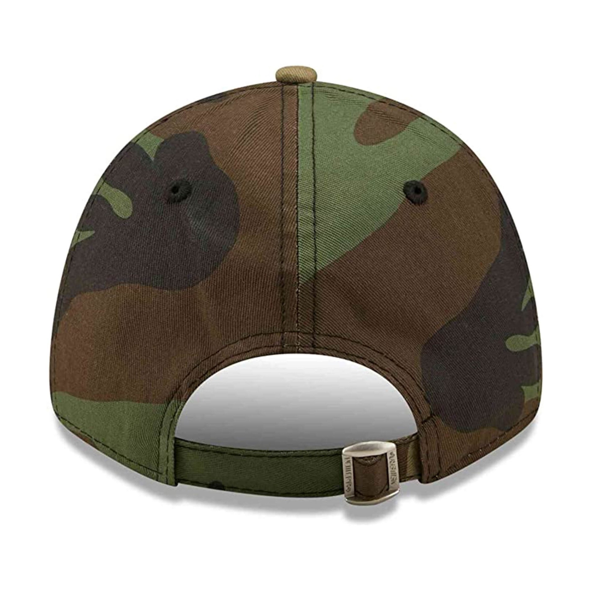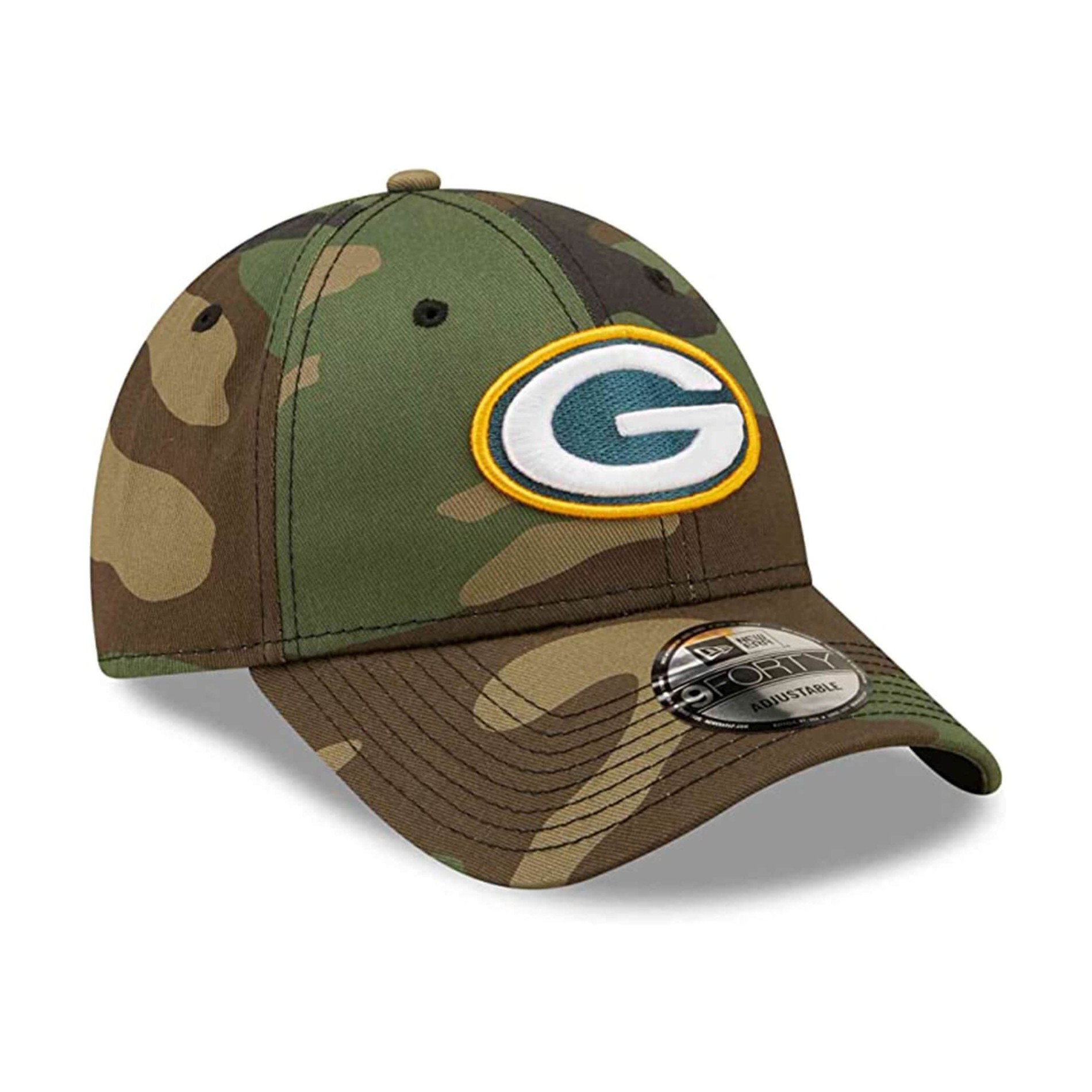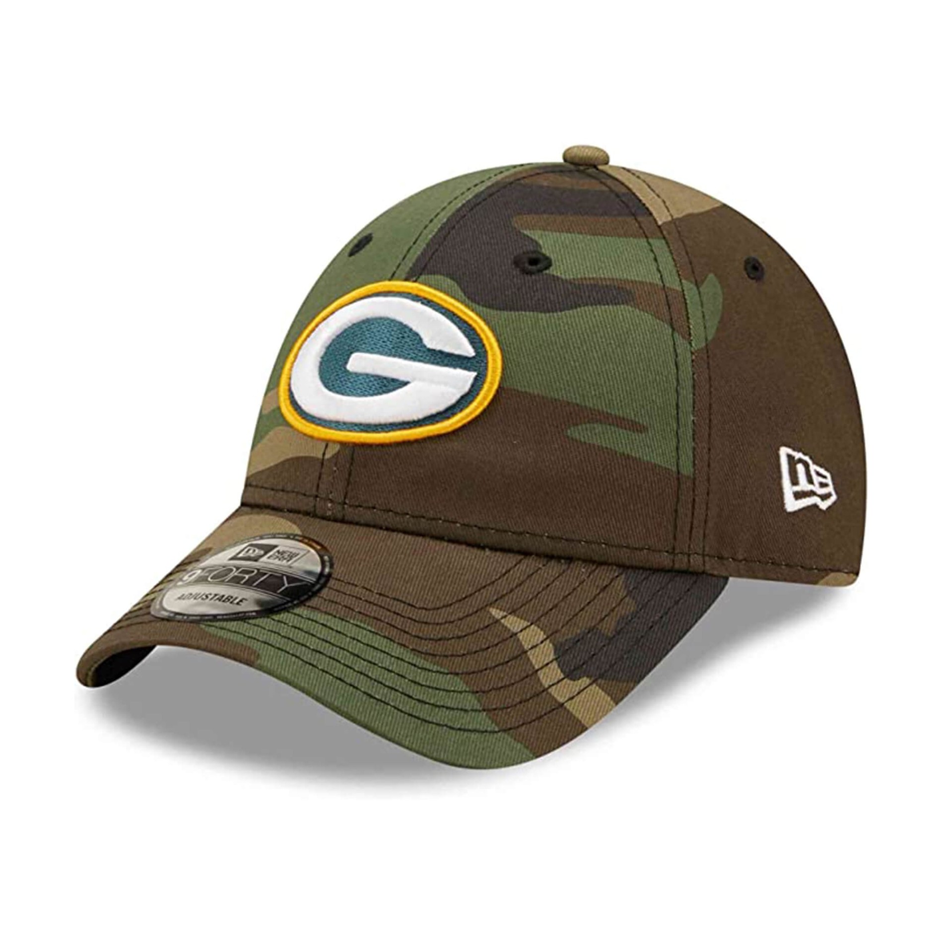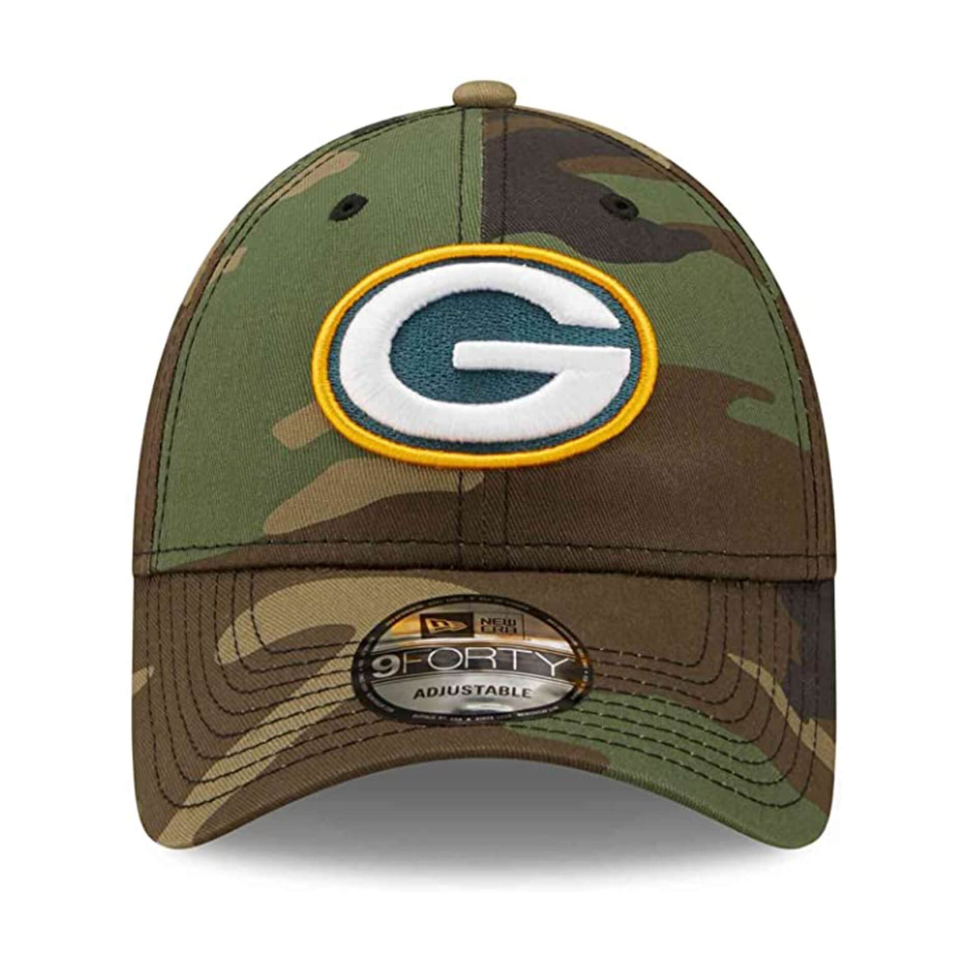 New Era 9FORTY Strapback Green Bay Packers Official License NFL Woodland Camo Cap, broderad New Era flagga framsidan laget logotyp på vänster sida med strukturerad krona, justerbar rem och böjd visir i 100% bomull
