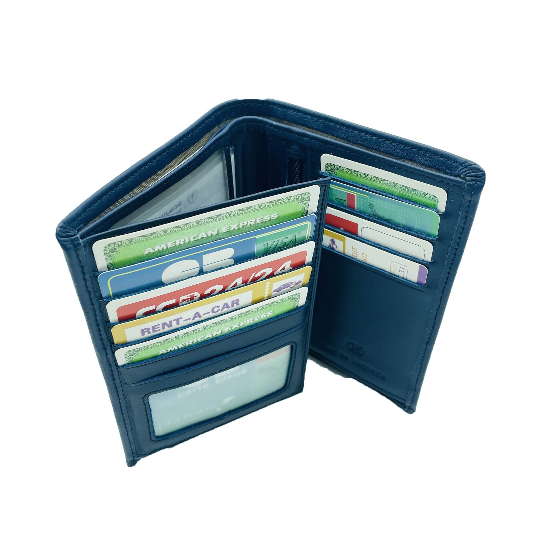 Den består av 9 kortfack, 2 påsatta fickor, 1 väska med dragkedja och en separation,2 genomskinliga vyer (ID-kort, körkort ....) och 2 fack för anteckningar.