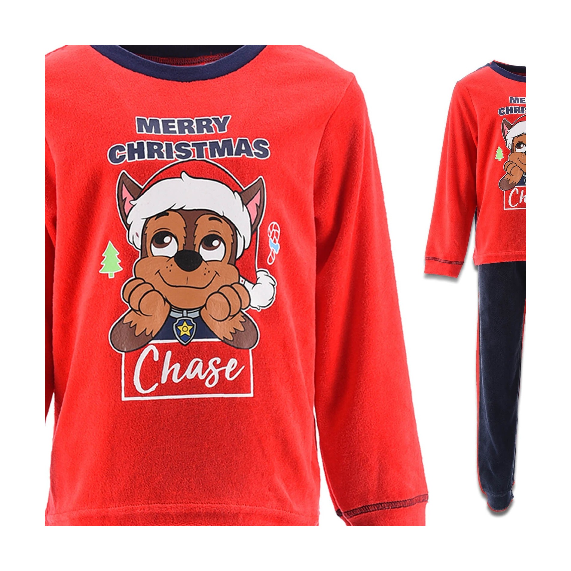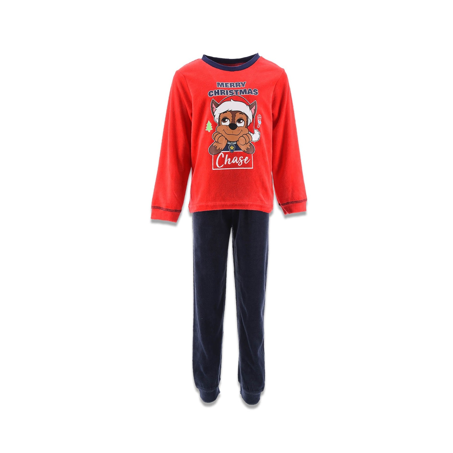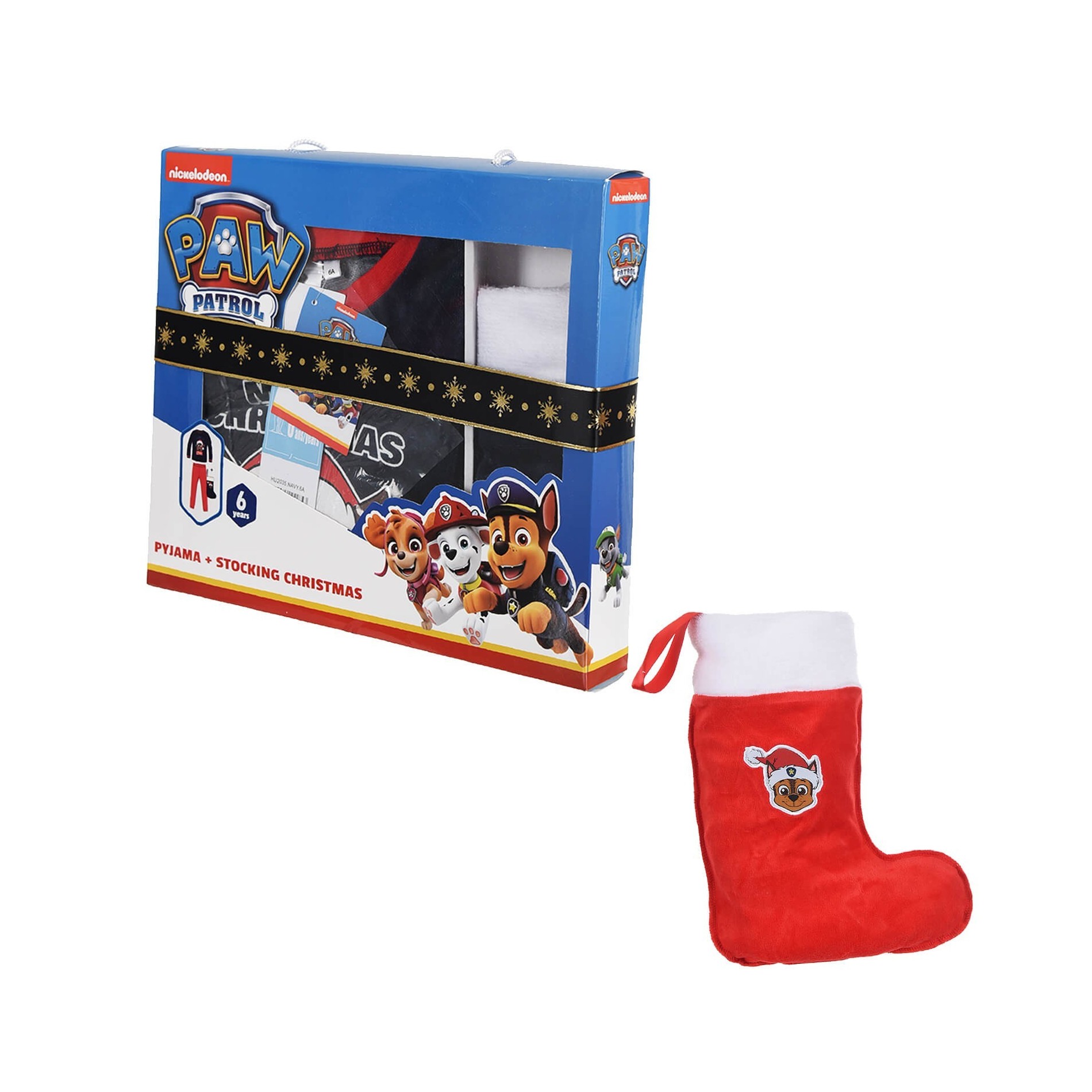 Pojks Patrol Winter Velour Pajama Set för vintern. De är varma, mjuka och mycket bekväma, med texten "Merry CHrismas Chase". Presenteras i en presentask med en fleecestrumpa för att ge bort i present. 75% bomull, 25% polyester