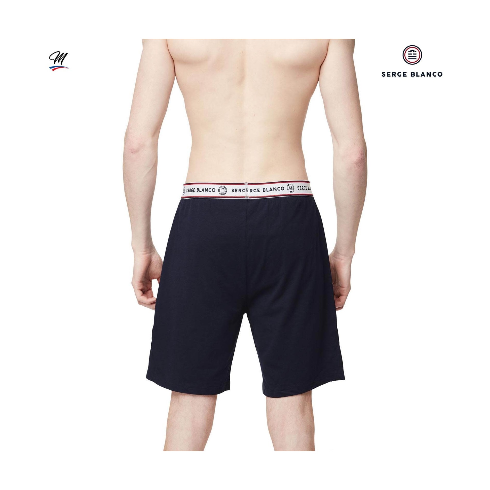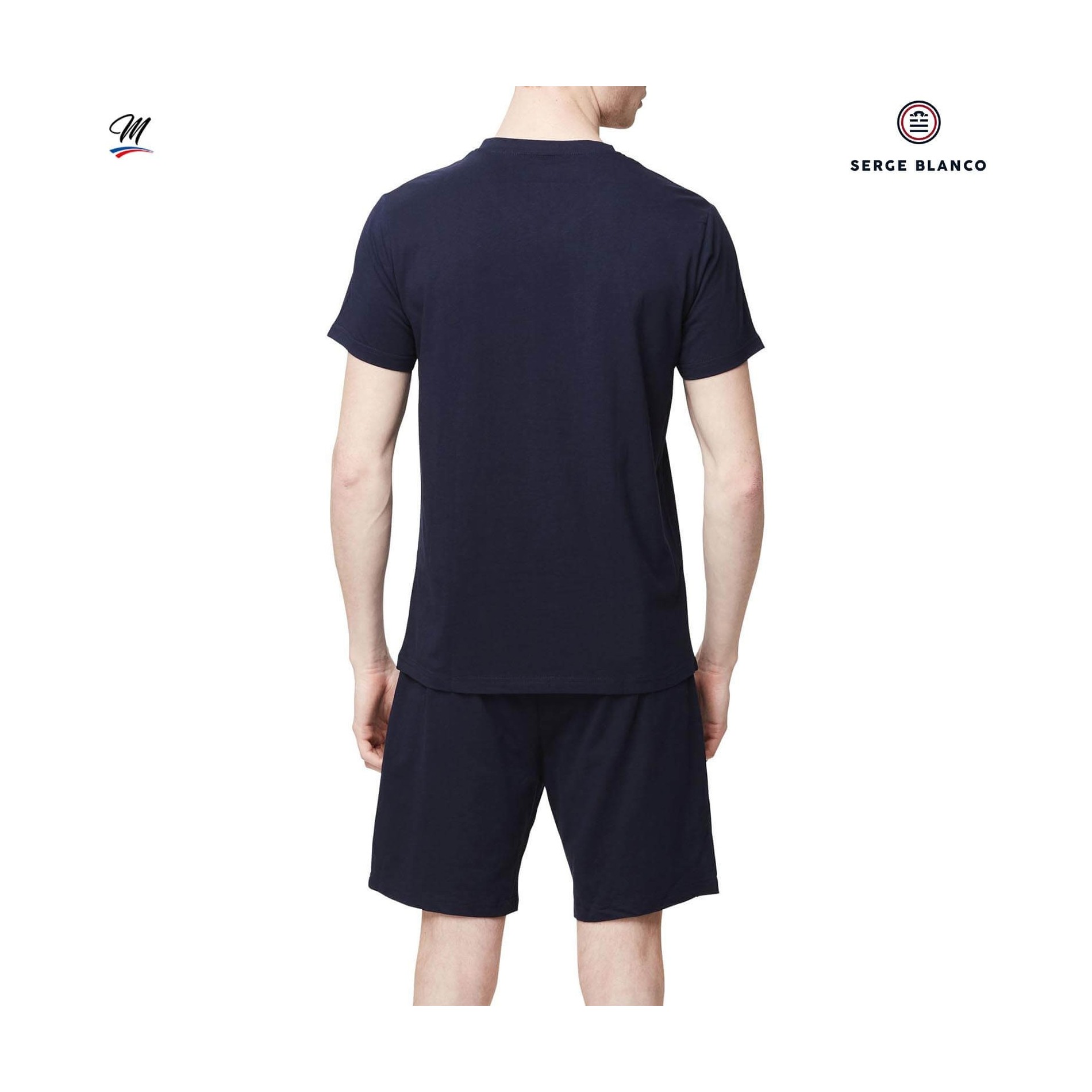 Består av en kortärmad T-shirt och shorts med elastiskt bälte Serge Blanco