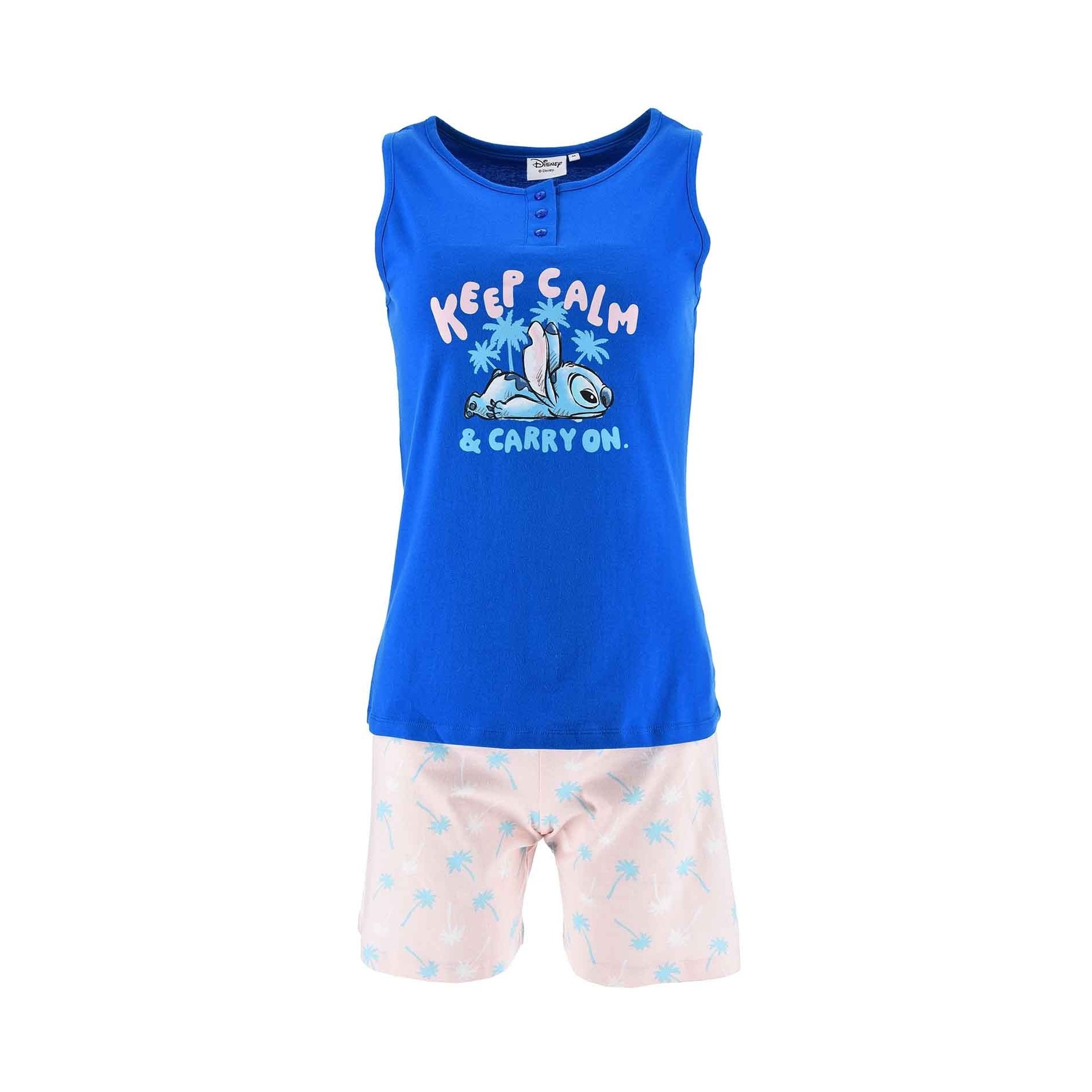 Denna Disney-pyjamas består av en ärmlös topp med en bedårande illustration av Stitch med slogan "Keep Calm & Carry On" och matchande shorts tryckta med små palmer. Finns i två klara färger: blå topp med rosa shorts eller rosa topp med blå shorts, för att matcha alla dina önskemål!