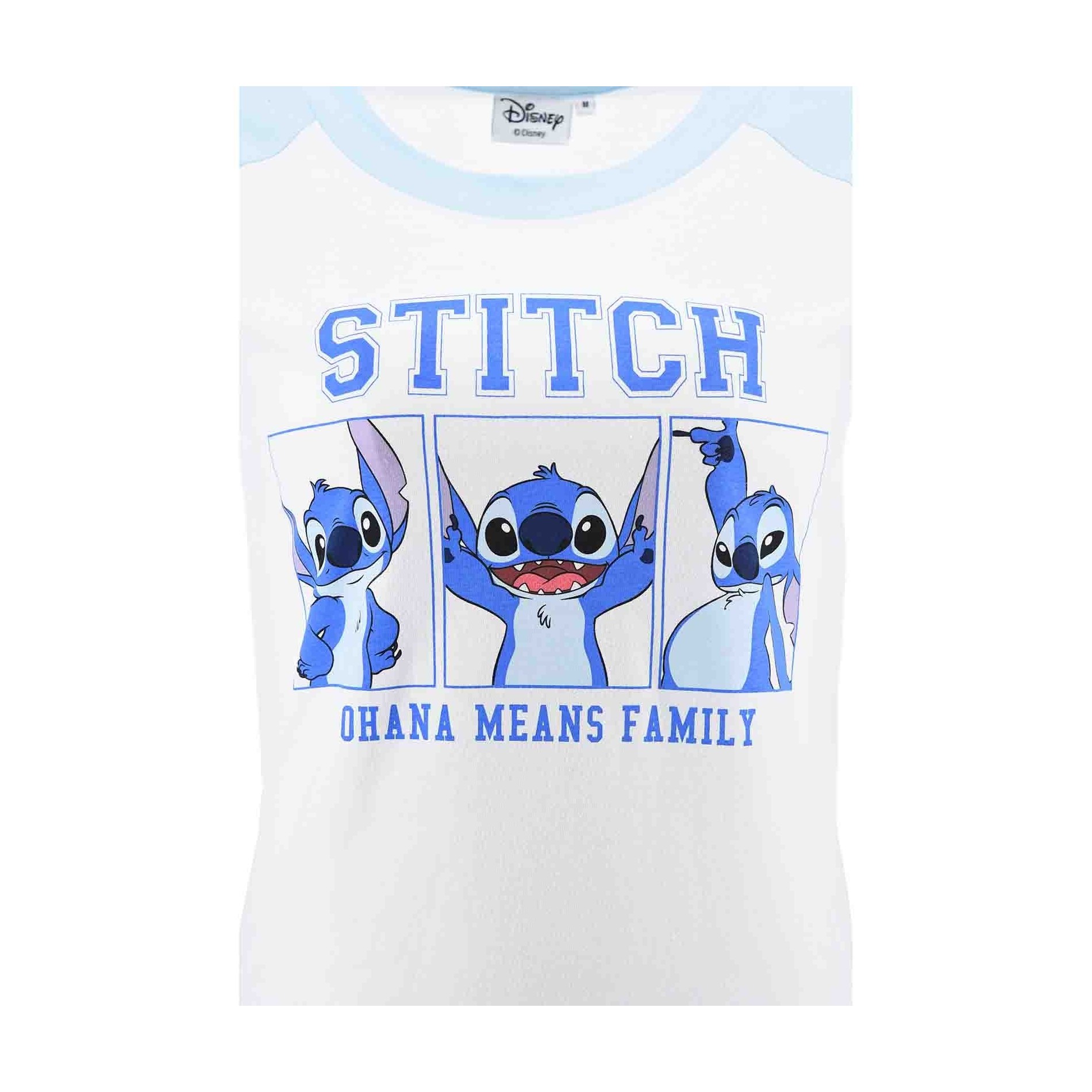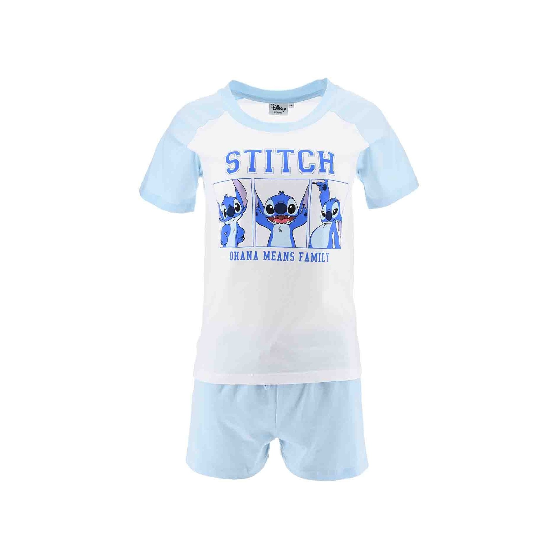 Stitch kort pyjamas för kvinnor - Ohana Means Family, 100% mjuk, lätt bomull. T-shirt med tryck + ljusblå shorts. Officiell Disney-produkt, perfekt för nätter med komfort och skoj!