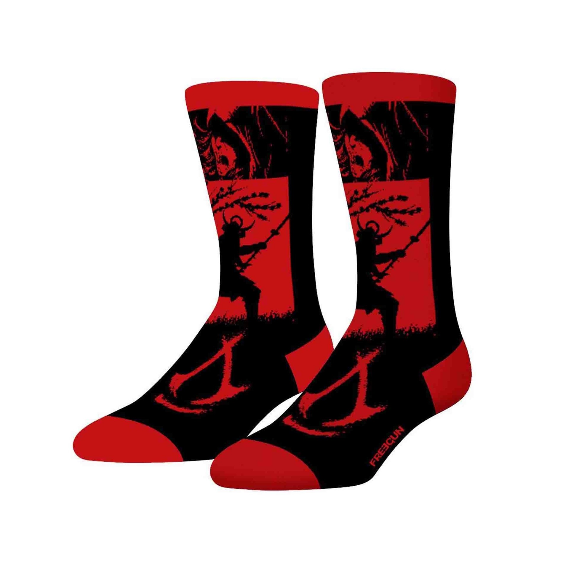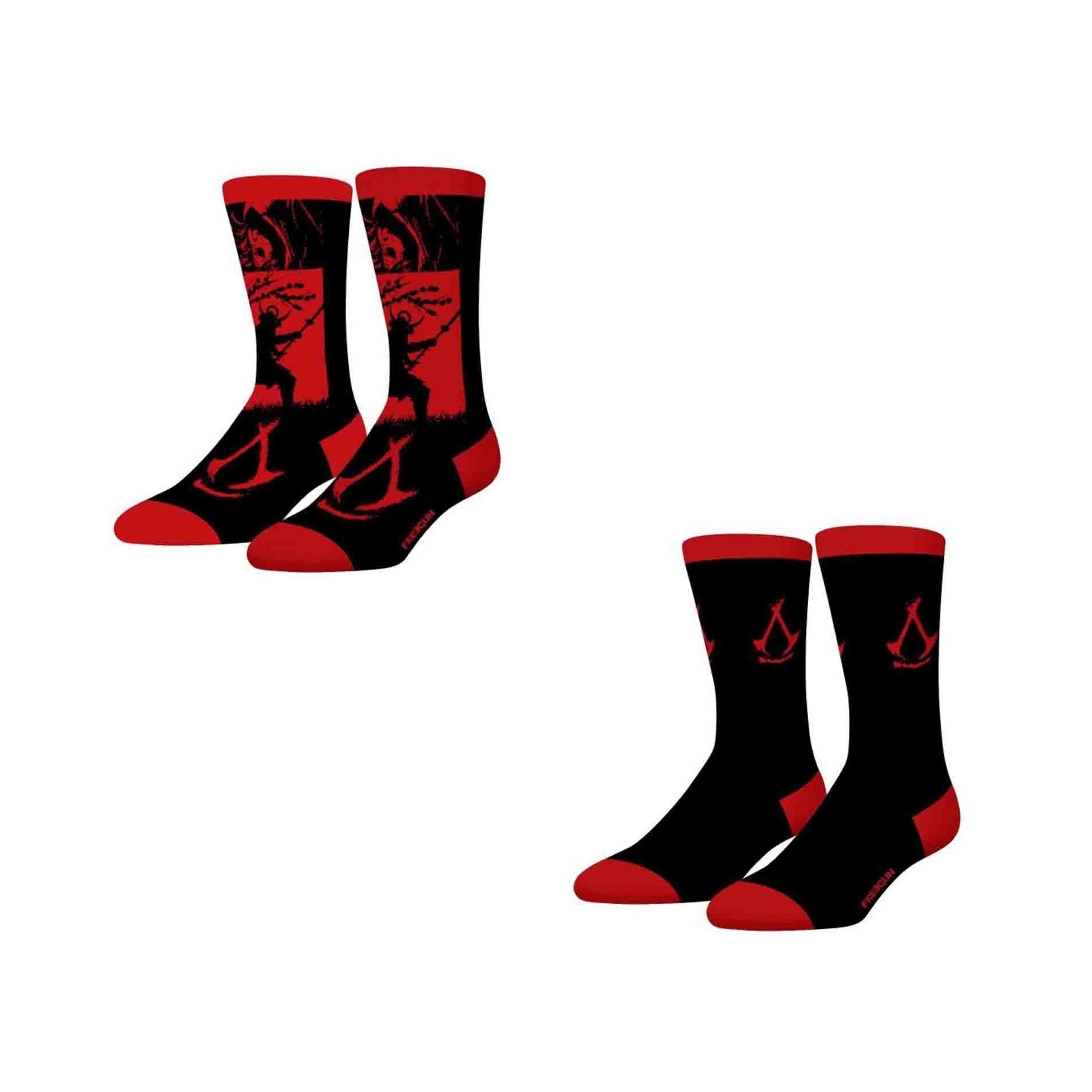 Set med 2 par strumpor, det ena setet i rött med Yasuke-karaktären, det andra paret med Assassin's Creed-logotypen, det andra setet i grått med Naoe-karaktären på ena paret och det andra paret i enfärgat grått