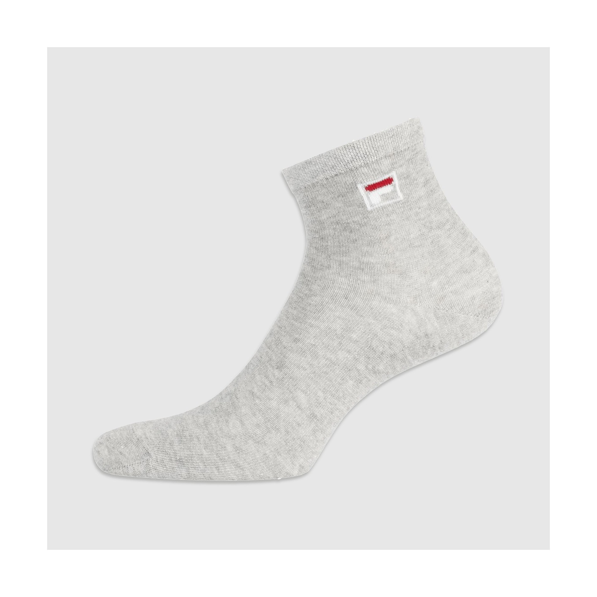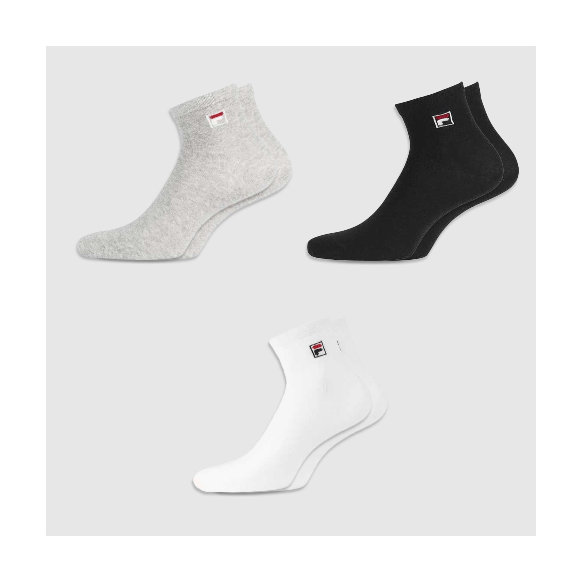 Kvarterssockor, detta set med 3 par FILA bomullsstrumpor är verkligen en klassiker, mycket bekväma, dessa strumpor är i enfärgade färger Vit Svart och Grå med logotypen broderad på vristen